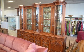 Lot 1 - 20 : Vitrinekast, eiken Mechelse, inbouwoven, ziekenhuisbed, flatscreen tv, enz