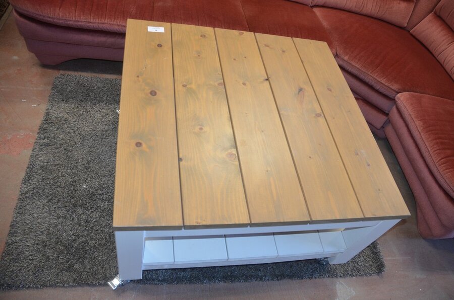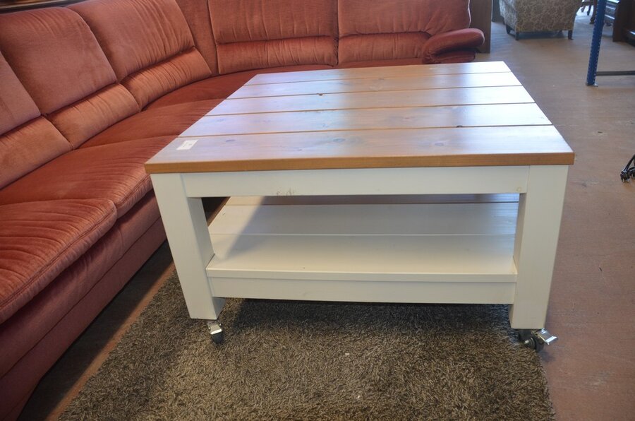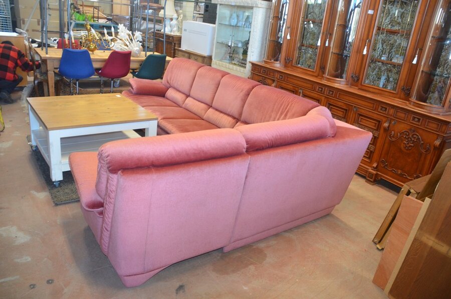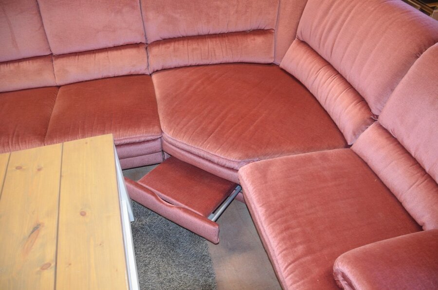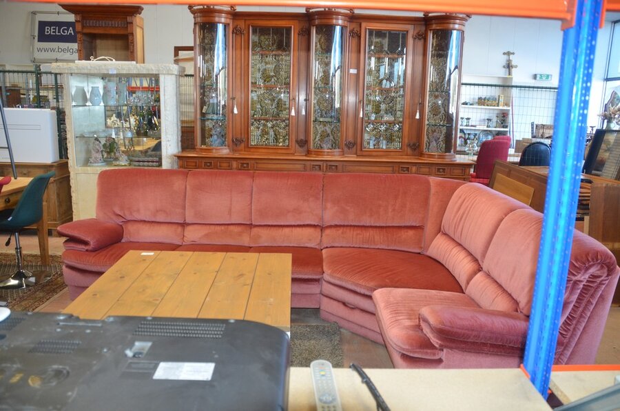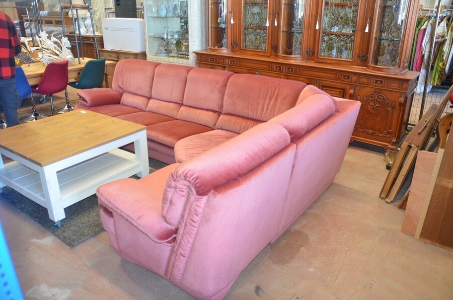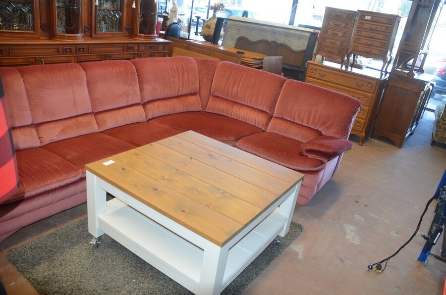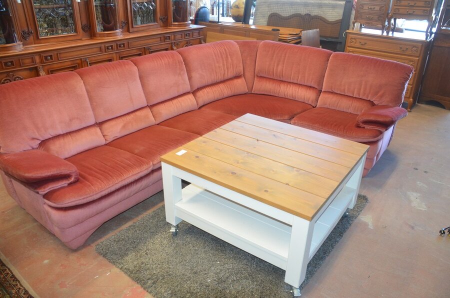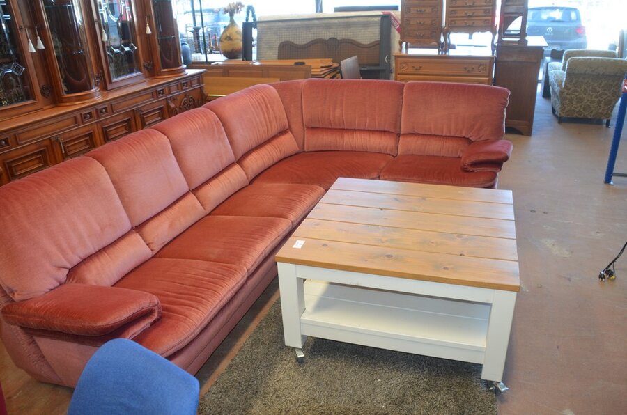 Rose stoffen hoeksalon afm. 300x185, wit houten salontafel bruin houten blad op wielen afm. 100x100, bruin vloerkleed afm. 165x120