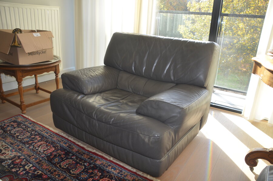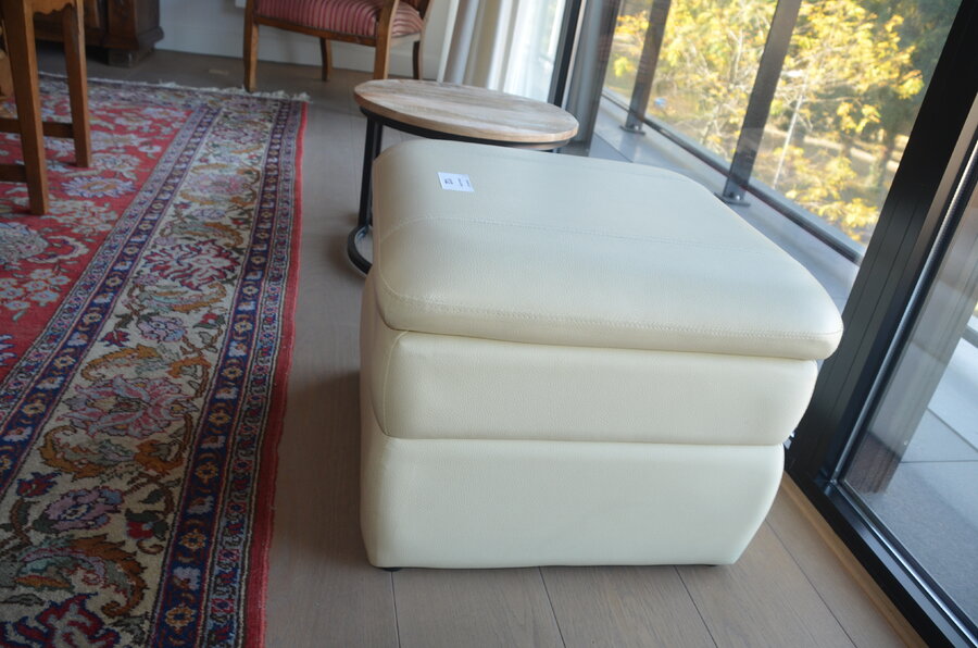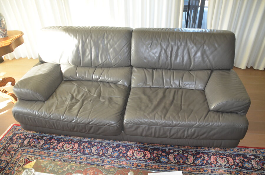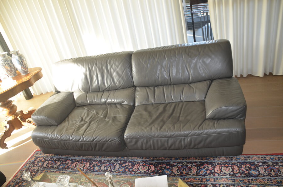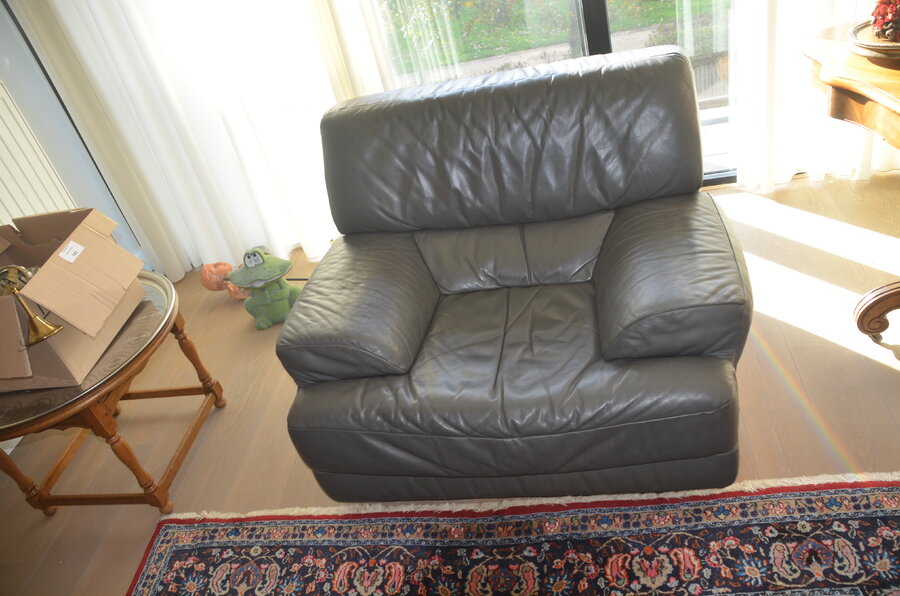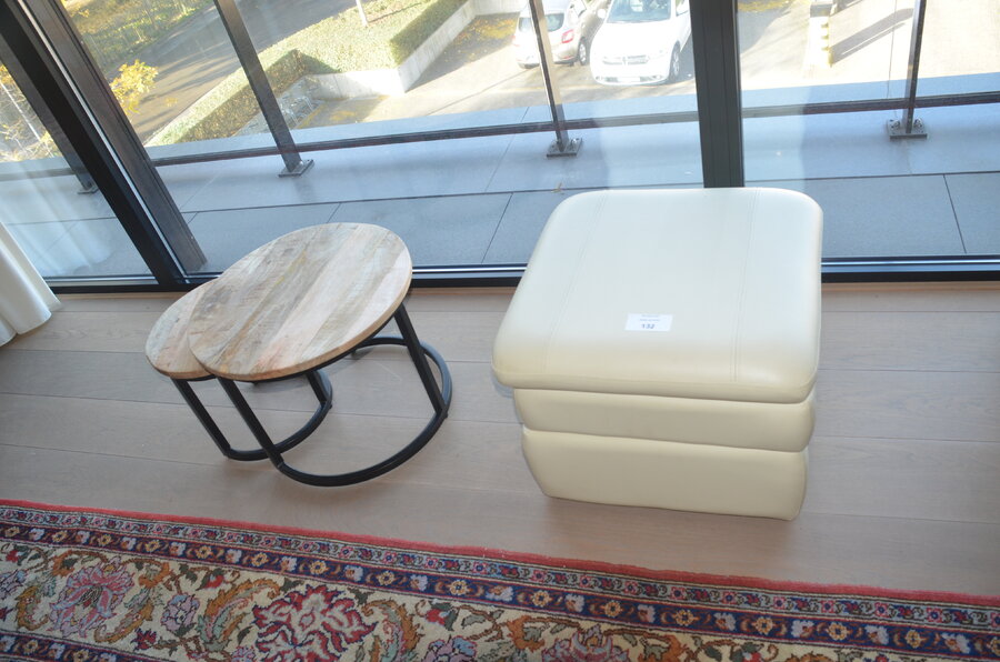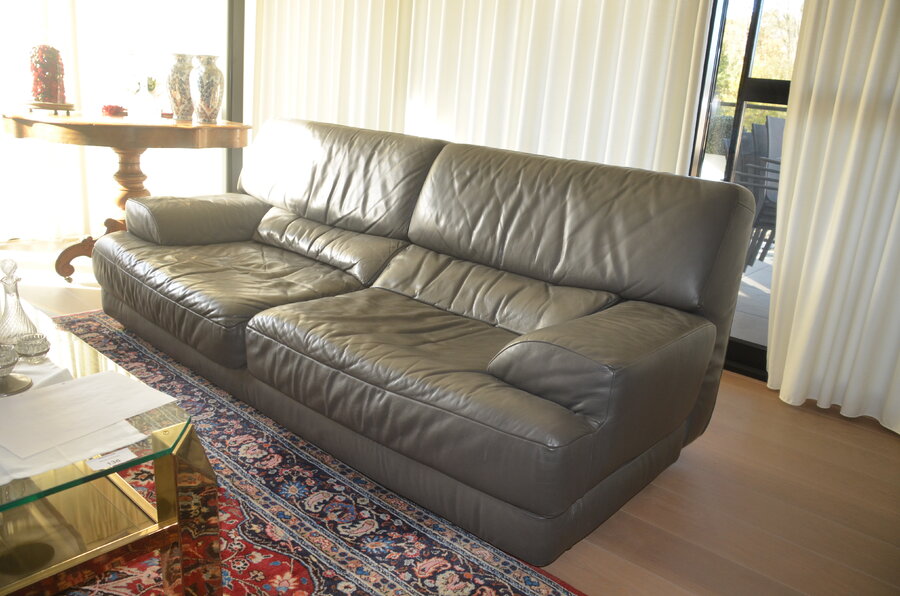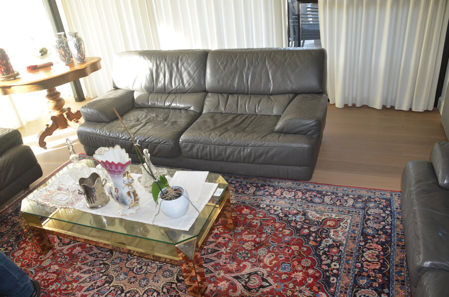 Opazetel, beige lederen poef, 2 ronde bijzettafeltjes, moderne grijs lederen salon bestaande uit 3-2-1 zit, moderne rechthoekige glazen salontafel, oosters tapijt 3,50x2,50 , out tafeltje op rolvoet
