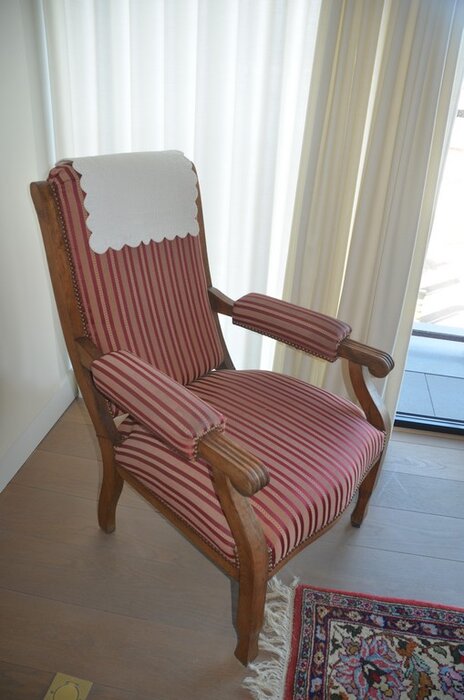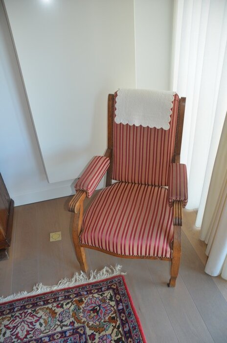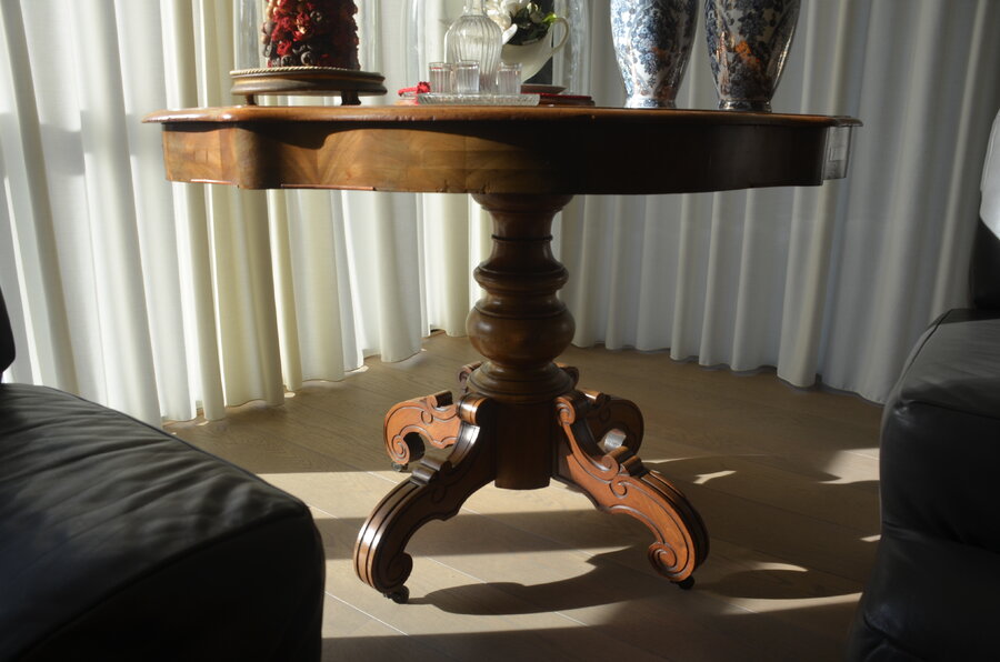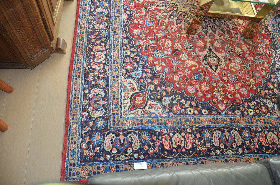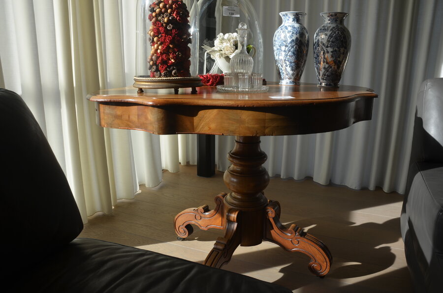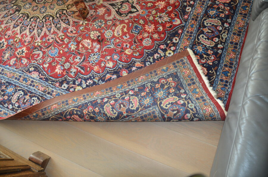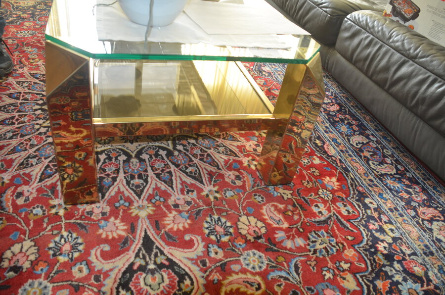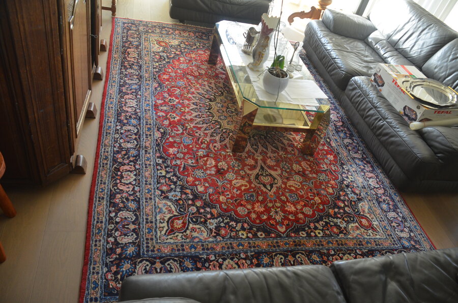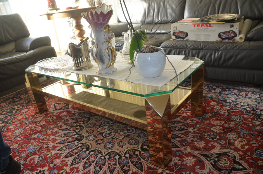 Opazetel, beige lederen poef, 2 ronde bijzettafeltjes, moderne grijs lederen salon bestaande uit 3-2-1 zit, moderne rechthoekige glazen salontafel, oosters tapijt 3,50x2,50 , out tafeltje op rolvoet