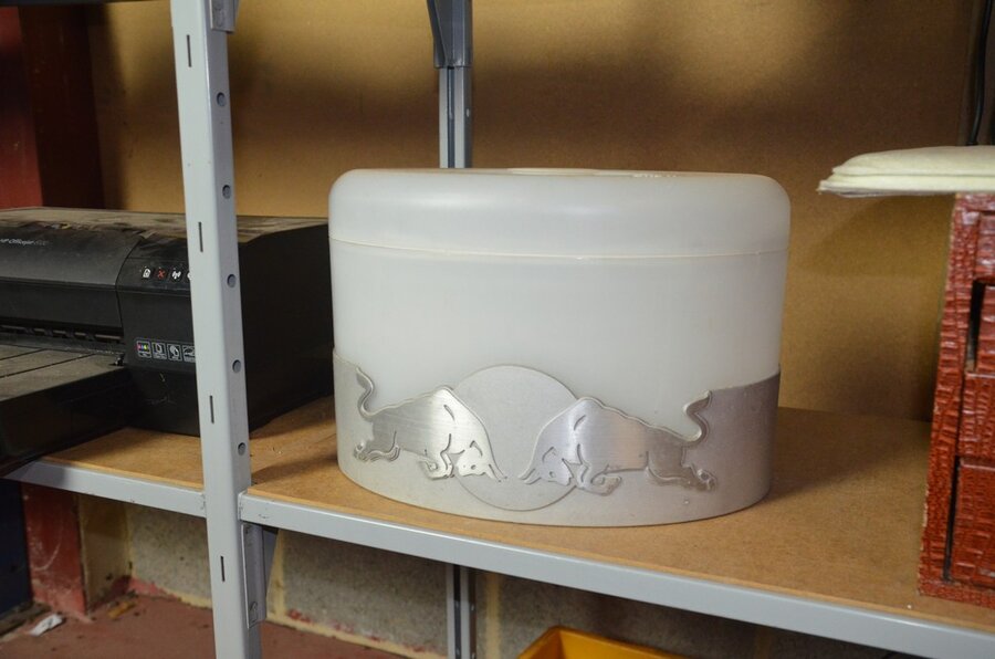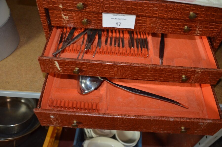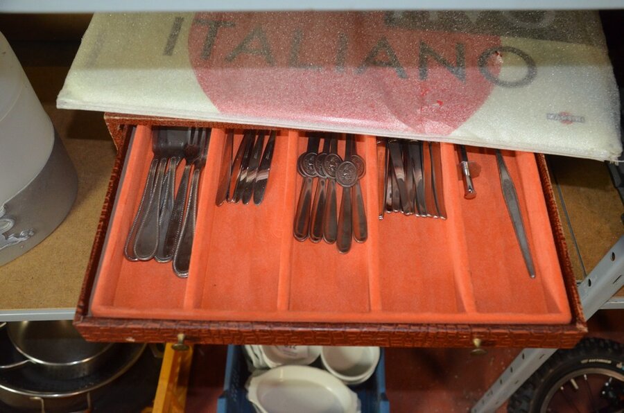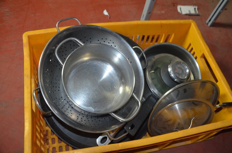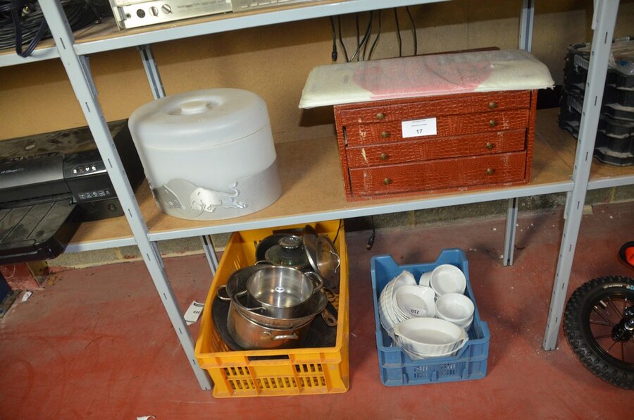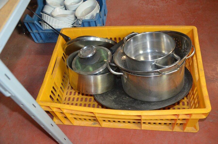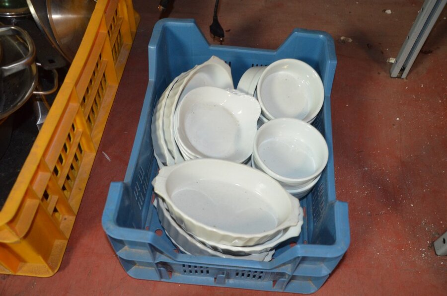 Bestekkoffer , 16 diverse ovenschotels, partij kookpotten, ijsemmer REDBULL