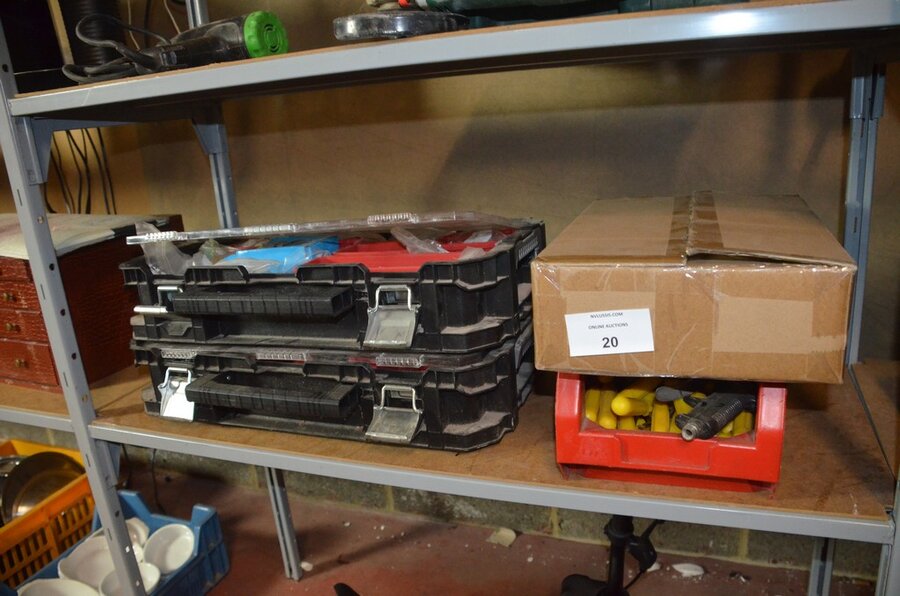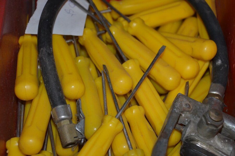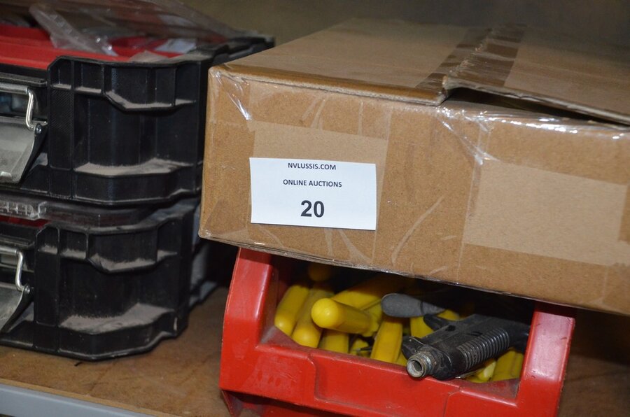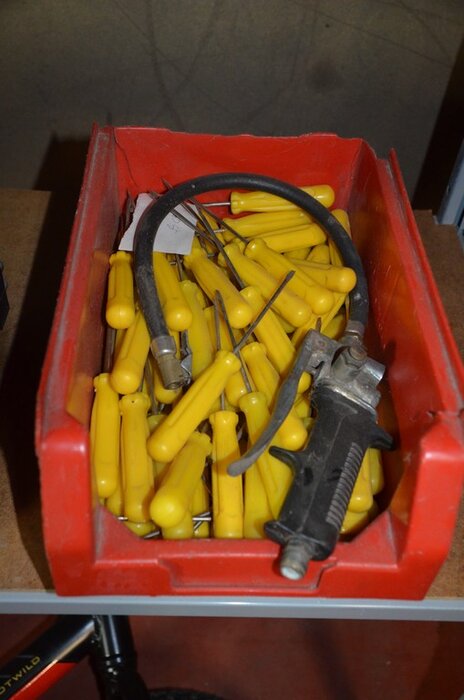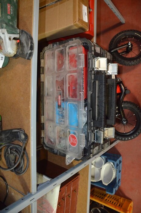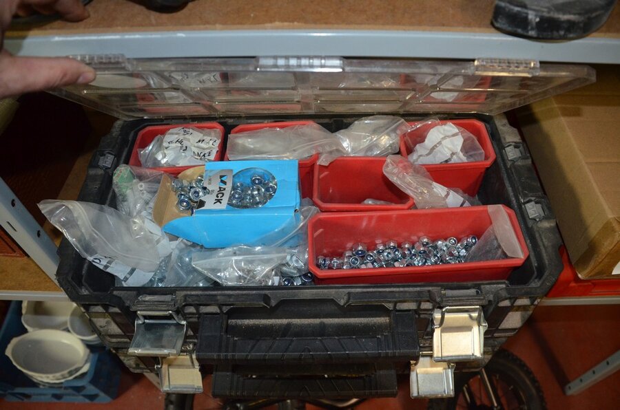 Pvc bak met platte schroevendraaiers, doos met 100 paklijstenenveloppen, 2-delige pvc vakken kist KETER gevuld met moeren en bouten