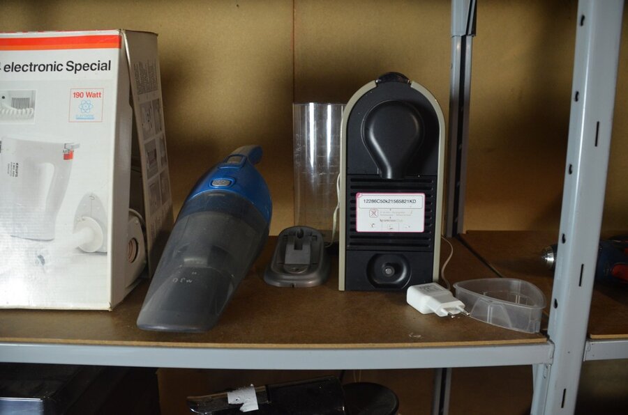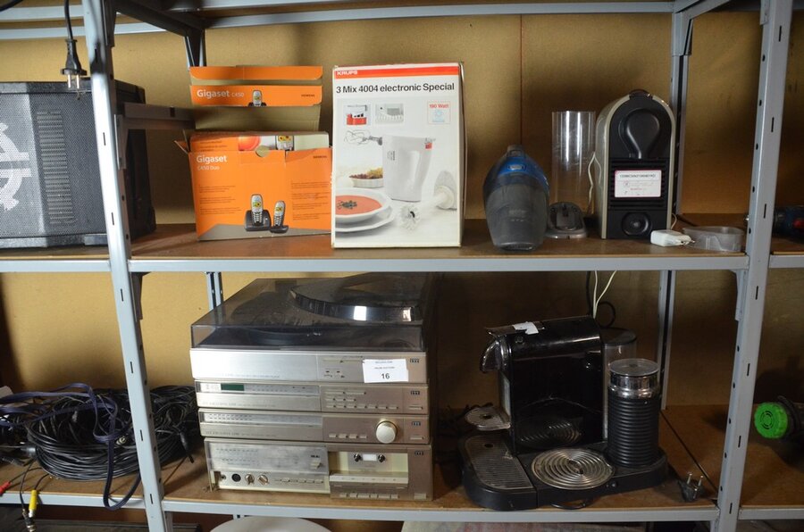 Steroketen ITT bestaande uit platenspeler, versterker, tuner, cassettespeler, koffiemachine NESPRESSO magimix, koffiemachine KRUPS nespresso (niet compleet), kruimeldief BLACK&DECKER met lader, mixer KRUPS, draadloze telefoons SIEMENS gigaset C450