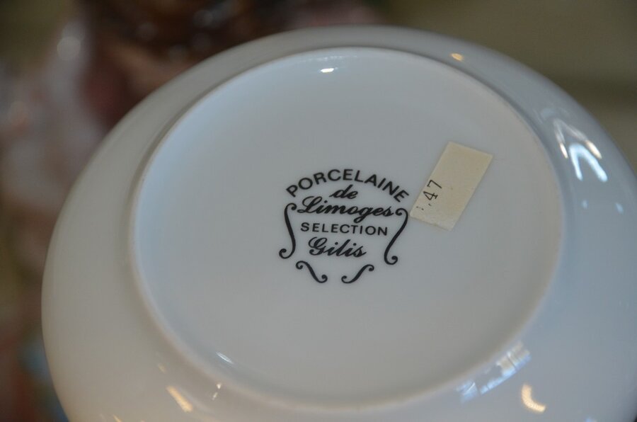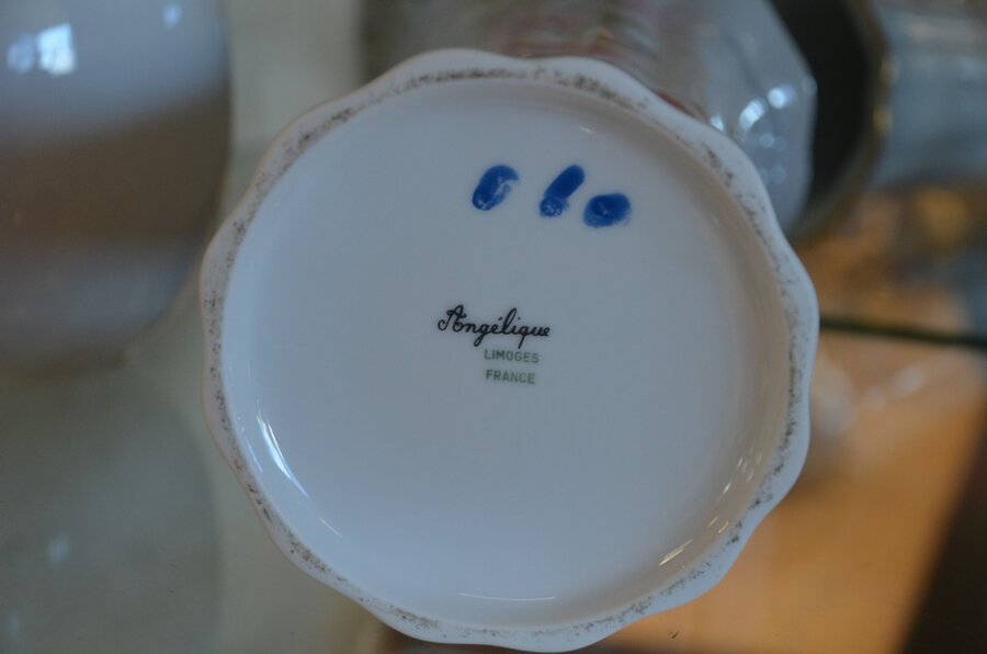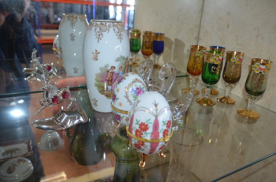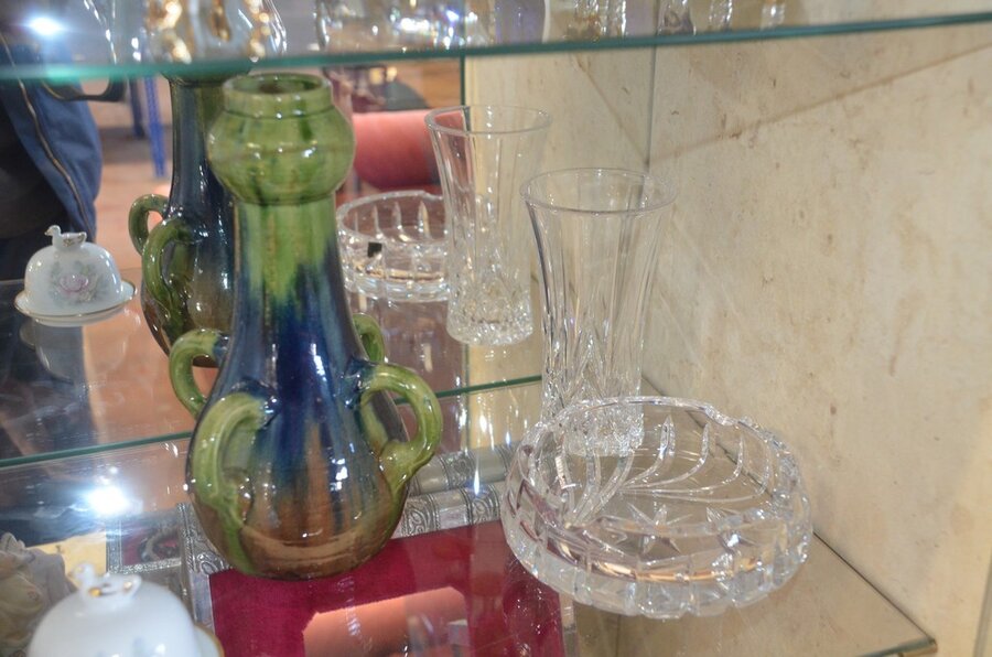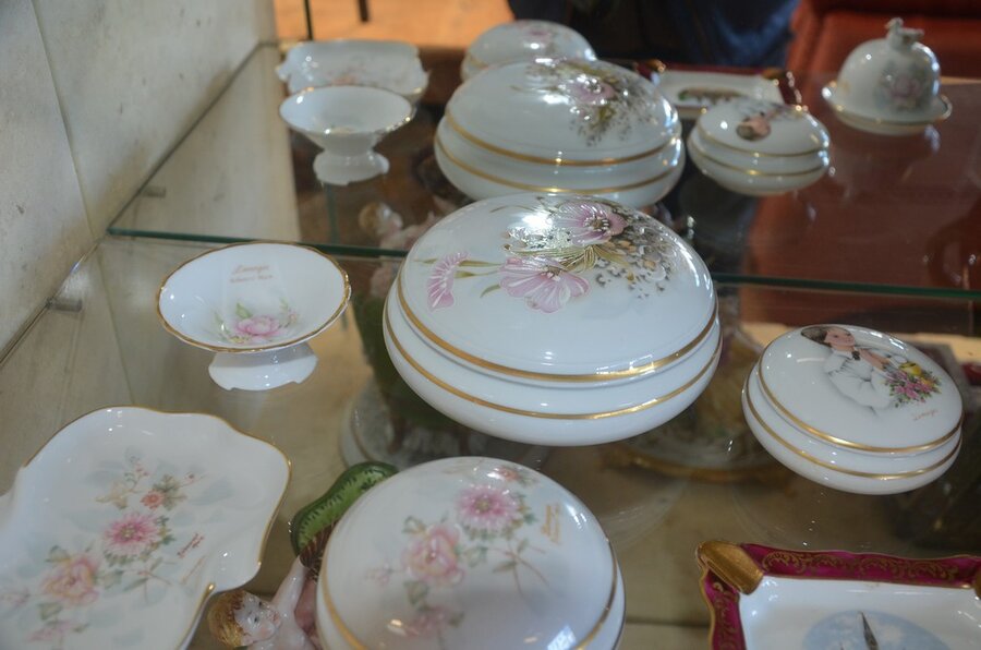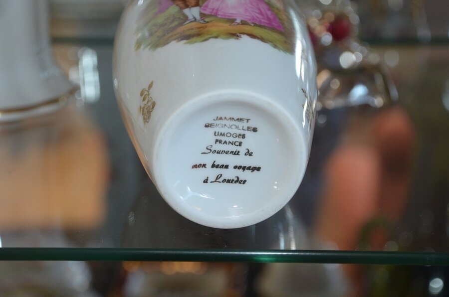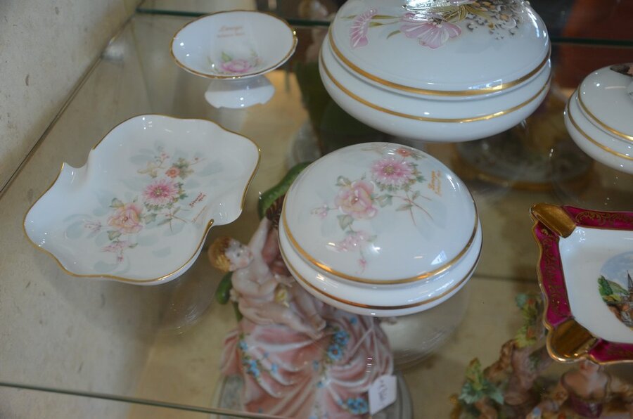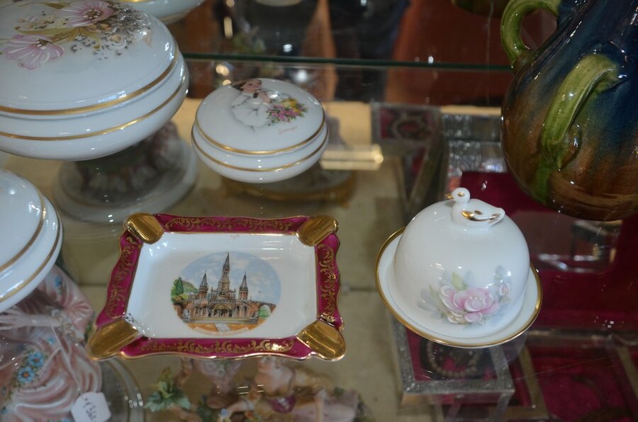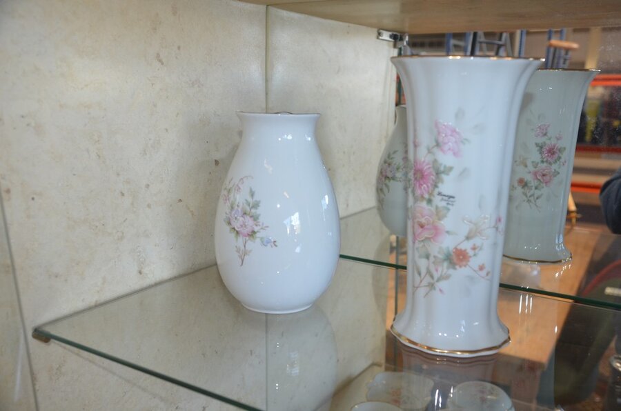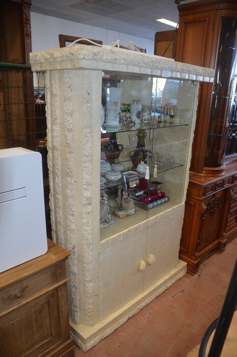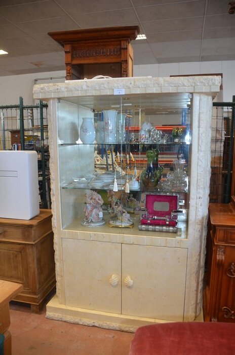 Wit stenen vitrinekast 2 deuren 2 glazen deuren, 2 vazen LIMOGES, 7 sierstukken LIMOGES, 2 beeldjes biscuit, 4 glazen sierstukken, 5 gekleurde glaasjes, asbak