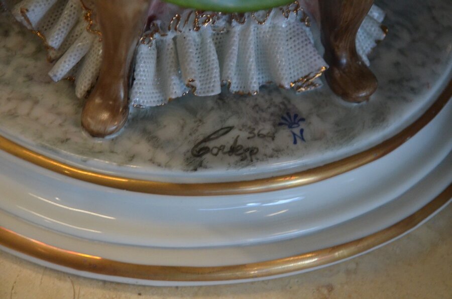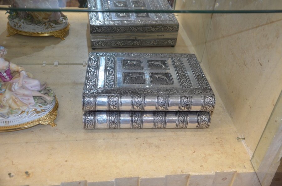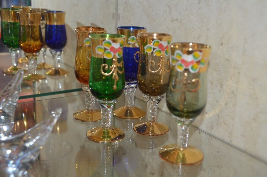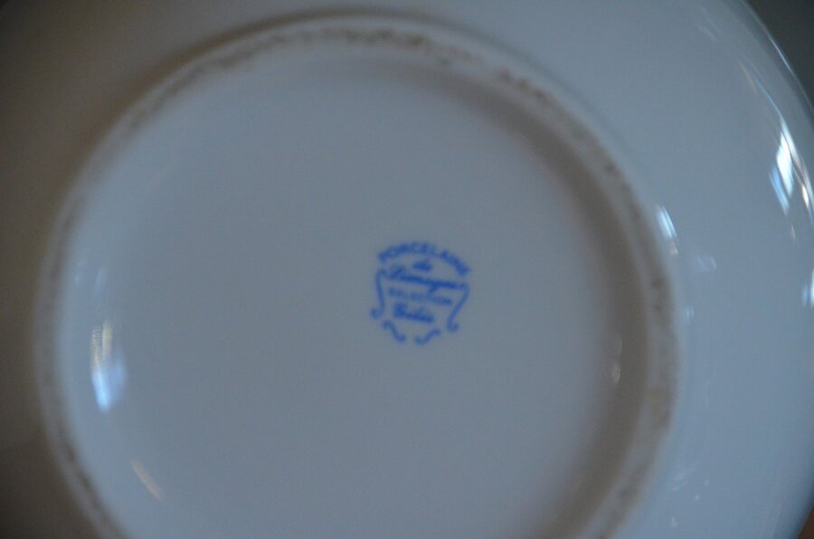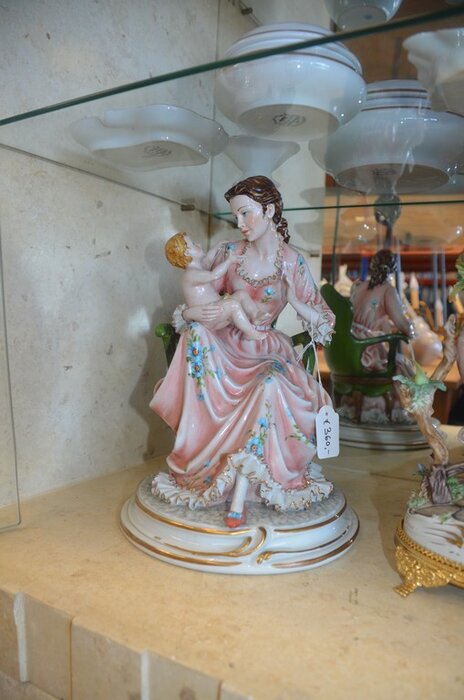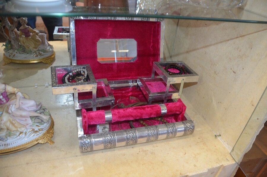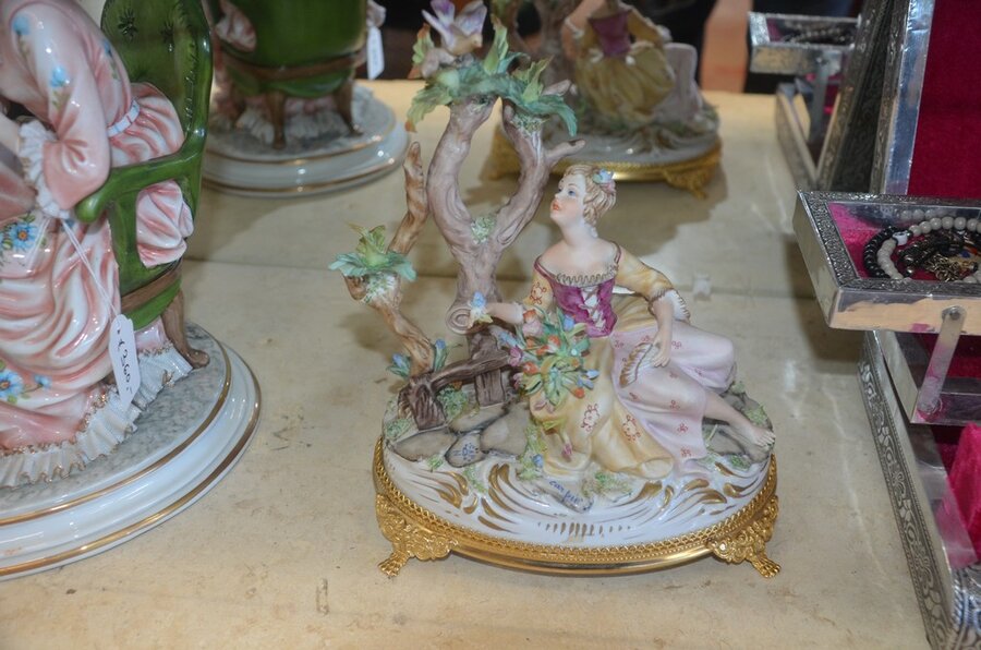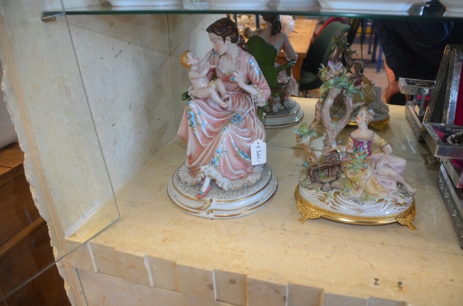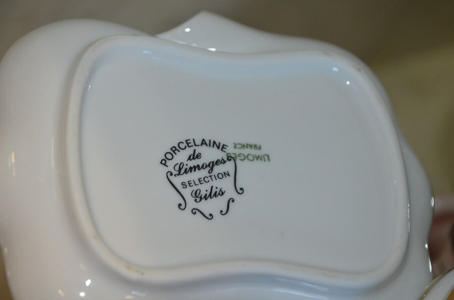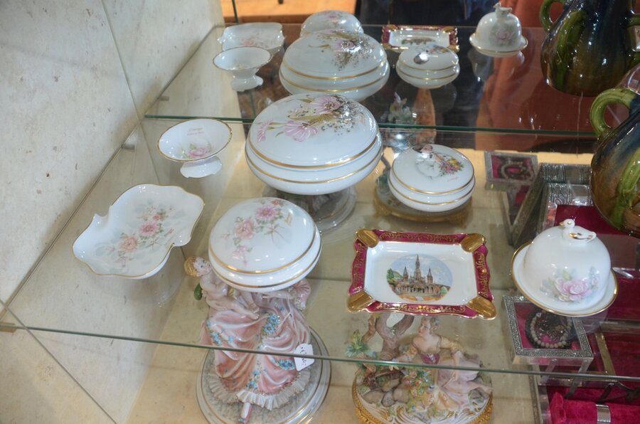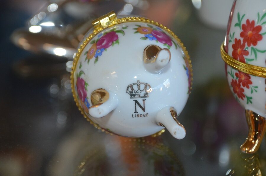 Wit stenen vitrinekast 2 deuren 2 glazen deuren, 2 vazen LIMOGES, 7 sierstukken LIMOGES, 2 beeldjes biscuit, 4 glazen sierstukken, 5 gekleurde glaasjes, asbak