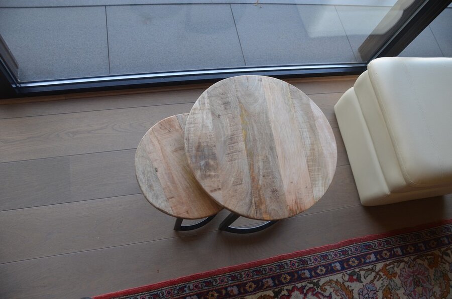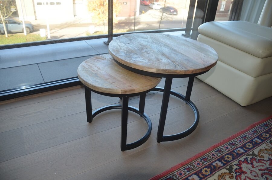 Opazetel, beige lederen poef, 2 ronde bijzettafeltjes