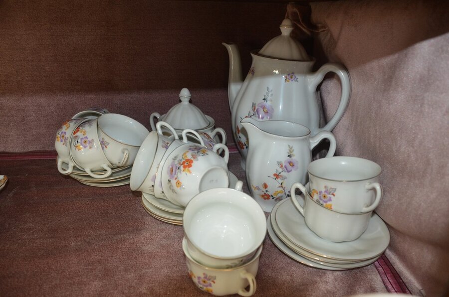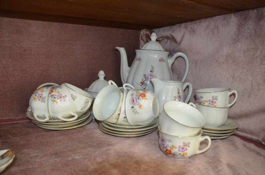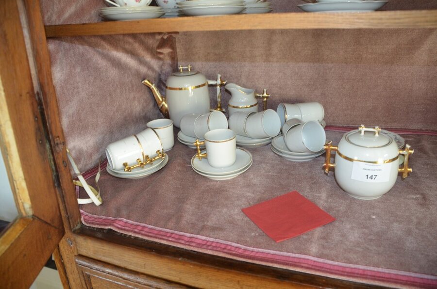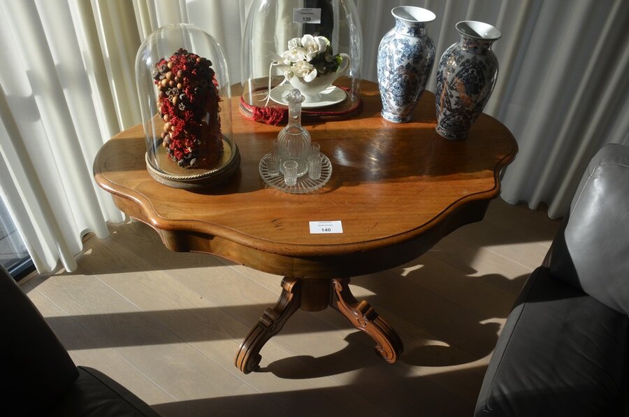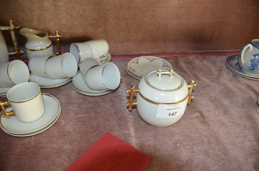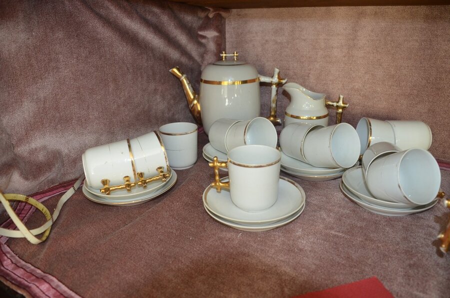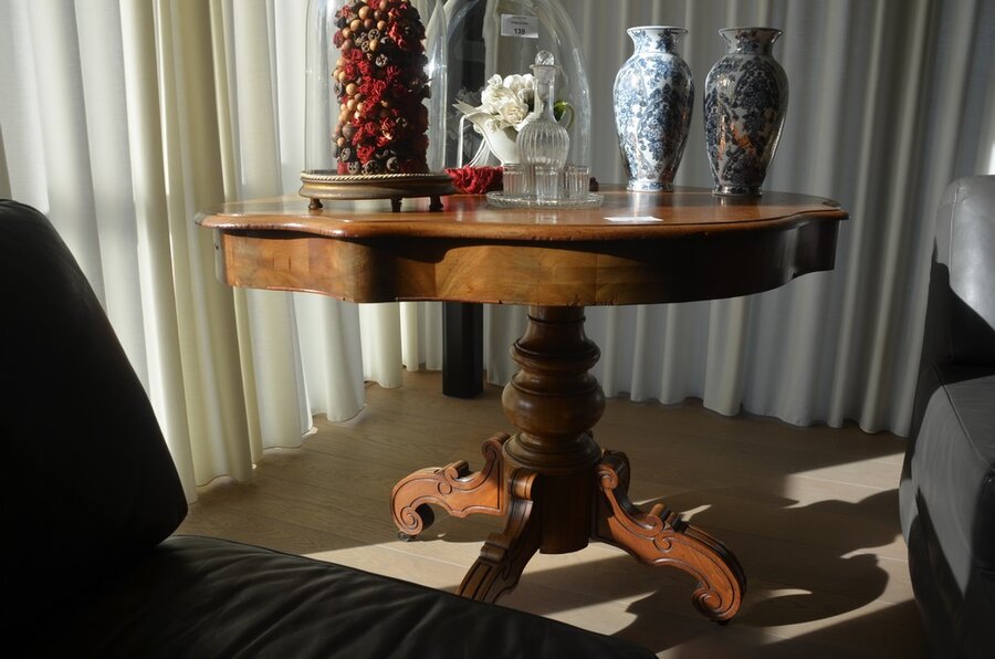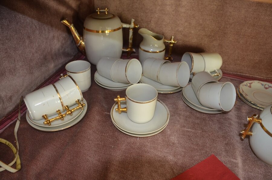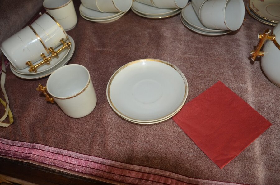 Oud tafeltje op rolvoet, 2 porseleinen koffieserviezen,