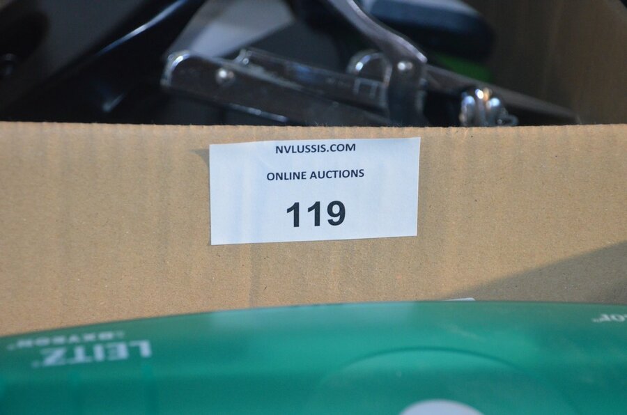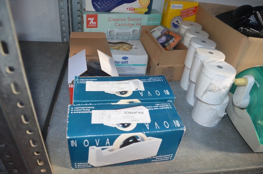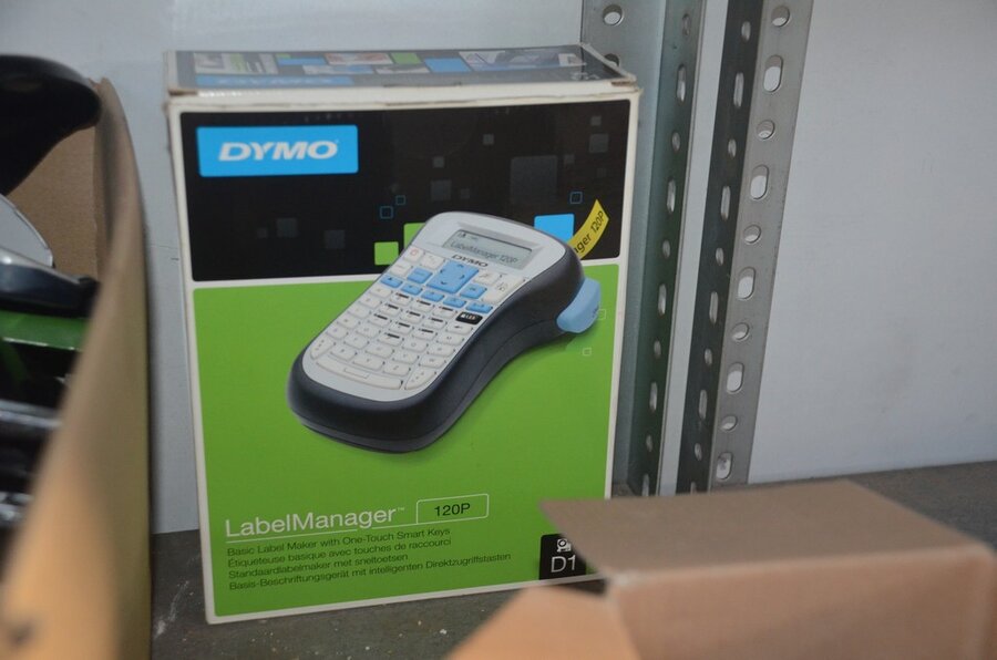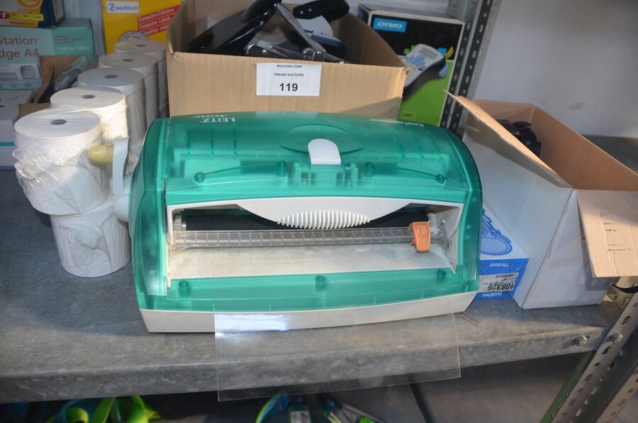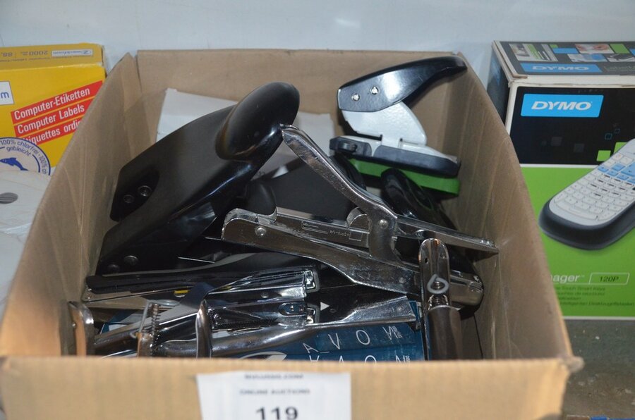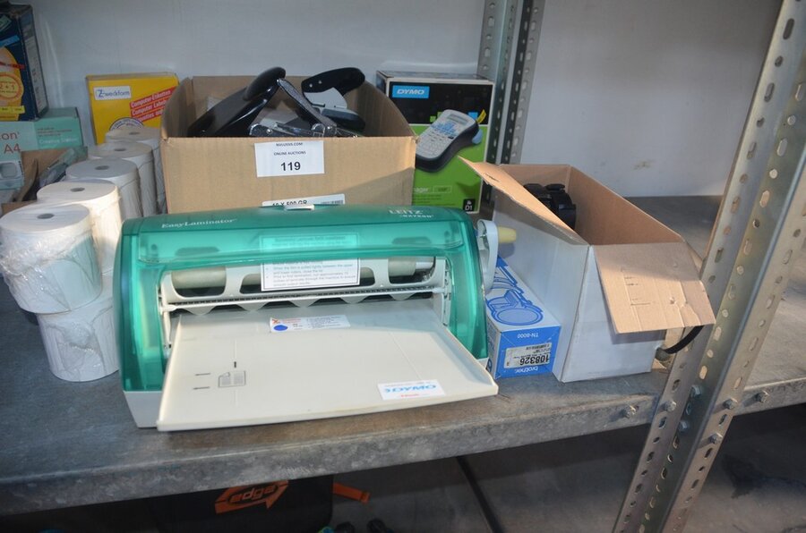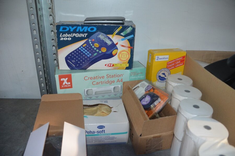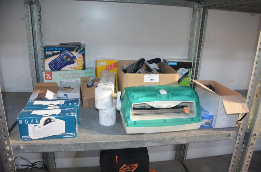 Partij kantoorartikelen w.o. 2 DYMO label printers, lamineerder LEITZ, cartrige station, perforators, plakbandhouders, nietmachine, enz