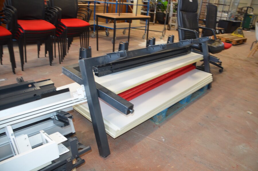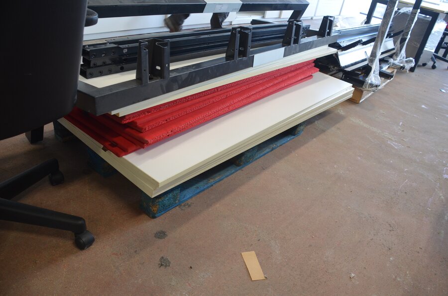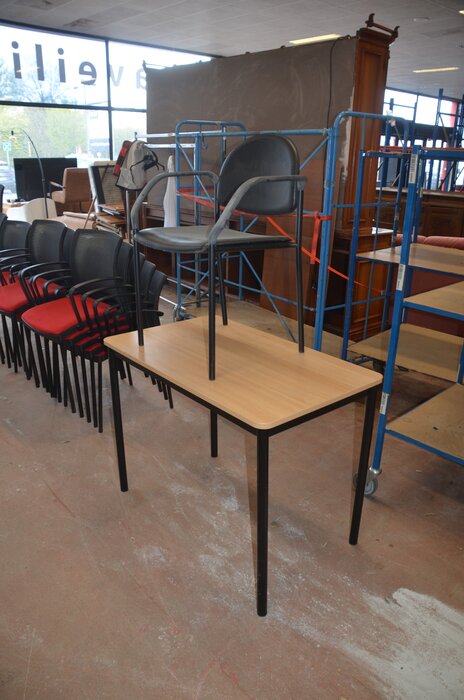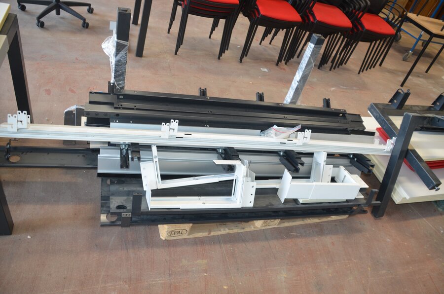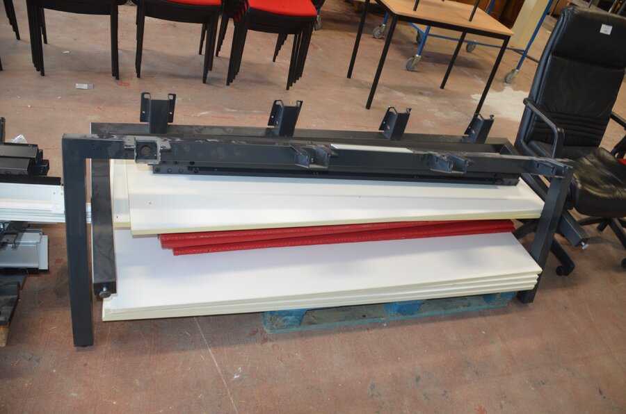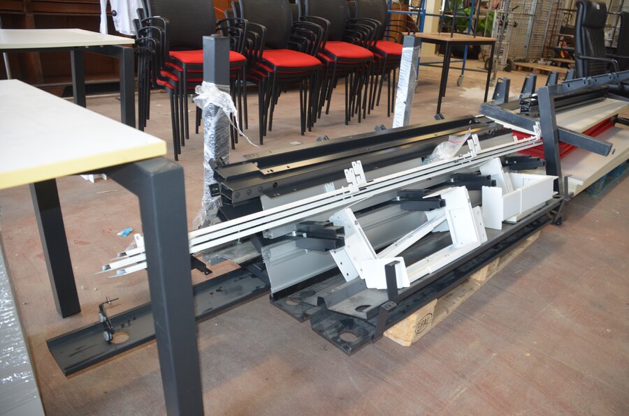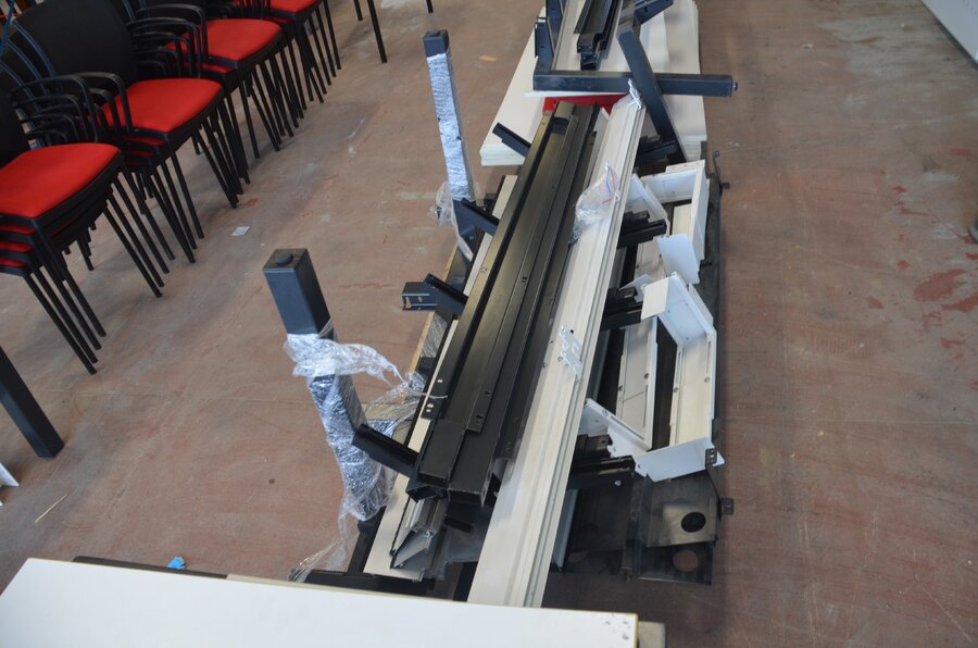 Bureel (gedemonteerd) bestaande uit: 4 tafelbladen met 3 onderstellen, 4 pc beugels, 8 scheidingswanden, 2 bureelstoelen, tafel 100x60x85 cm met stoel zwarte zit