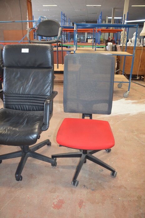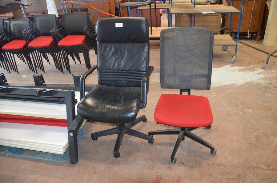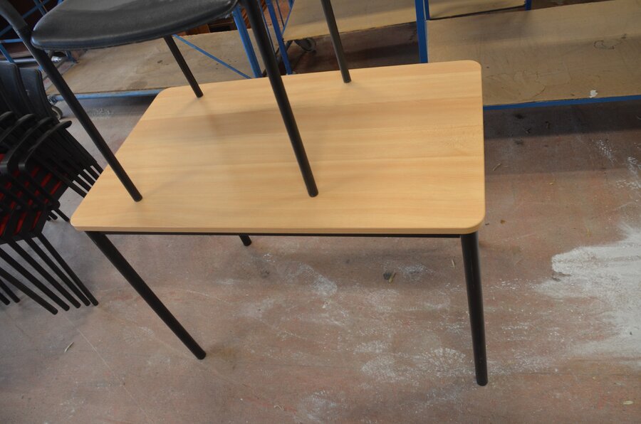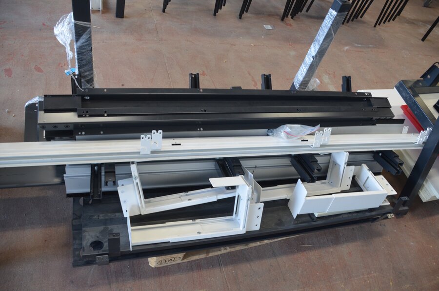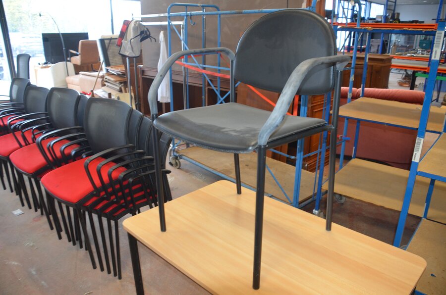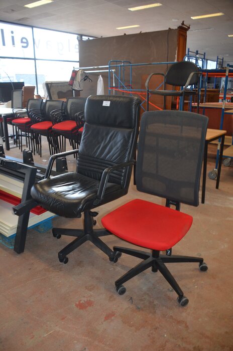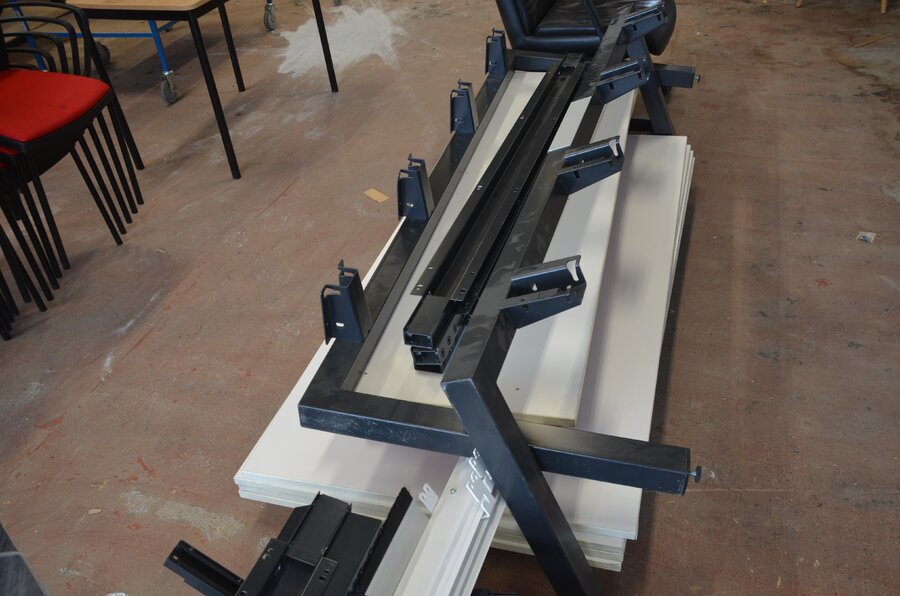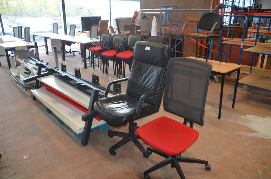 Bureel (gedemonteerd) bestaande uit: 4 tafelbladen met 3 onderstellen, 4 pc beugels, 8 scheidingswanden, 2 bureelstoelen, tafel 100x60x85 cm met stoel zwarte zit