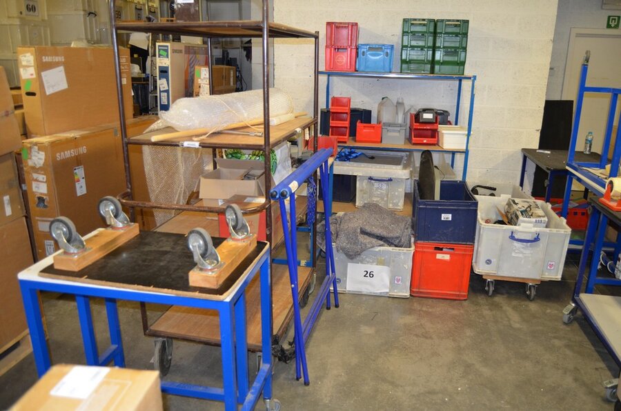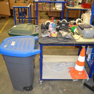 2 pvc verrijdbare vuilbakken, 6 verrijdbare tafels, verrrijdbaar metalen rek met 3 leggers, metalen transportkar met 4 leggers, metalen schraag blauw, ca. 17 pvc bakken en aflegbakjes, 6 verlengkabels op haspel, 4 verlengkabels,