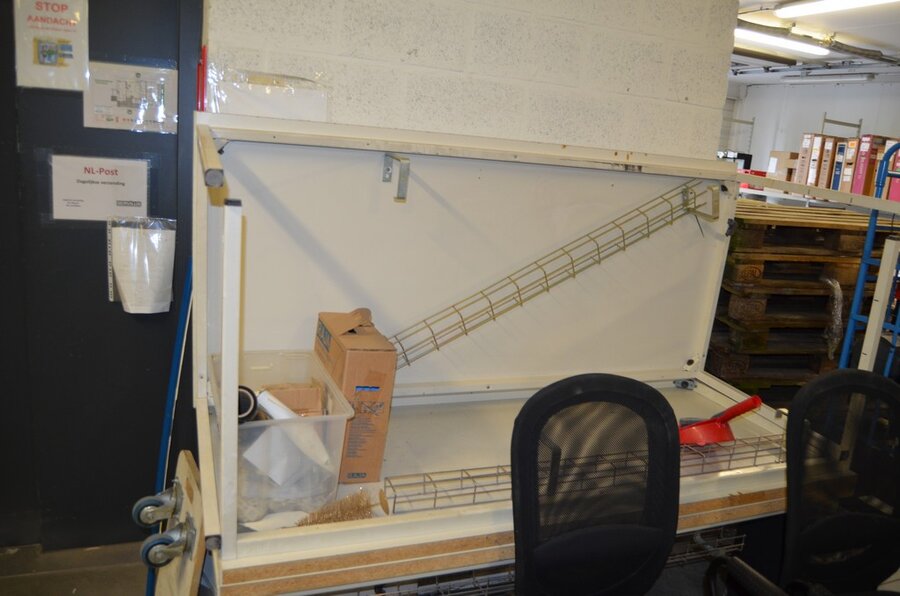 Lotnummer 163 3 rechthoekige schrijftafels, 2 rolbureelstoelen, transportkar 3 etages, 3 labelprinters ZEBRA, 2 pvc vuilbakken, 3 lockerkasten, 2 poetskarren NUMATIC (b251 t.e.m. b255) Deze veiling is afgelopen