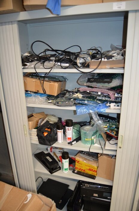 Lotnummer 192 Metalen kast met 4 leggers en 2 schuifdeuren met inhoud, ladekast (b377 t.e.m. b383) Deze veiling is afgelopen