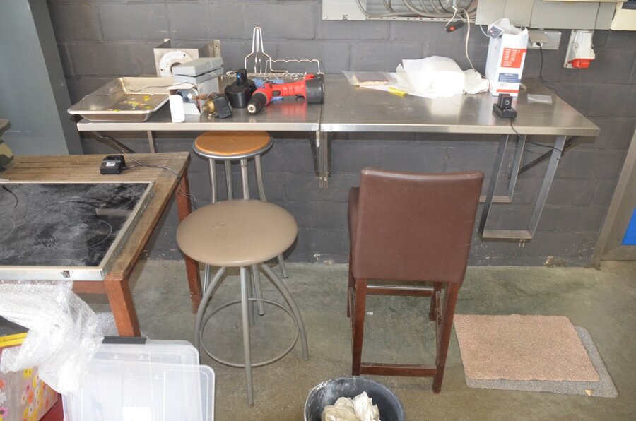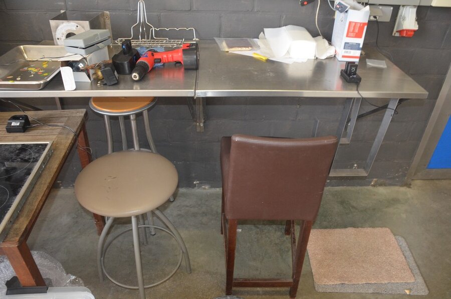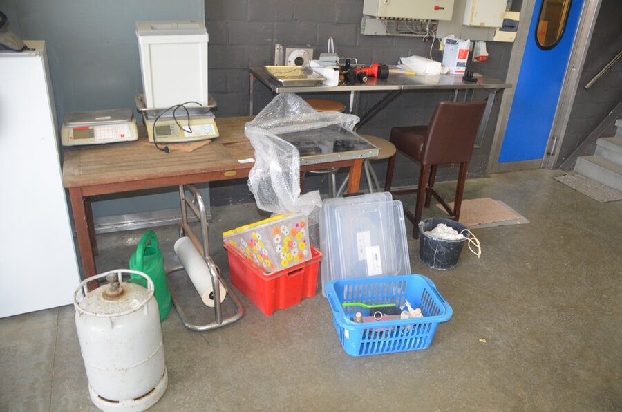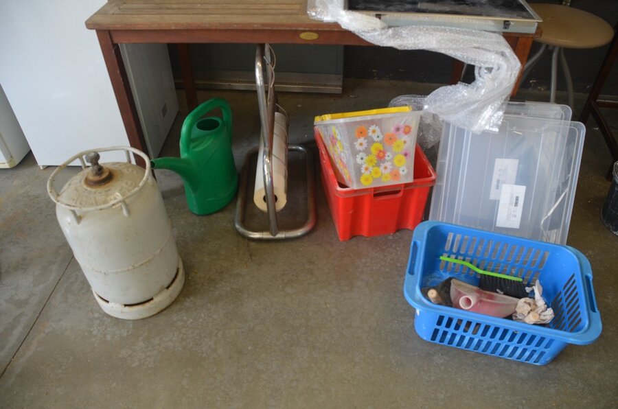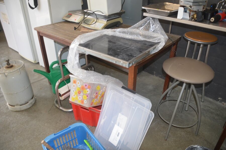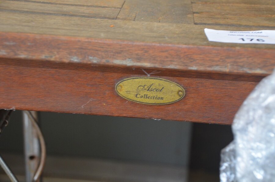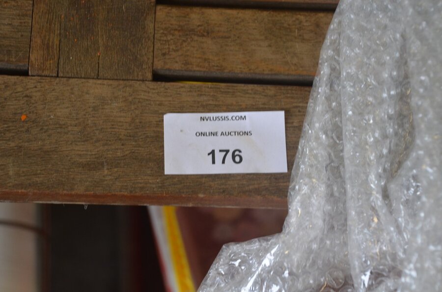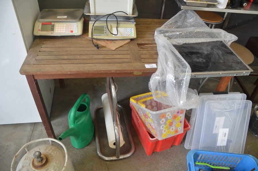 Lotnummer 176 Teak tuintafel, keramische kookplaat AEG, papierrolhouder, batterijboor met lader, 3 barkrukken Deze veiling is afgelopen
