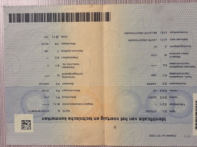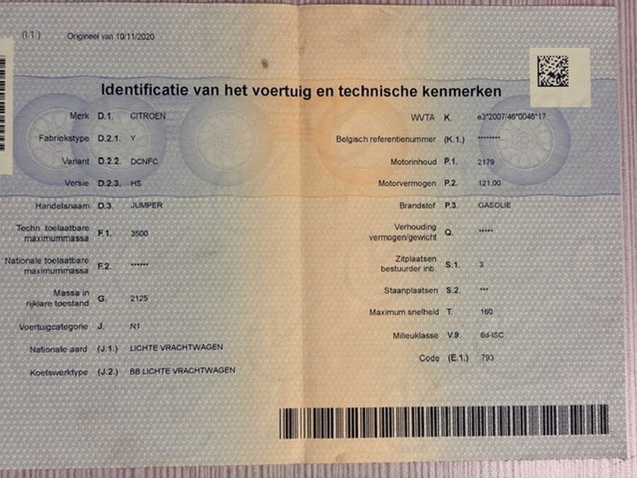 Lichte vrachtwagen CITROEN Jumper, type: Y, variant: DCNFC, versie: HS, chassisnummer: VF7YDCNFC12P96373, bouwjaar: 10/11/2020 met inschrijvingsbewijs deel I, gelijkvormigheidsattest en verlopen schouwingsbewijs. (b2)