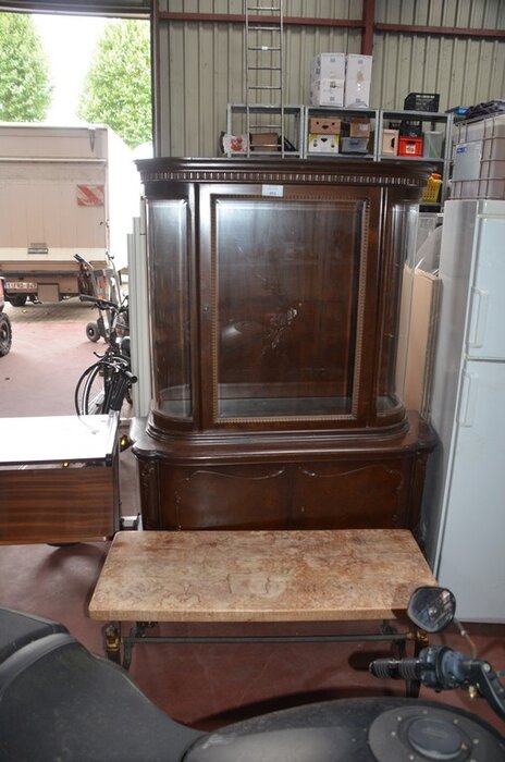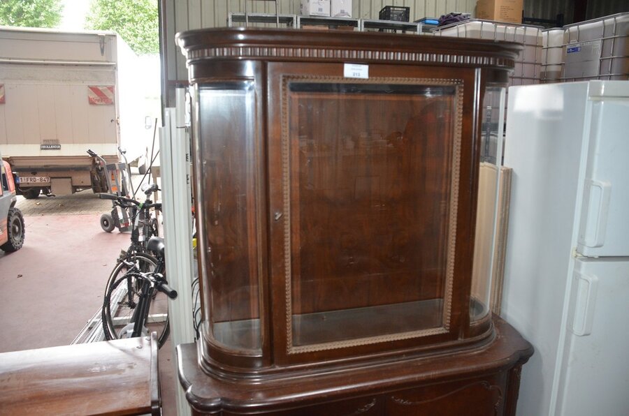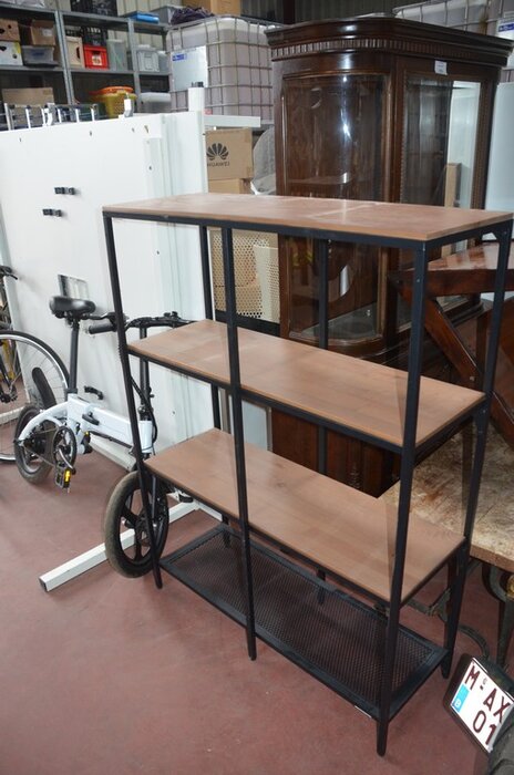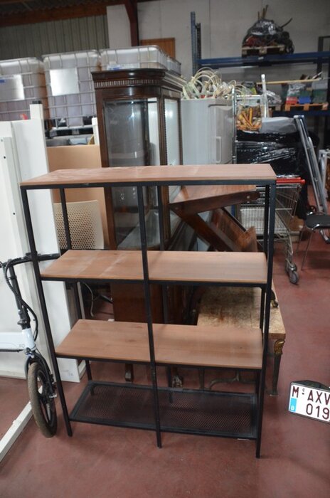 Lotnummer 213 Modern rek 4 leggers afm. 100x36x136, vitrinekast 2 deuren 1 glazen deur afm. 100x44x180, verrijdbaar tv meubel afm. 70x52x70, salontafel houten blad metalen onderstel afm. 113x48x48 Deze veiling is afgelopen