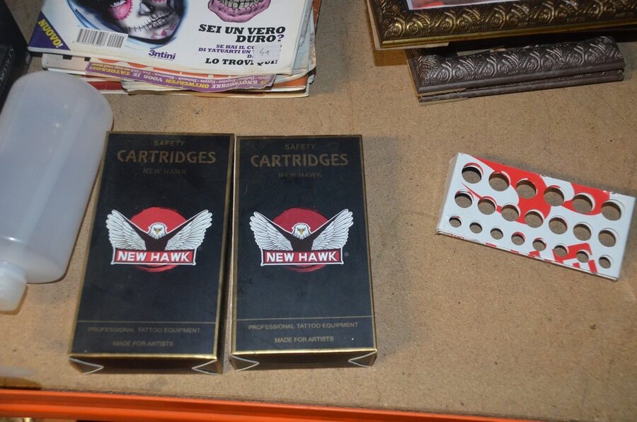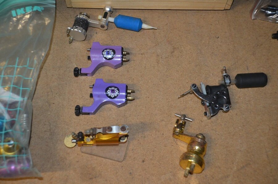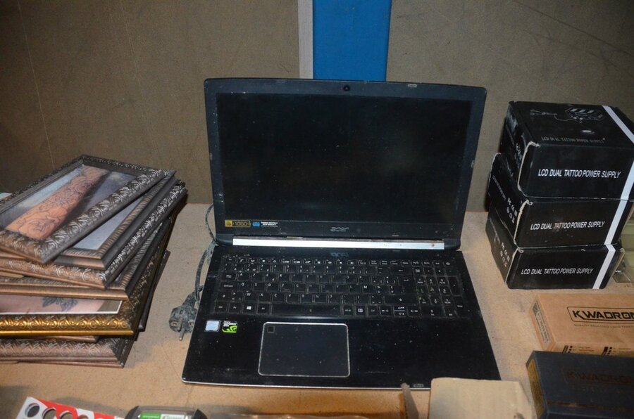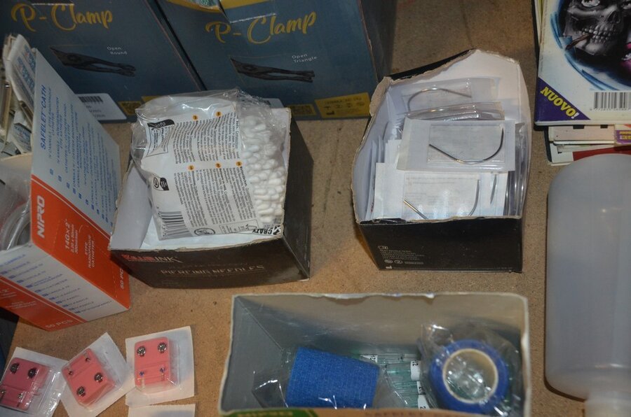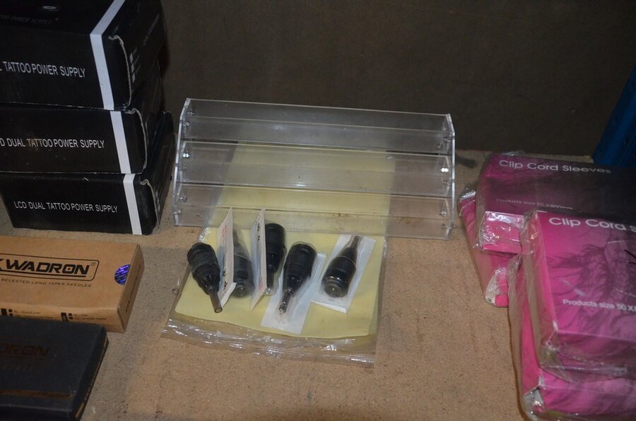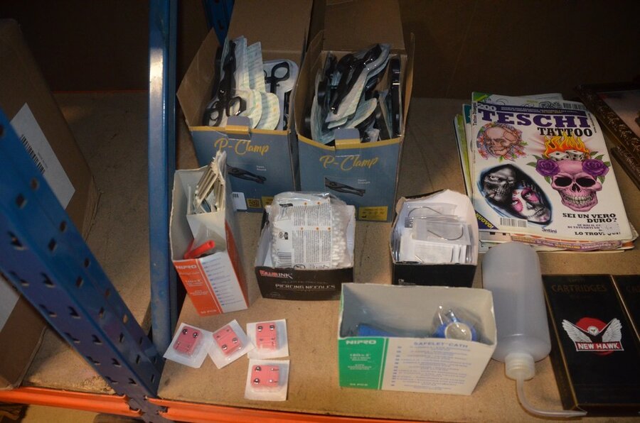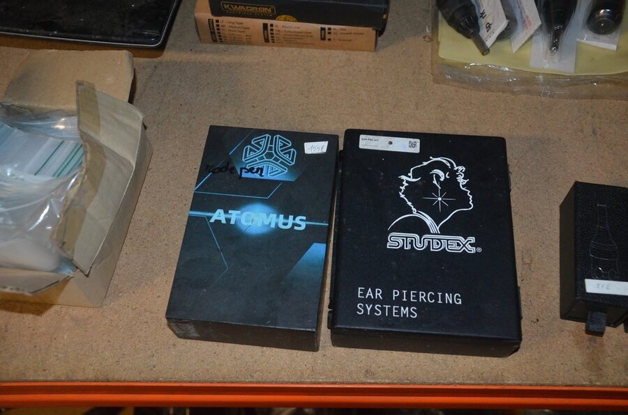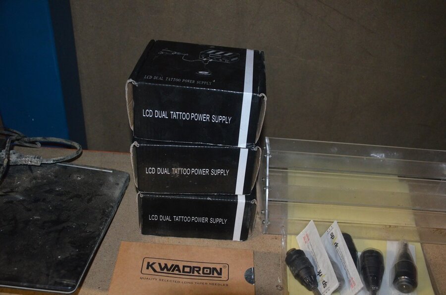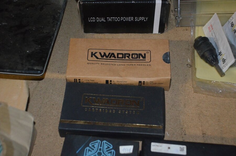 roterende tatoeage machine met blauwe grip; 15 voetpedalen met kabel, diverse kabels; ca. 26 led lamp coil; ca. 23 klip koord kabels, 5 pakjes clip cord sleeves 50x800mm (125 stuks per pakje), 9 tatoeage boeken; 2 doosjes NEW HAWK safety cartridges; ca. 50 wegwerp percingtangen zwart ITC PIERCING- 4 STUDEX PLUS gesteriliseerde oorpiercings- ca. 39 KILLER INK gebogen holle piercingsnaald, ca. 12 KILLER INK piercingnaalden, 3 steriele percings; 4 katheter NIPRO SELECT 14G piercing (2,20x50mm), 7 katheter NIPRO SELECT 18G (1,35x50mm), ca. 40 holle piercing naalden, oor piercing kit STUDEX, ATOMUS roterende tatoeage machine rood, 2 tatoeage machine handvaten zwart, 3 lcd dual tattoo power supply, ca. 17 plastic potjes, doosje met ca. 20 KWADRON tatto naaldcartridges, doosje met ca. 50 KWADRON long taper naalden, 3 vellen oefenhuid en 2 rolletjes coban tape, 3 SAFERLY SKIN DOODLER pen houders met ca. 40 vullingen, partij kleine hersluitbare gripzakjes, 5 SPARK TATTO cartridges naald adapter zwart, 6 zakjes met zwarte dopjes, 8 plastic houders, 4 houten kistjes, 9 wandversieringen, laptopt ACER (slechte staat, werking onbekend), decoratie materiaal (slechte staat), draadloze betaalterminal EFT-POS 8210 (slechte staat, werking onbekend) (4 t/m 14, 17 t/m 44)