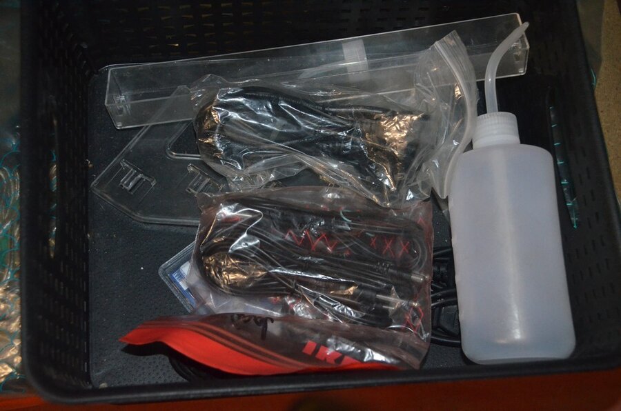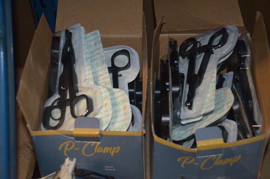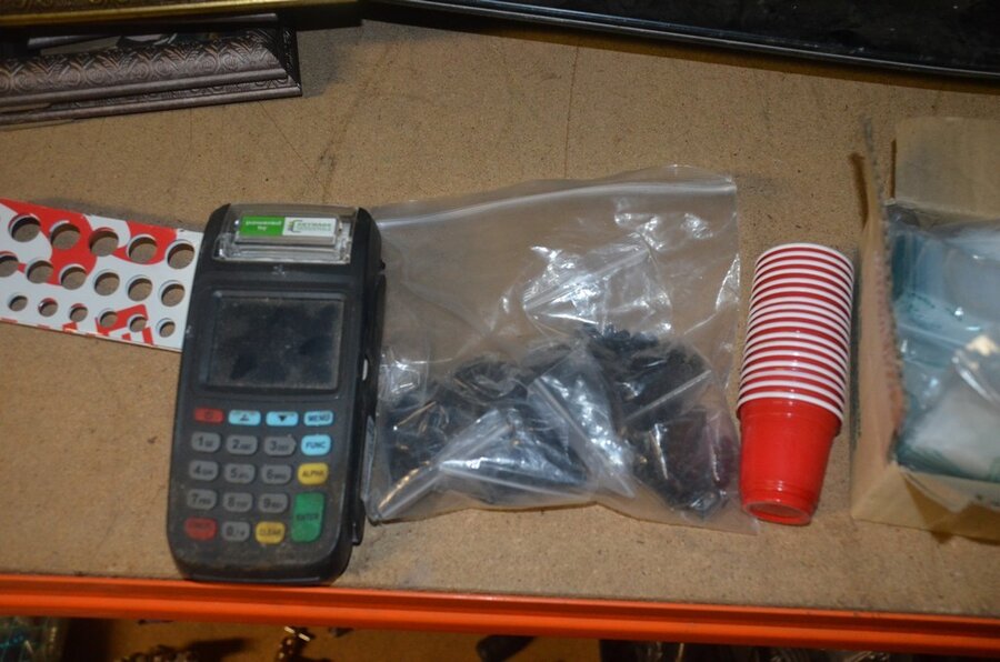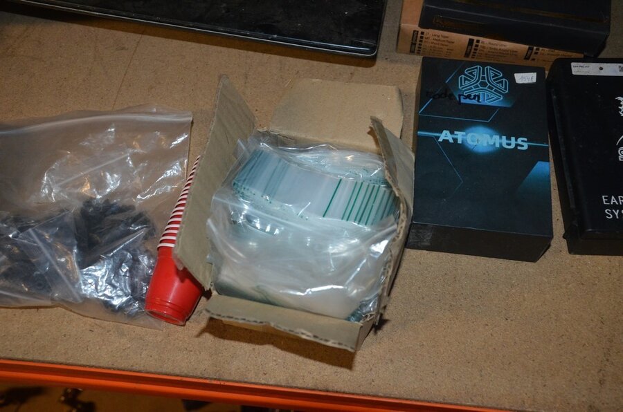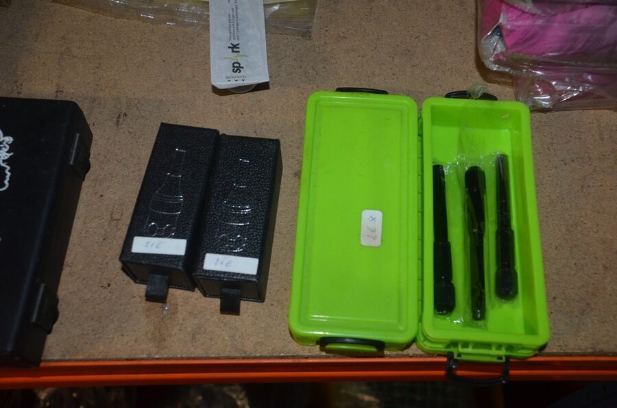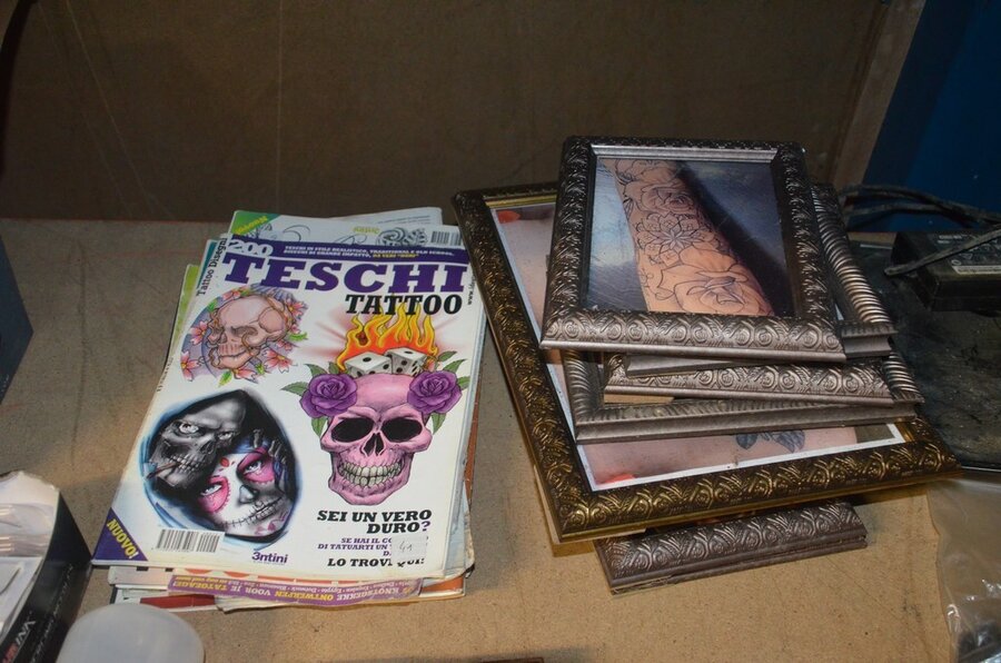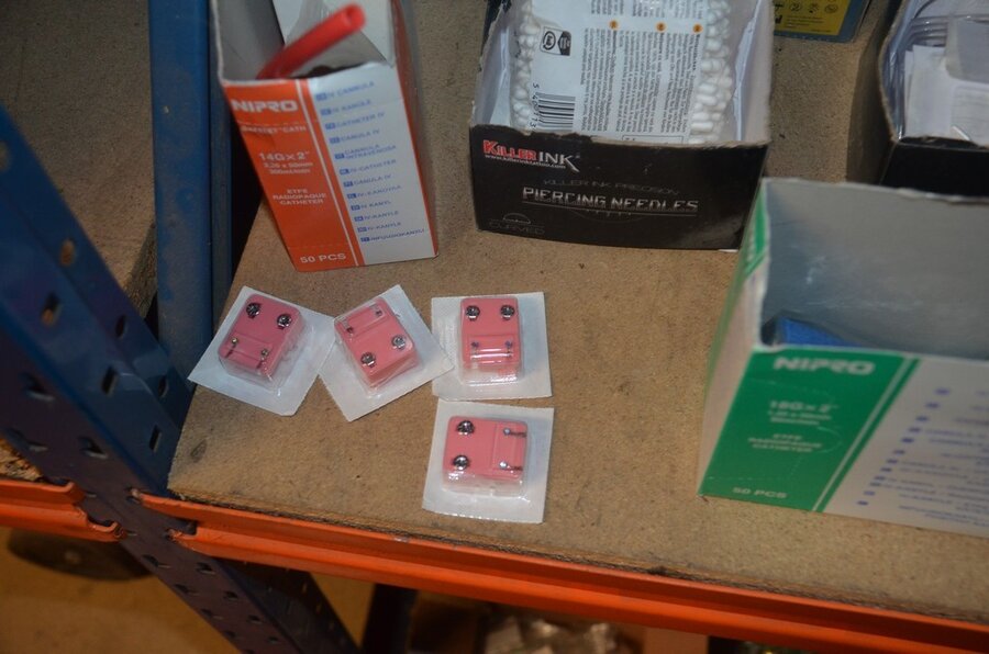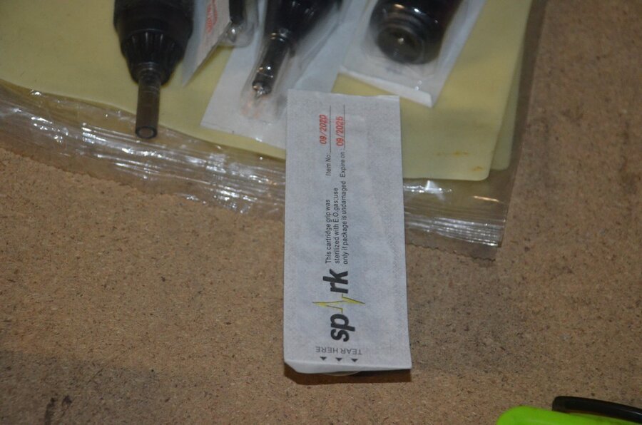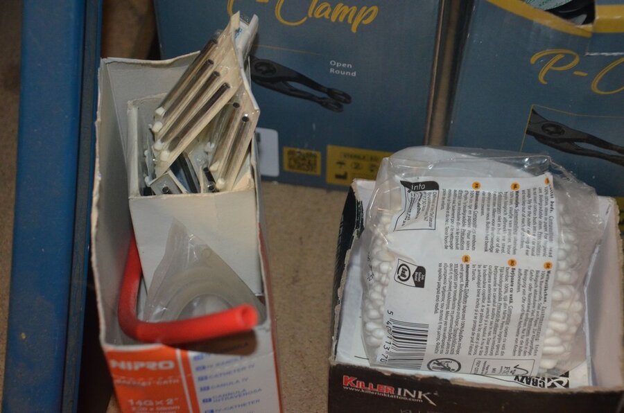 roterende tatoeage machine met blauwe grip; 15 voetpedalen met kabel, diverse kabels; ca. 26 led lamp coil; ca. 23 klip koord kabels, 5 pakjes clip cord sleeves 50x800mm (125 stuks per pakje), 9 tatoeage boeken; 2 doosjes NEW HAWK safety cartridges; ca. 50 wegwerp percingtangen zwart ITC PIERCING- 4 STUDEX PLUS gesteriliseerde oorpiercings- ca. 39 KILLER INK gebogen holle piercingsnaald, ca. 12 KILLER INK piercingnaalden, 3 steriele percings; 4 katheter NIPRO SELECT 14G piercing (2,20x50mm), 7 katheter NIPRO SELECT 18G (1,35x50mm), ca. 40 holle piercing naalden, oor piercing kit STUDEX, ATOMUS roterende tatoeage machine rood, 2 tatoeage machine handvaten zwart, 3 lcd dual tattoo power supply, ca. 17 plastic potjes, doosje met ca. 20 KWADRON tatto naaldcartridges, doosje met ca. 50 KWADRON long taper naalden, 3 vellen oefenhuid en 2 rolletjes coban tape, 3 SAFERLY SKIN DOODLER pen houders met ca. 40 vullingen, partij kleine hersluitbare gripzakjes, 5 SPARK TATTO cartridges naald adapter zwart, 6 zakjes met zwarte dopjes, 8 plastic houders, 4 houten kistjes, 9 wandversieringen, laptopt ACER (slechte staat, werking onbekend), decoratie materiaal (slechte staat), draadloze betaalterminal EFT-POS 8210 (slechte staat, werking onbekend) (4 t/m 14, 17 t/m 44)