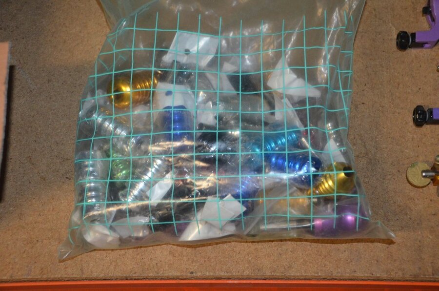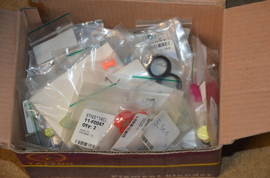 Doosje met ca. 80 stuks piercings en stretchers, ca. 36 metalen verstelbare tatoeage handvaten, elektrische tatoeage machine goud ROTARY, 2 spoel tatoeage machines,10 wergwerp cartridges grip zwart, 2 paarse BISCHOP ROTARY tatoeage machines,