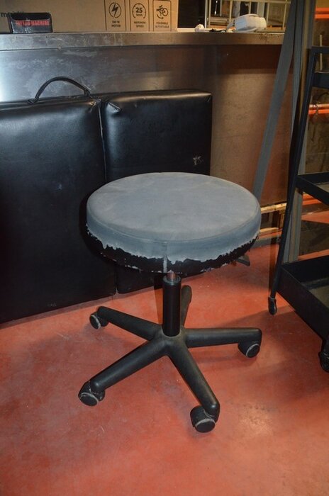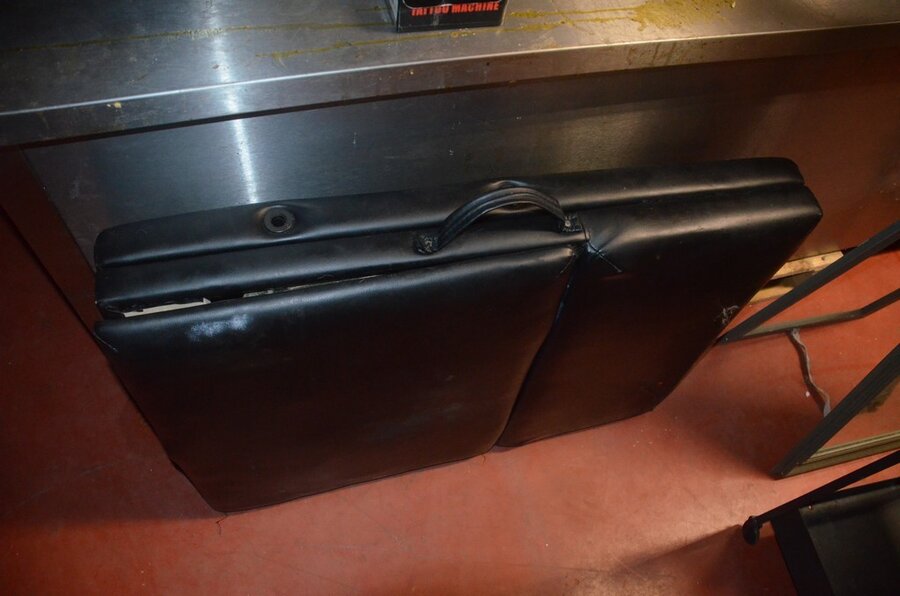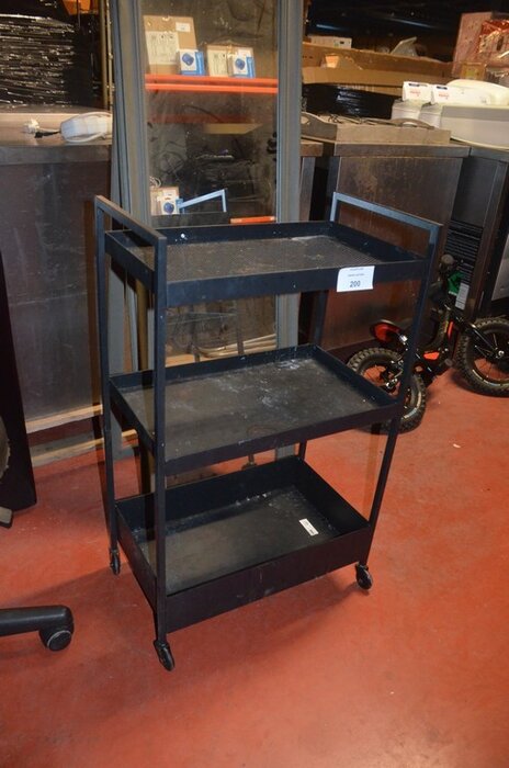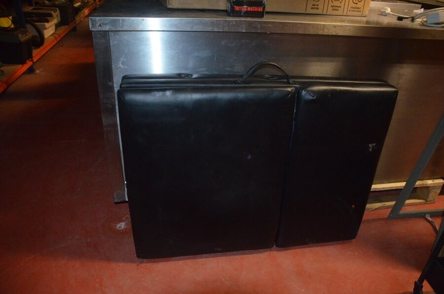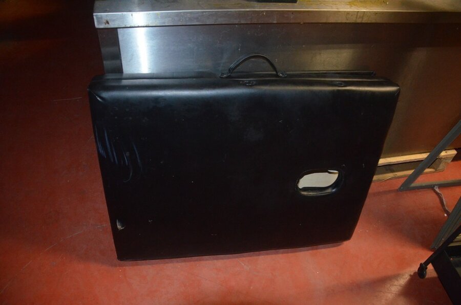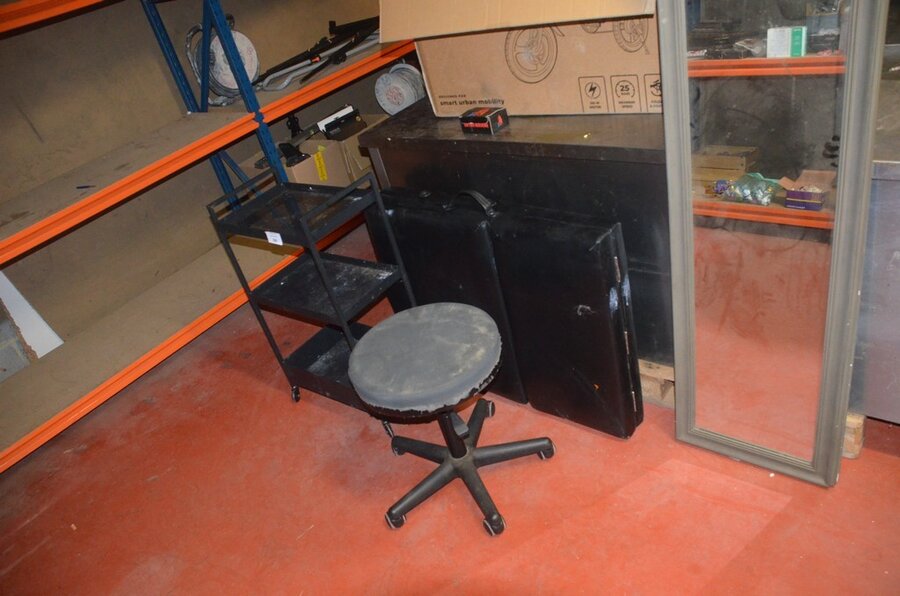 Zwart opvouwbare massagetafel, ronde kruk op wielen, rechthoekige spiegel, metalen rolrek, rekje zwart 3 etages (1,2,3,15,16)