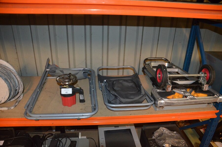 2 Campingstoelen, 3 plooibare steekwagens, campingvuurtje