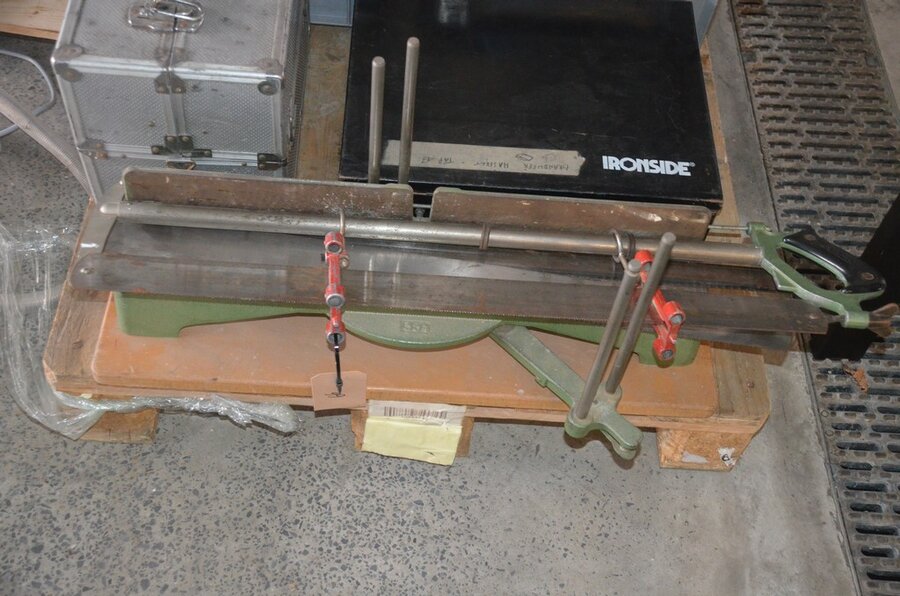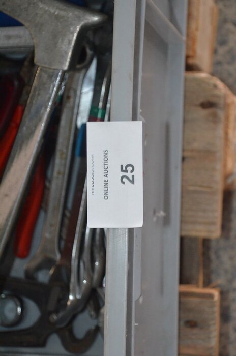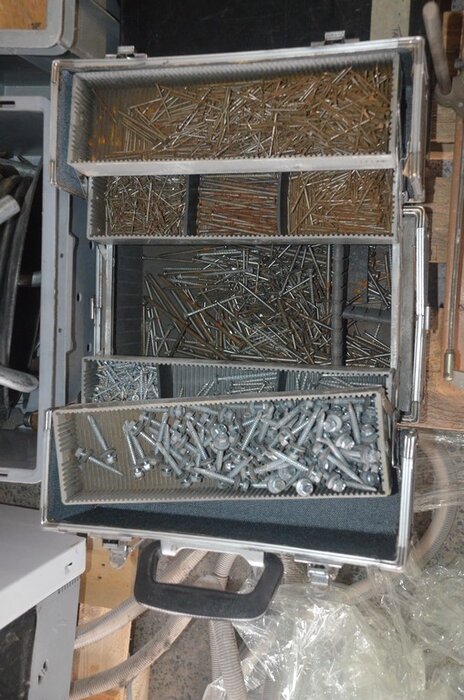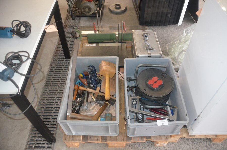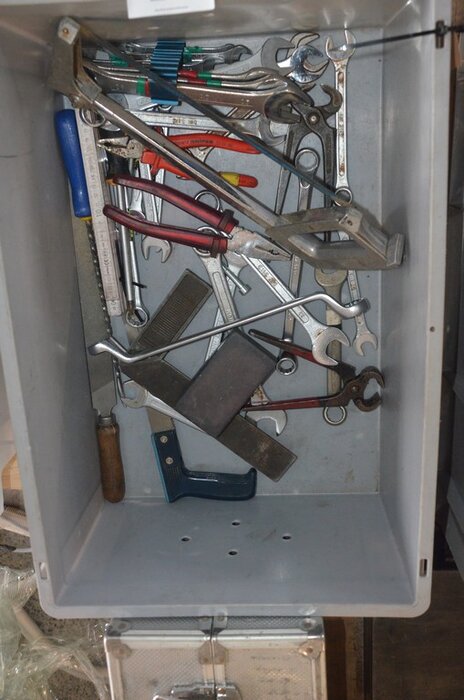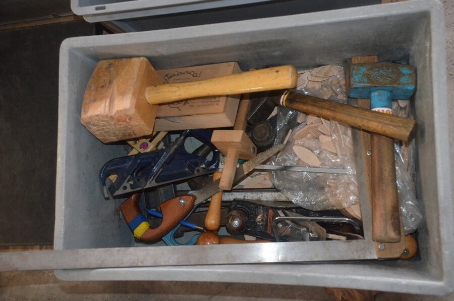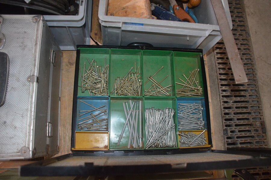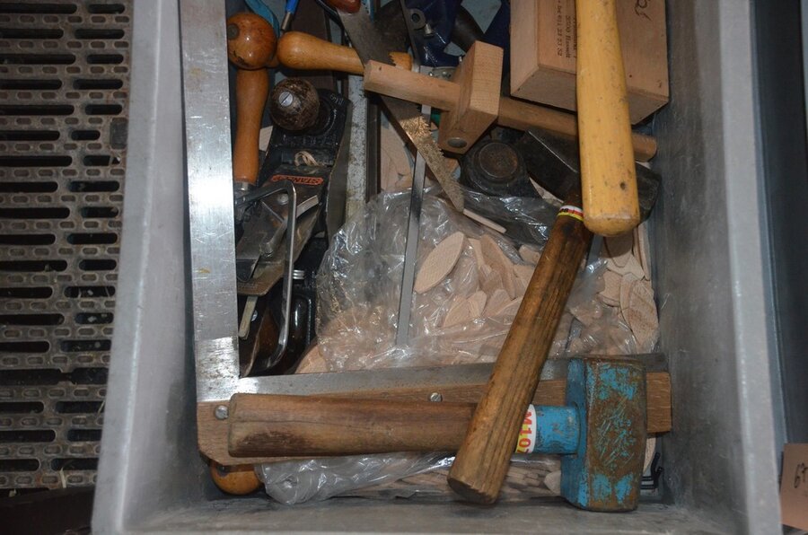 Divers klein handgereedschap (zonder grijze kisten), 2 x opbergdoos voor schroeven en nagels, verstekzaag