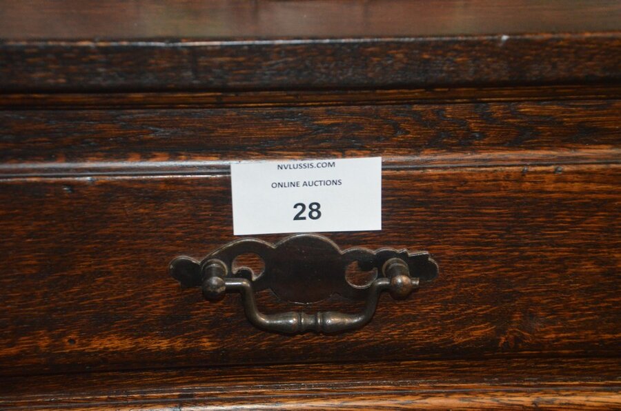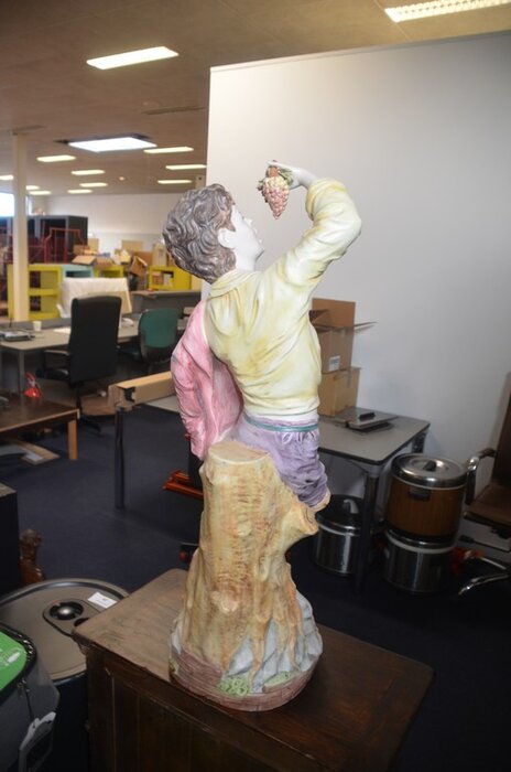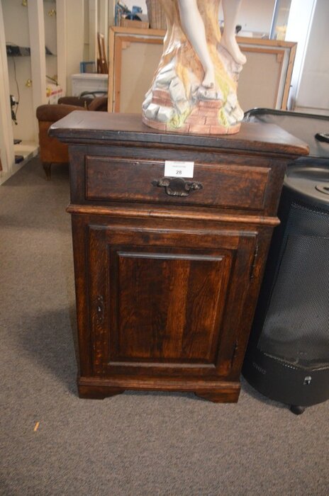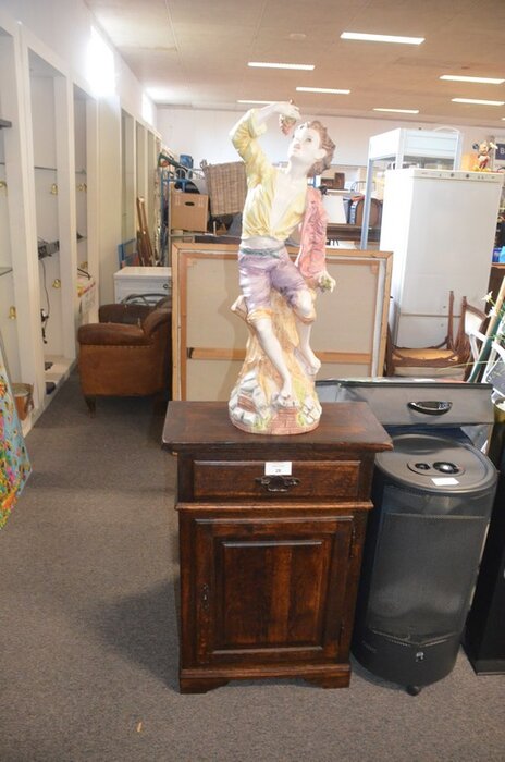 Bruin houten bijzetkastje 1 deur 1 laden, stenen beeld ca. 80cm