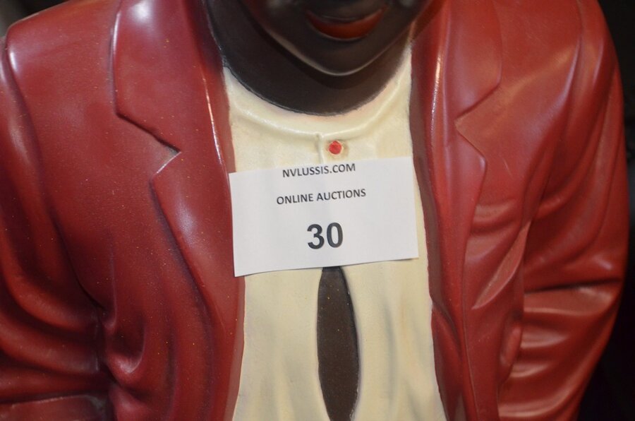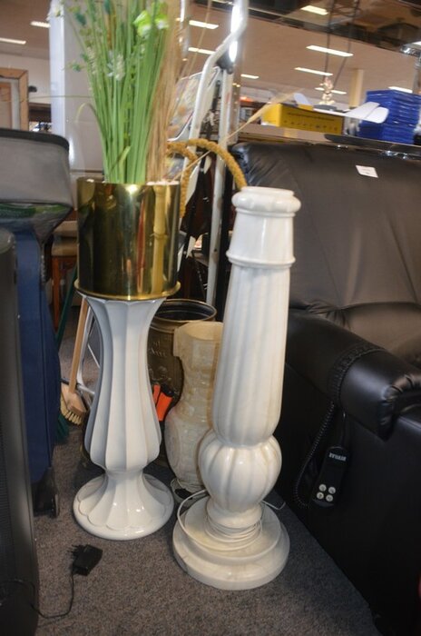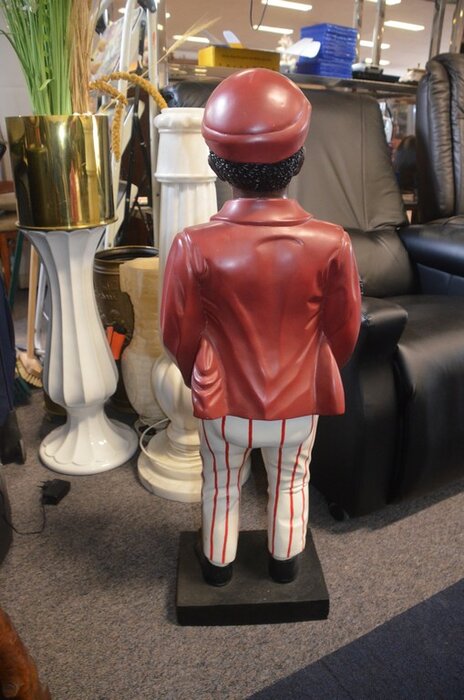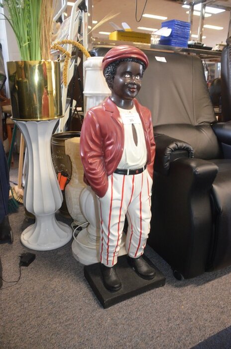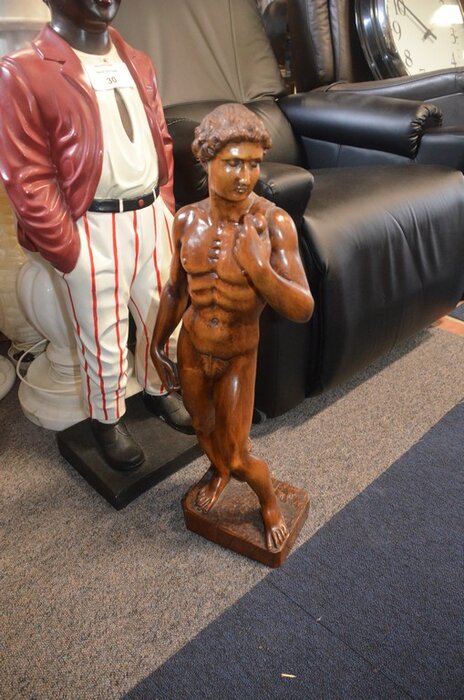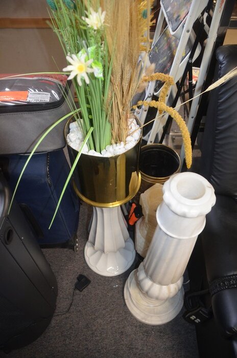 Stenen beeld jongen, houten beeld man, 3 diverse zuilen, 3 diverse potten