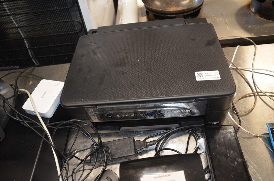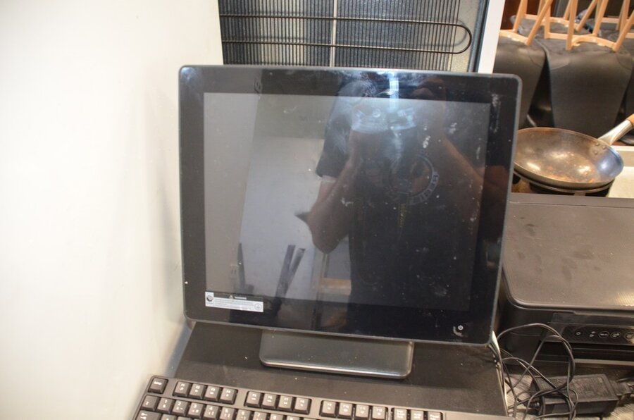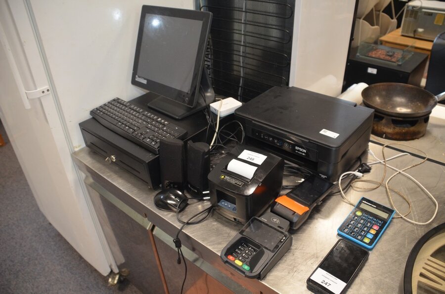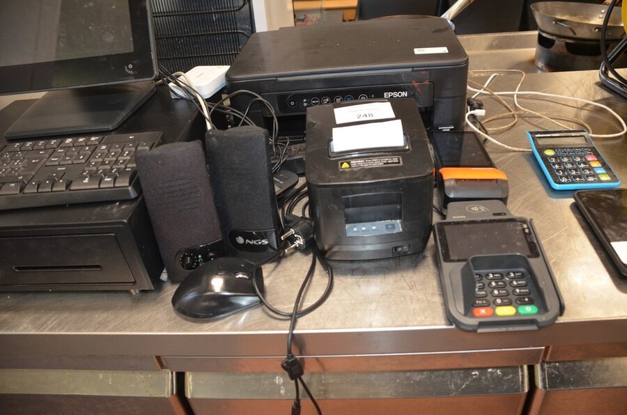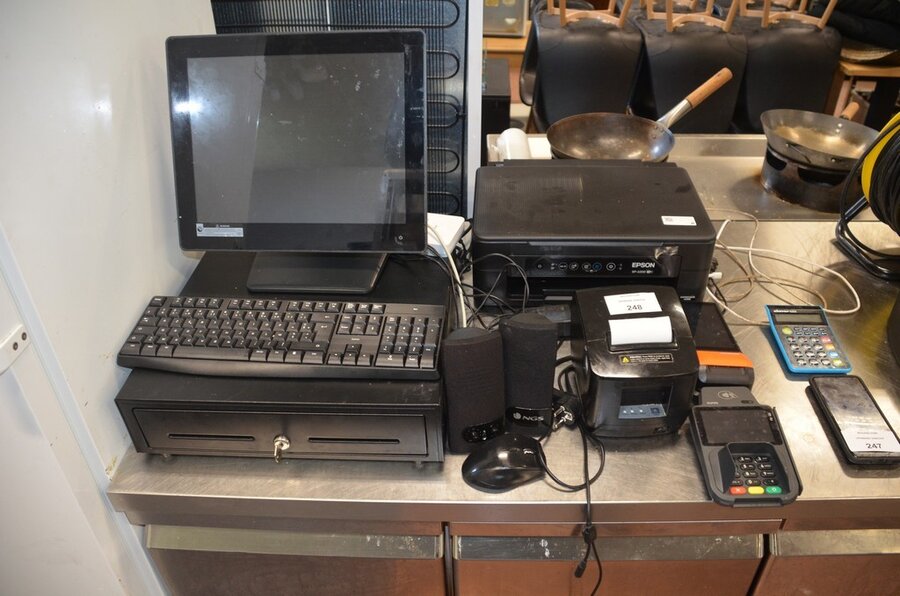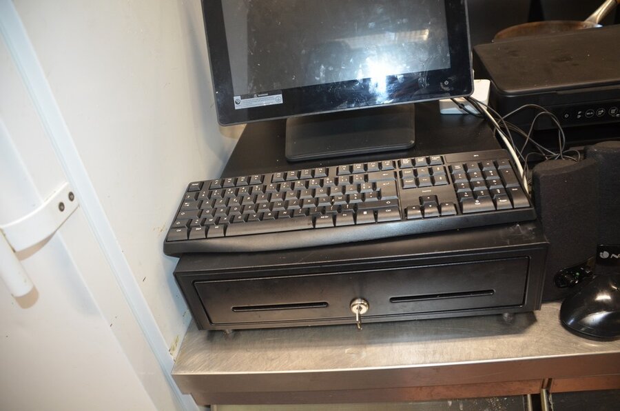 Computerkassa met touchscreen, toetsenbord, muis, geldlade, speakers, etiketprinter, printer EPSON XP2200, 2 betaalterminals