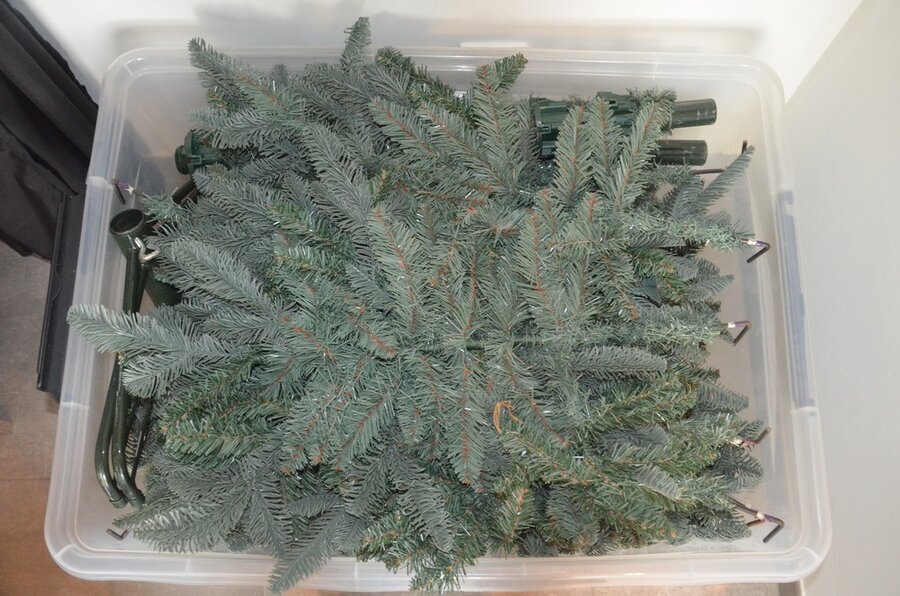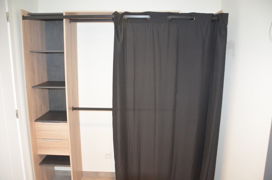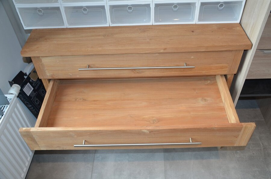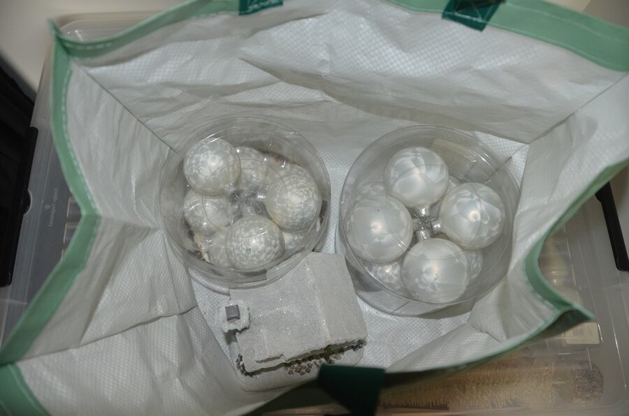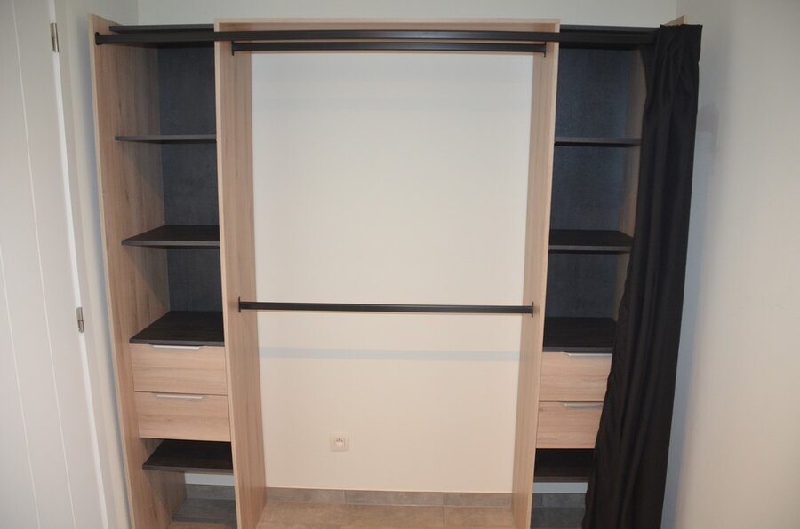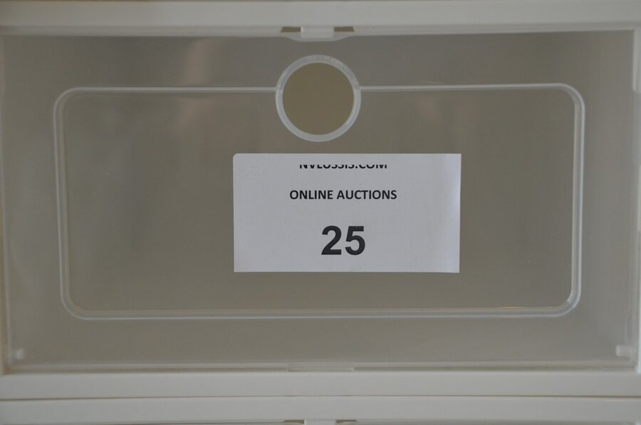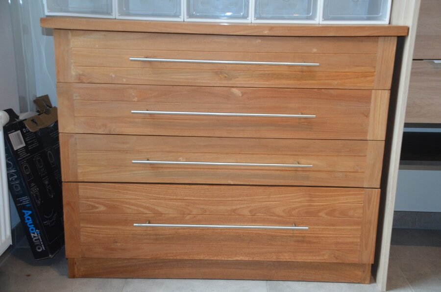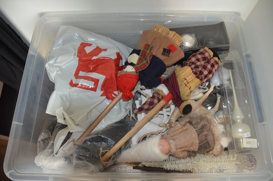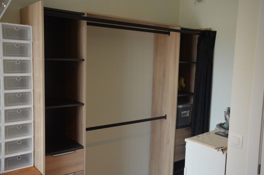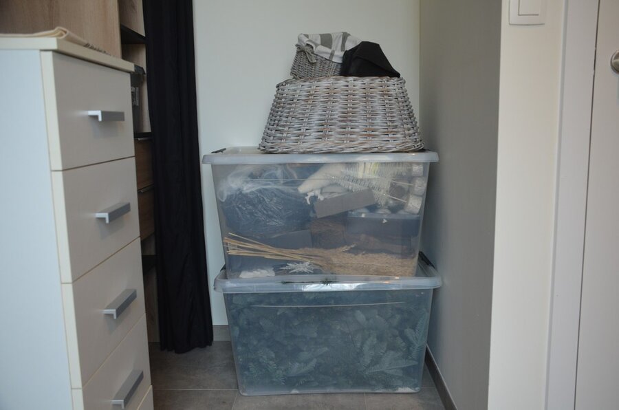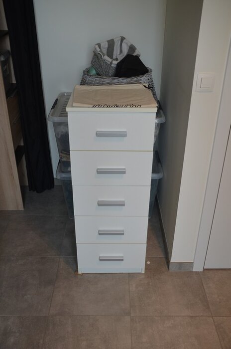 Fineerhouten kleerkast met gordijn 8 leggers 4 laden afm. 188x50x204, houten ladenkast 4 laden afm. 100x50x80, witte ladenkast 5 laden afm. 41x35x110, pvc schoenenkast , 2 dozen kerstversiering,