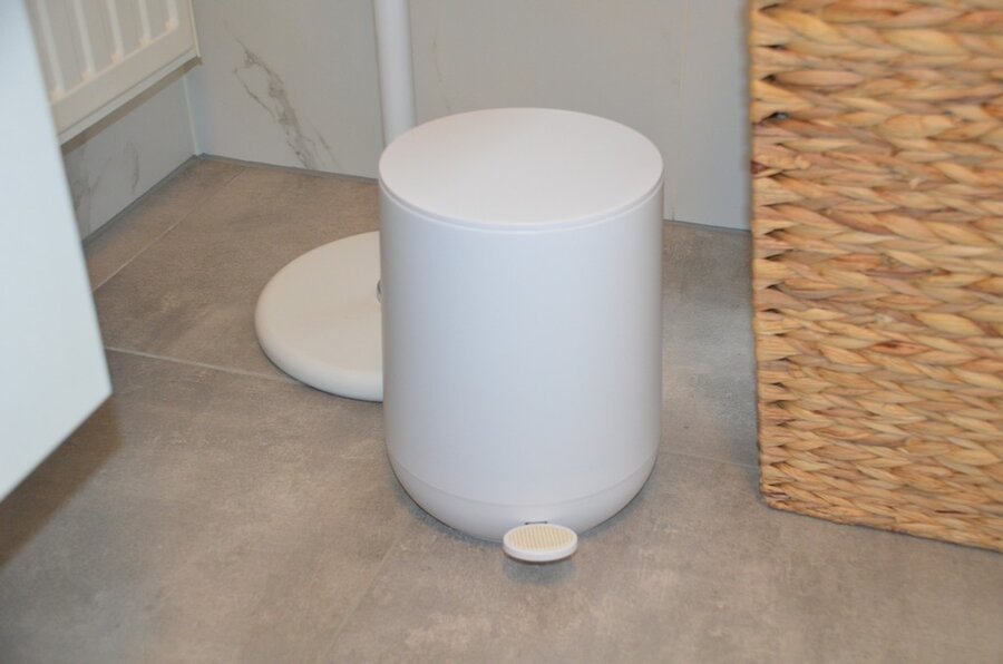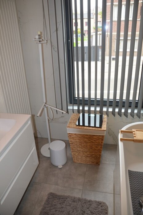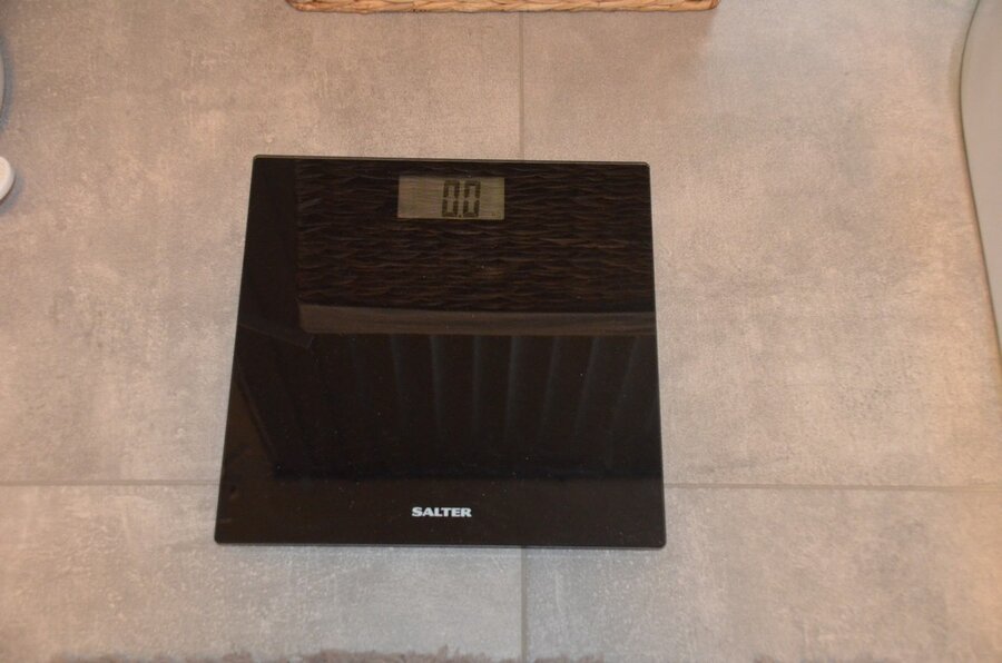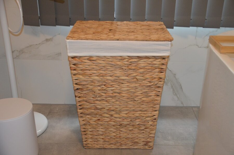 wandversiering afm. 210x55, rieten wasmand, vuilbakje, personenweegschaal SALTER