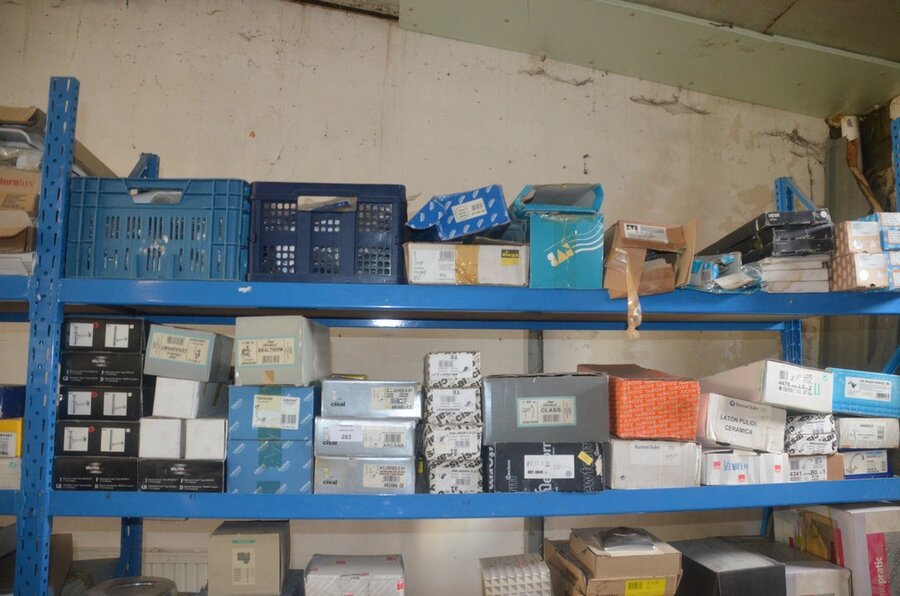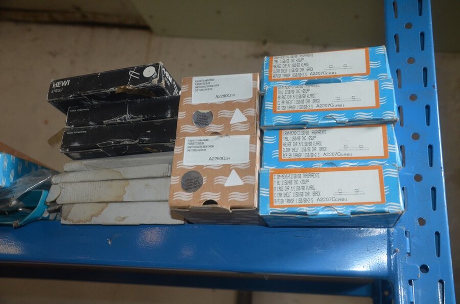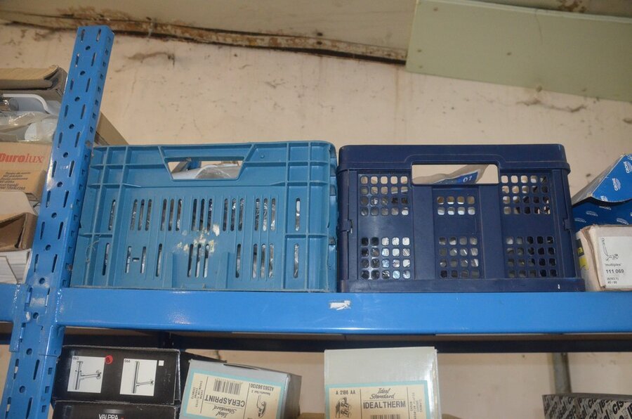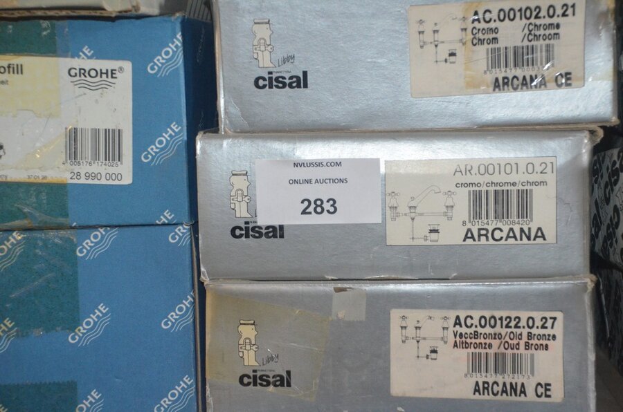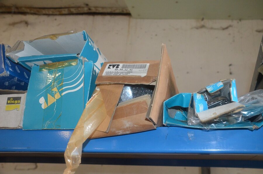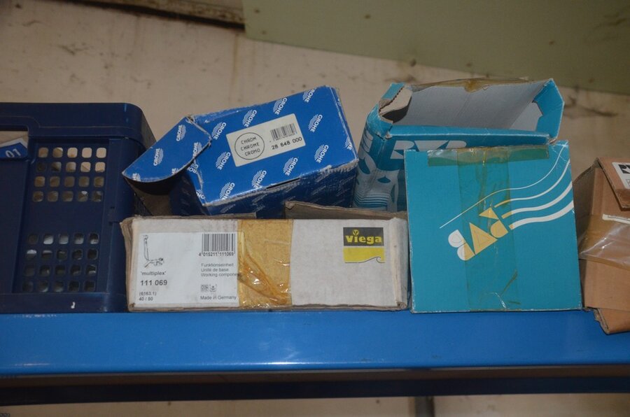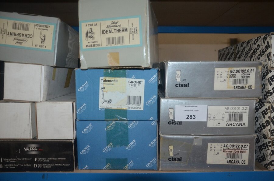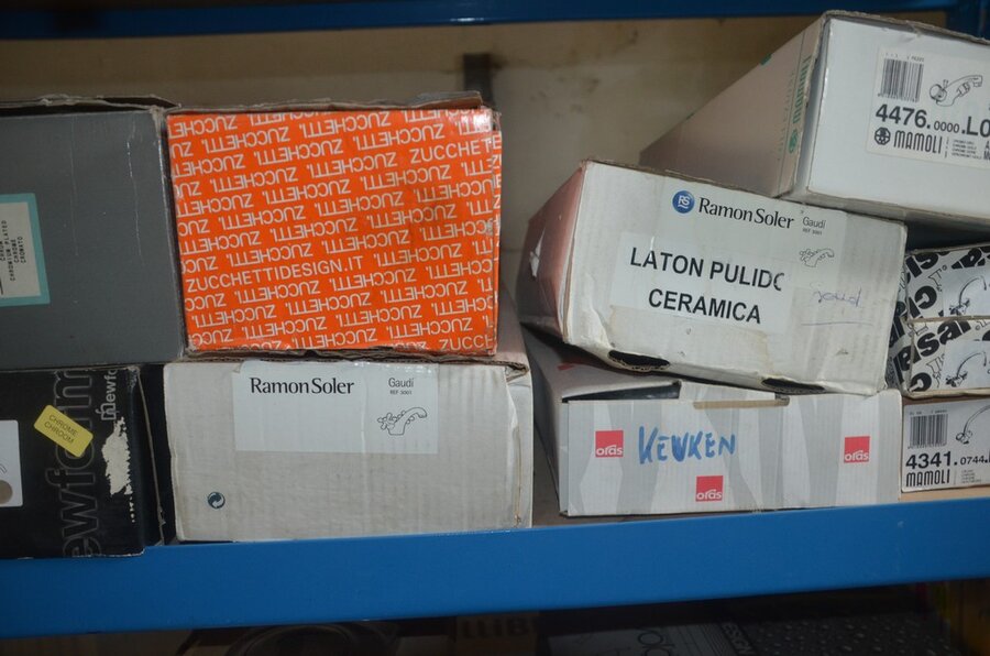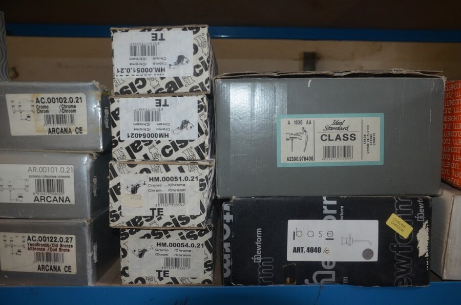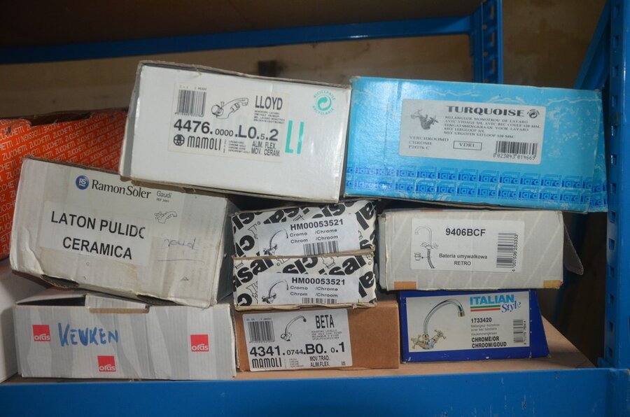 32 Diverse keuken- en badkamerkranen, 6 sifons, 2 pvc bakken met sifon aansluitingen, 15 handdoekrekken