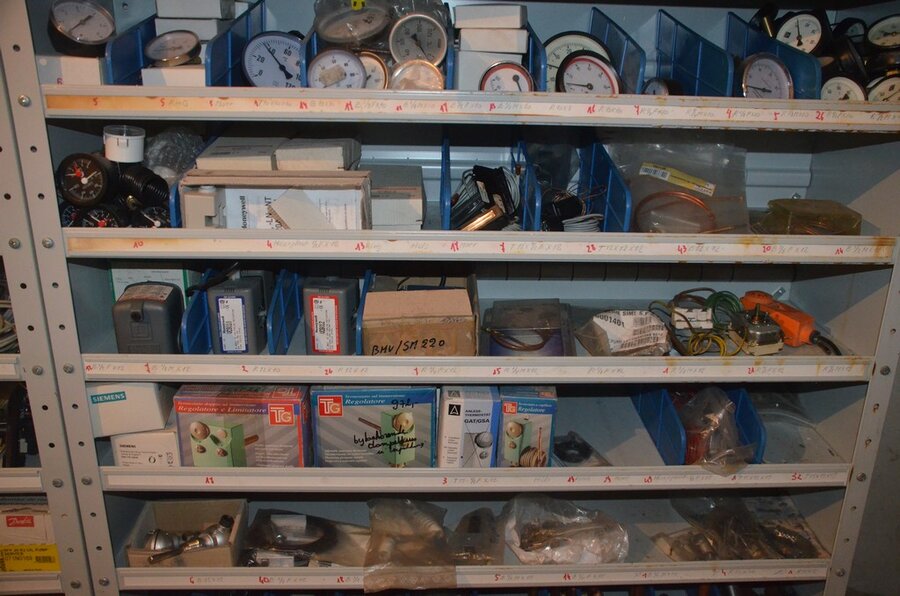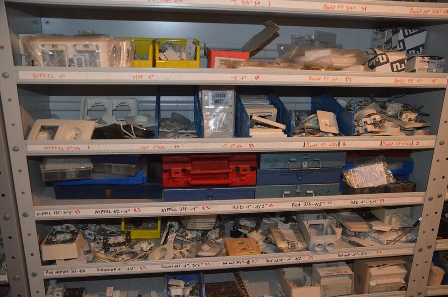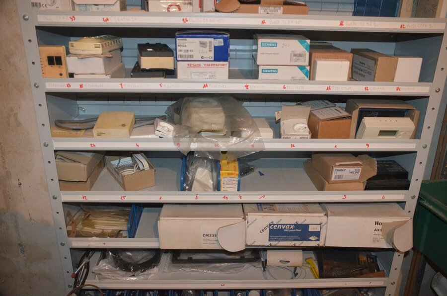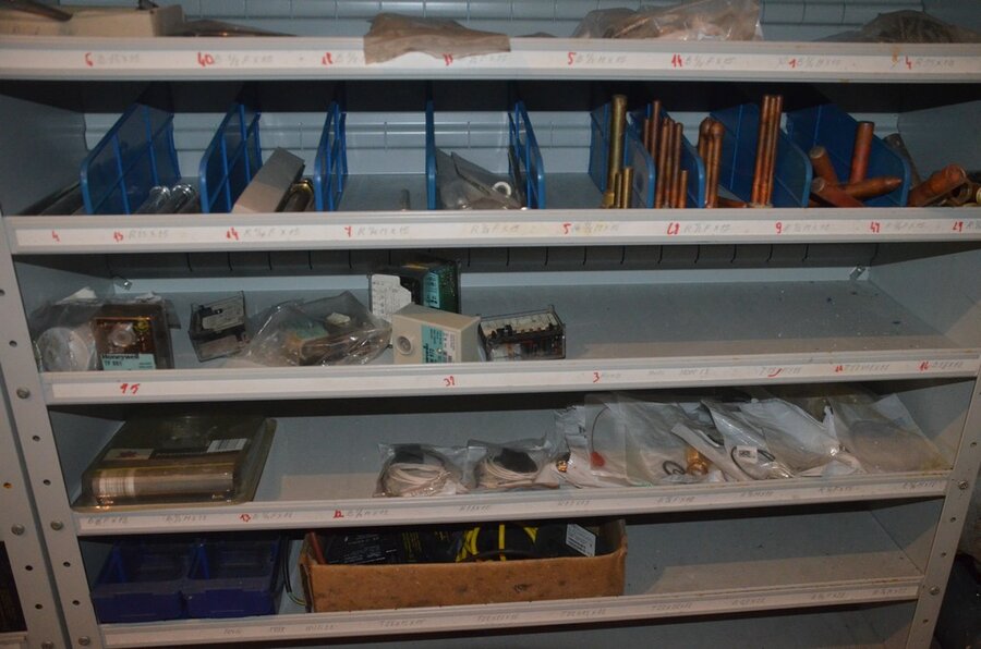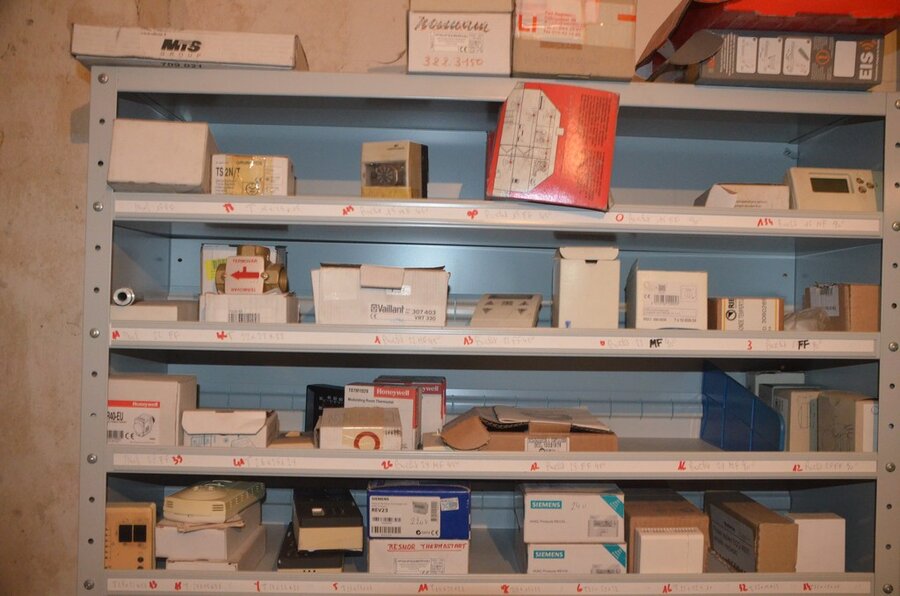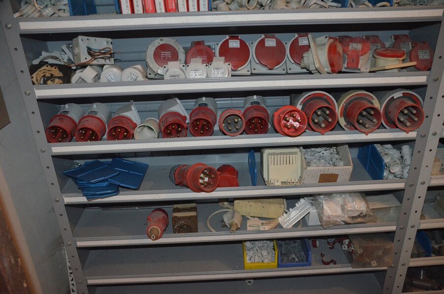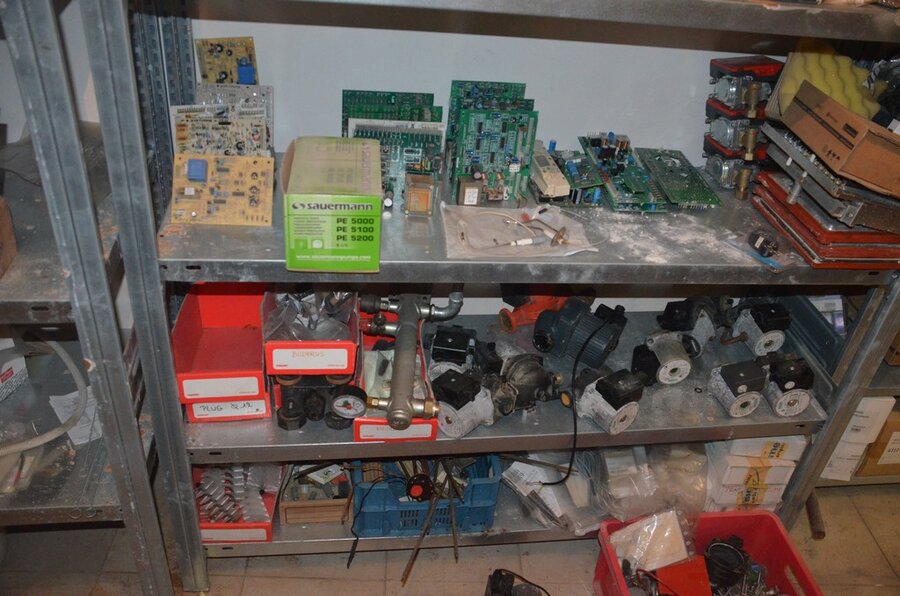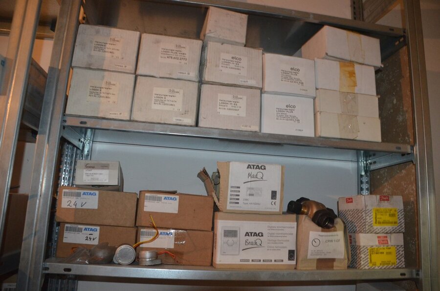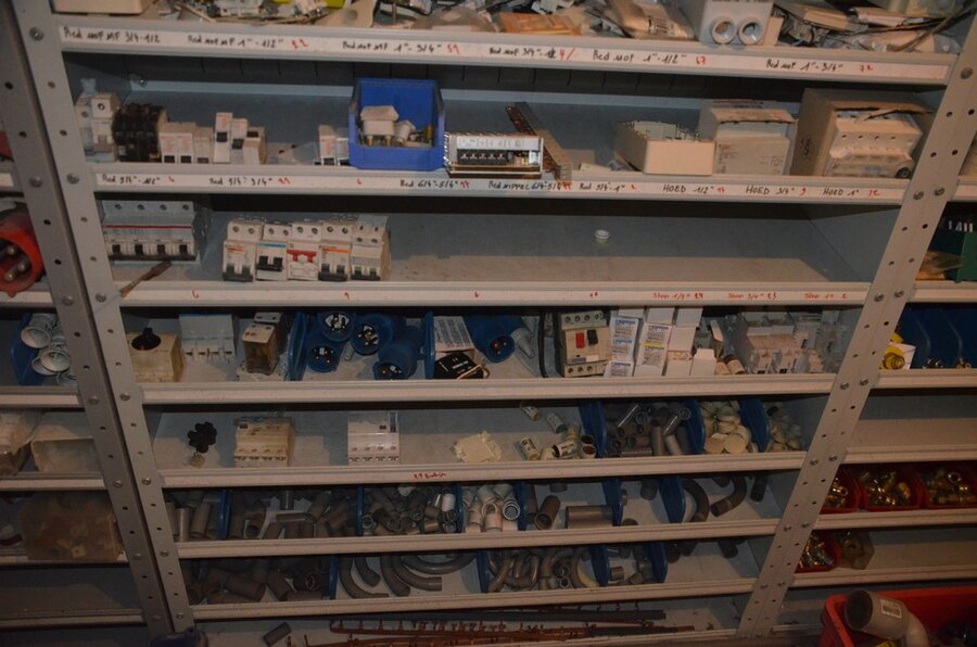 5 Metalen rekken 13 leggers afm. 100x200x20 met inhoud w.o. stekkers, stopcontacten, zekeringen, thermostaten, koppelingen, pompen, drukmeters, 3 metalen rekken 8 leggers met inhoud w.o. Printplaten, thermostaten