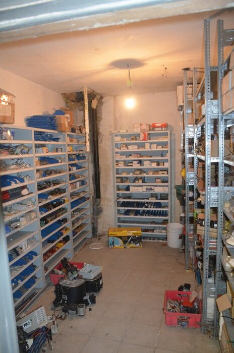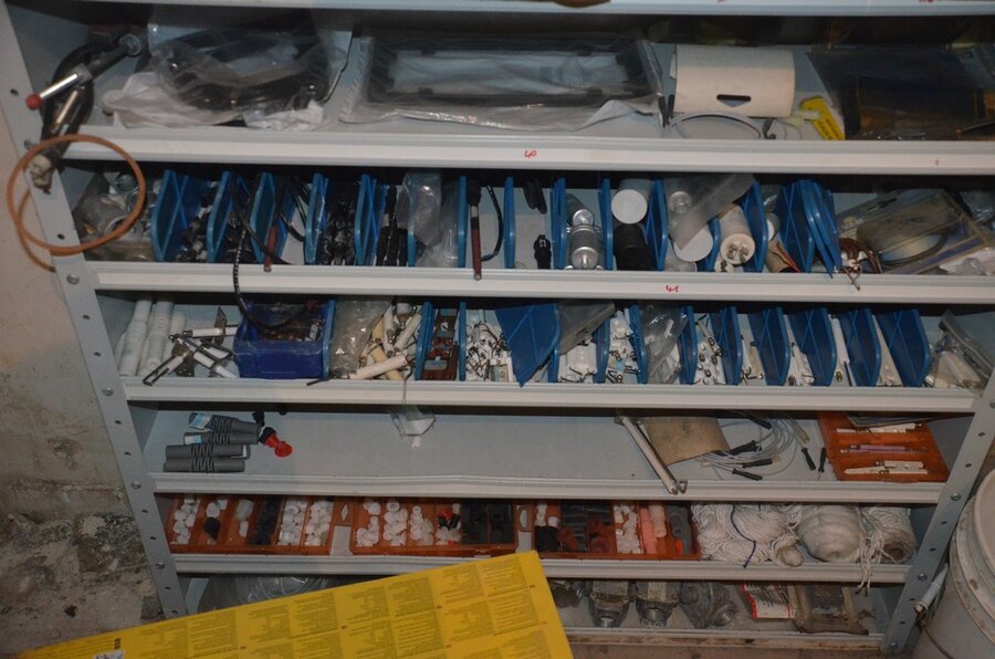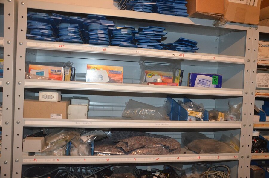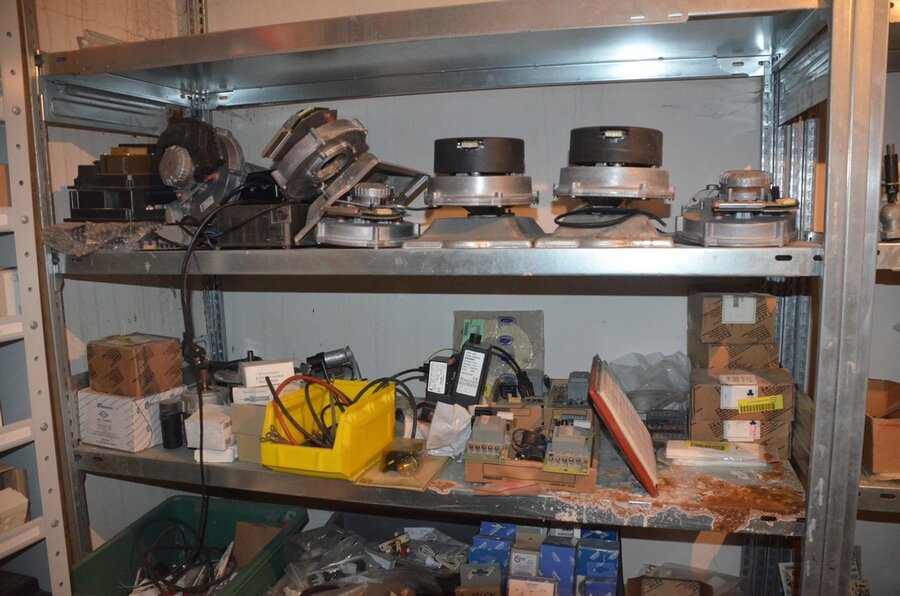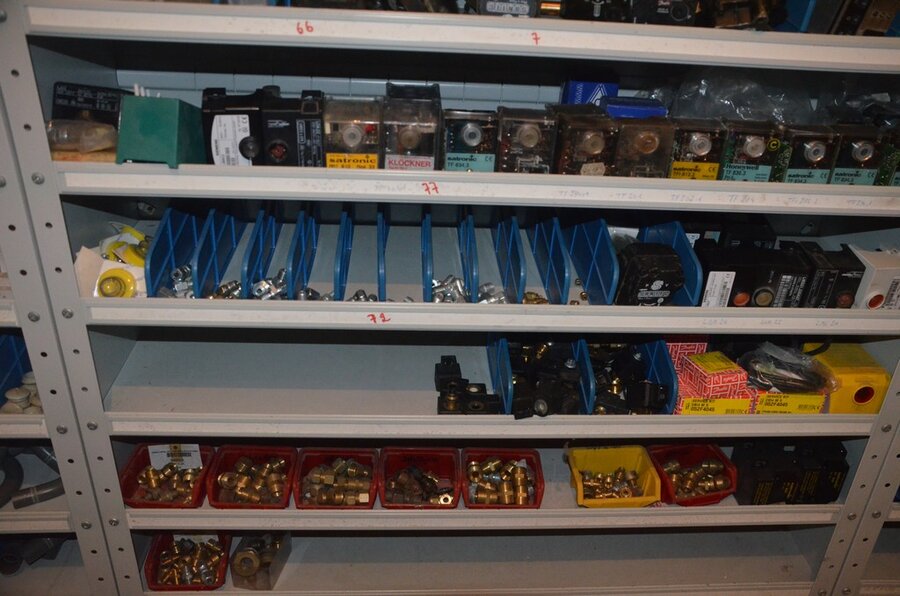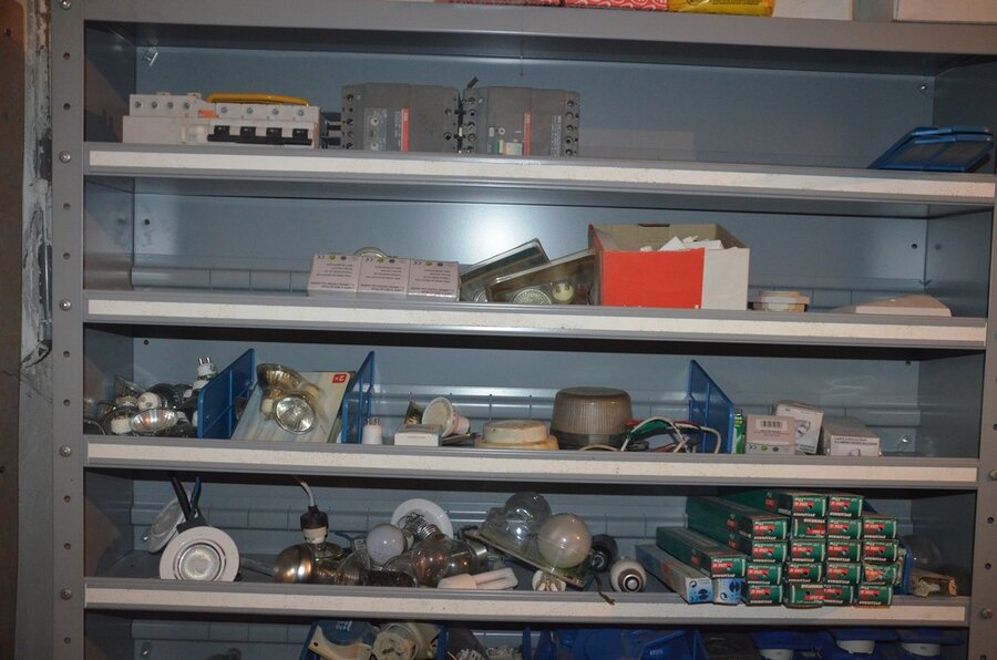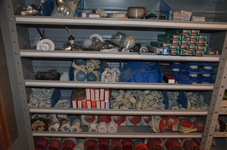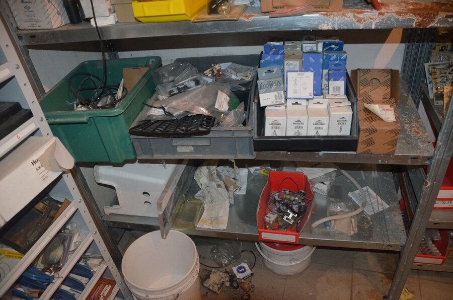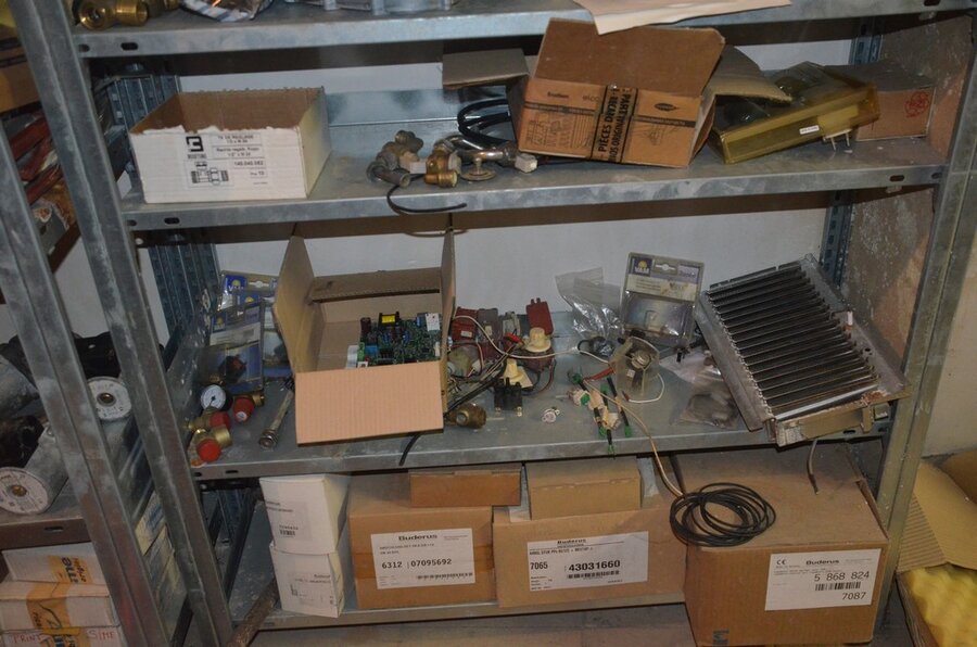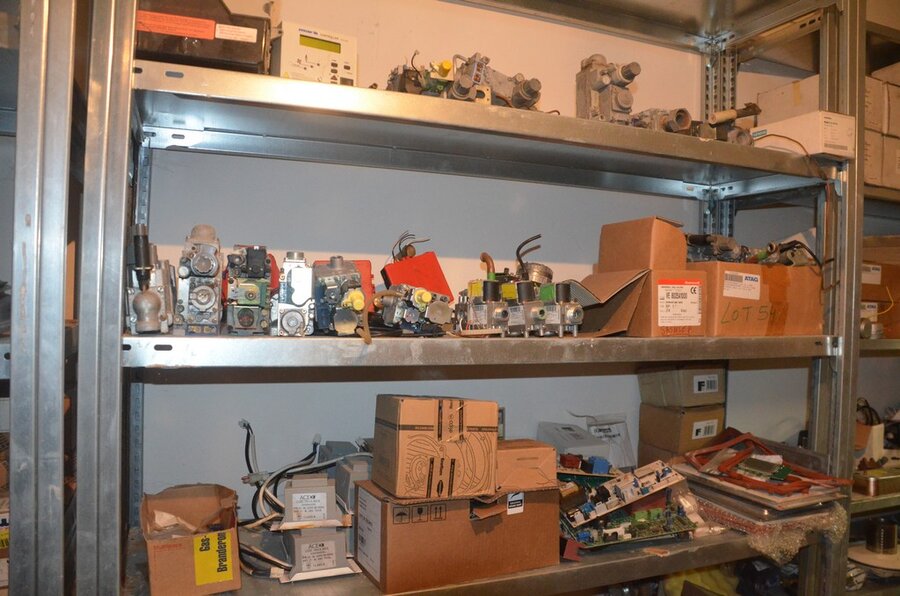 5 Metalen rekken 13 leggers afm. 100x200x20 met inhoud w.o. stekkers, stopcontacten, zekeringen, thermostaten, koppelingen, pompen, drukmeters, 3 metalen rekken 8 leggers met inhoud w.o. Printplaten, thermostaten