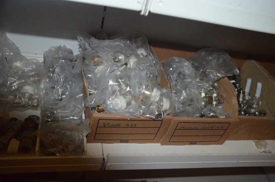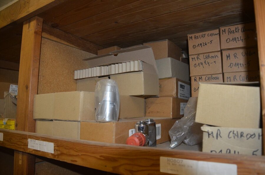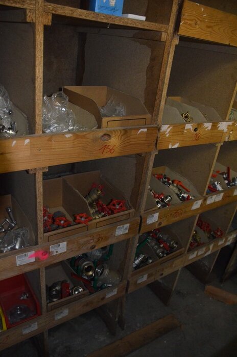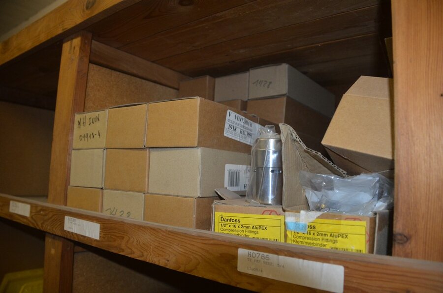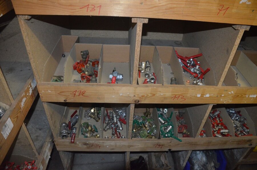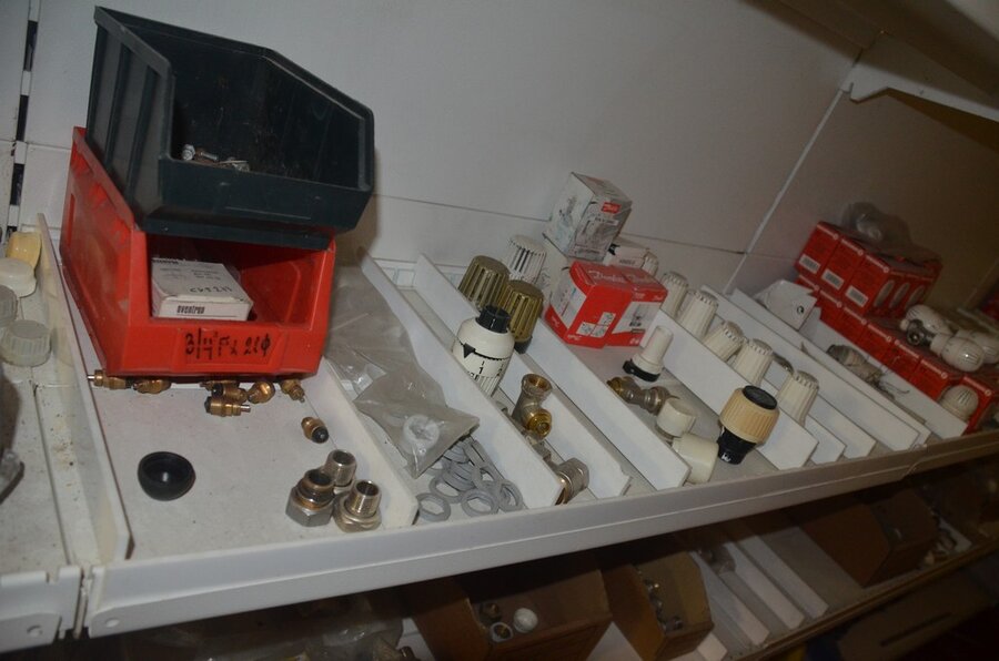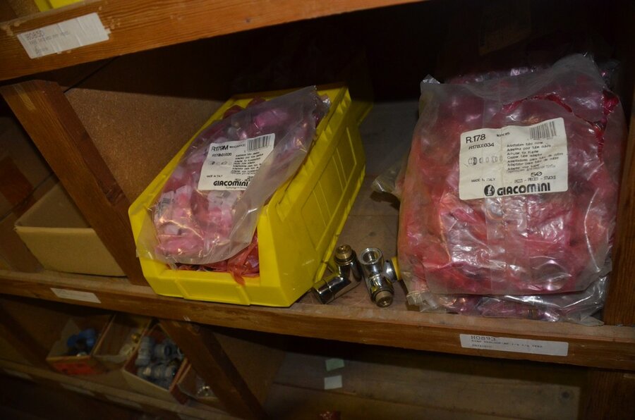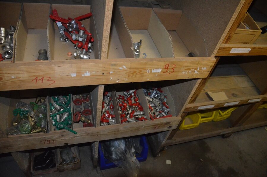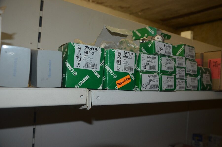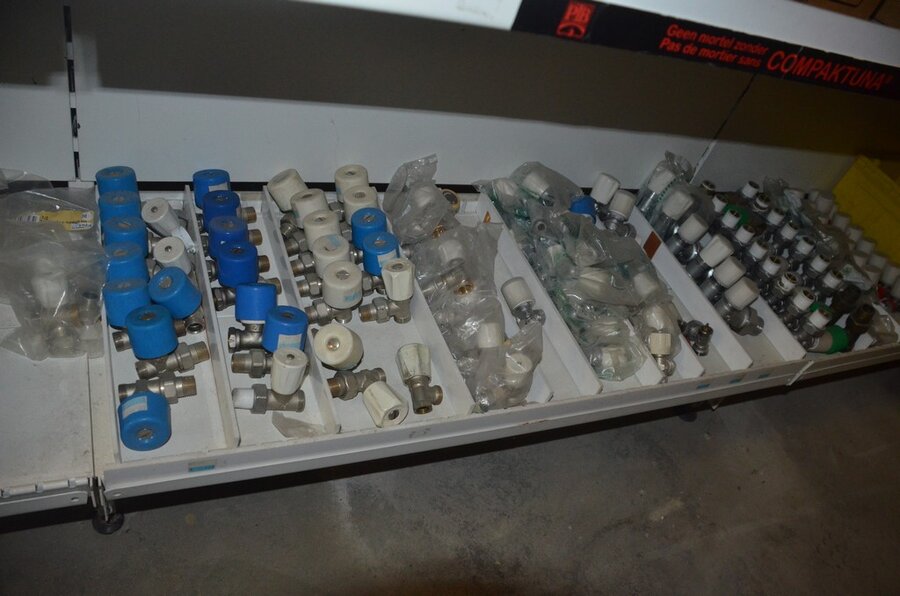 Houten vakkenrek 7,30m met inhoud w.o. koppelingen, kranen, flexibuizen , metalen rek 53 met inhoud w.o. thermostatische radiatorkranen, koppelingen, kranen, enz