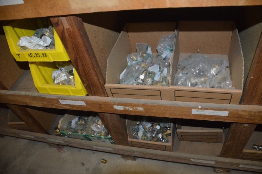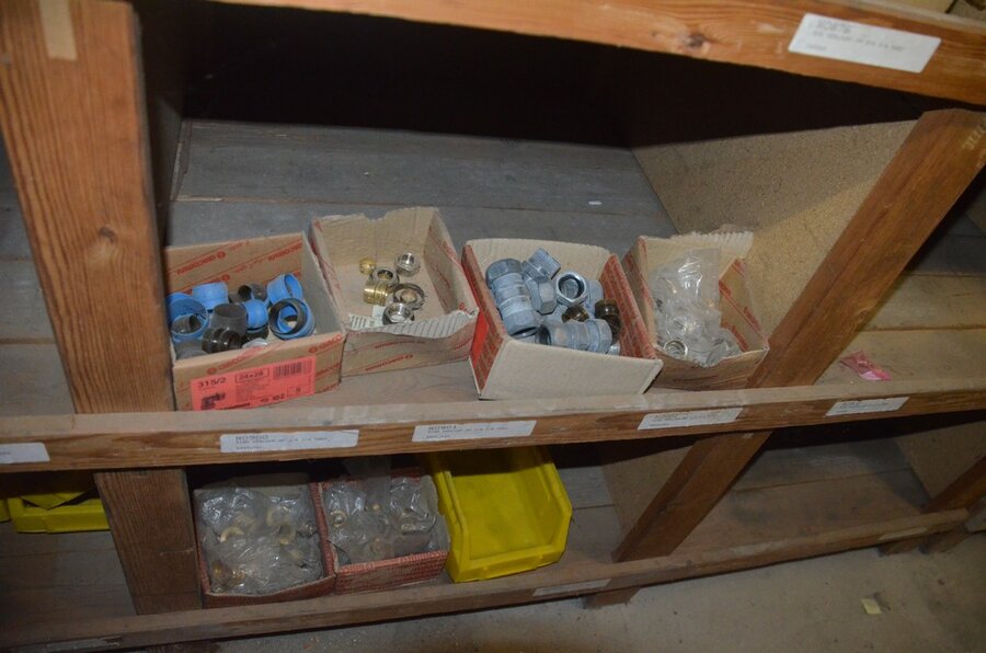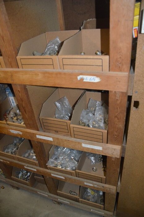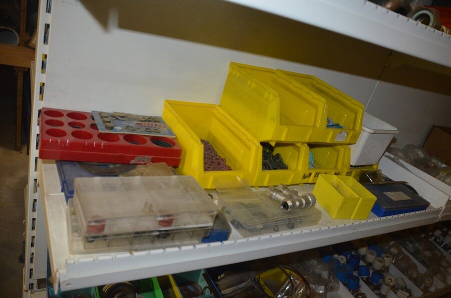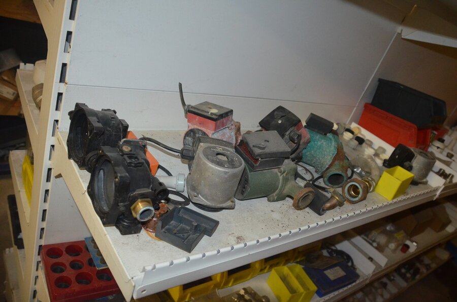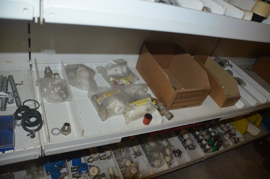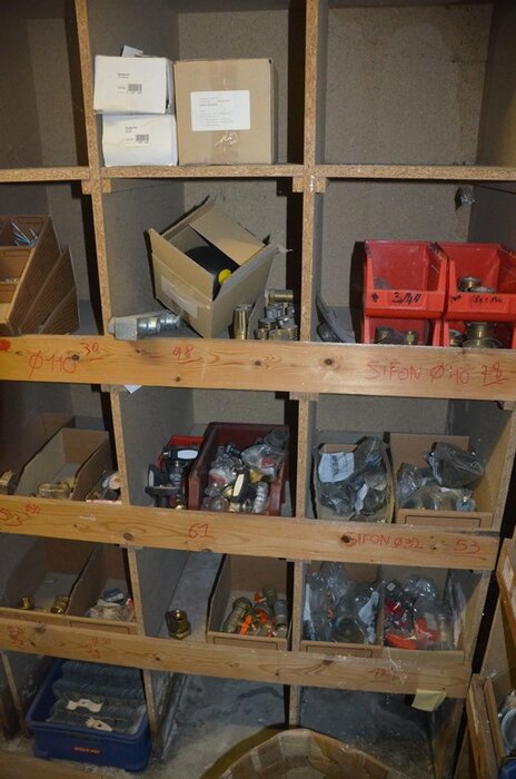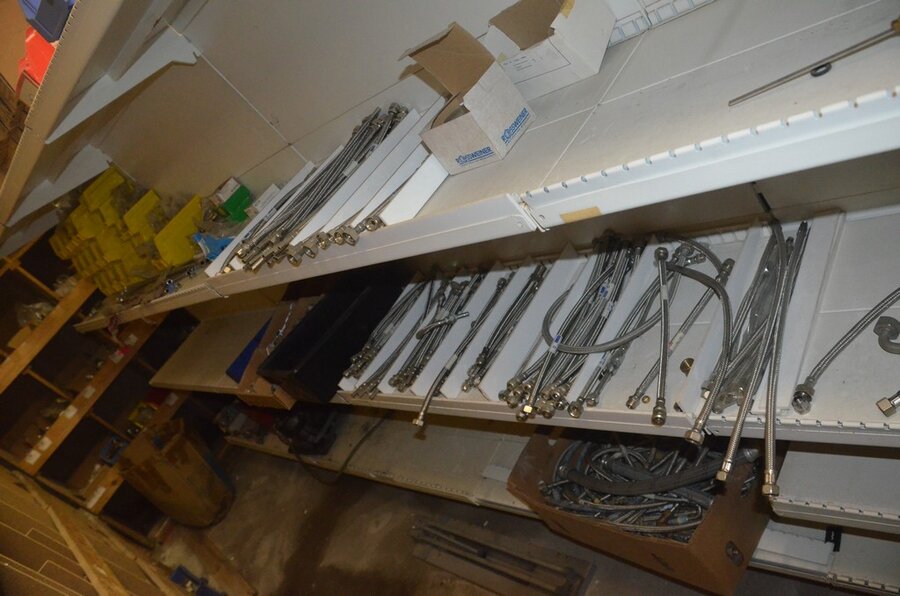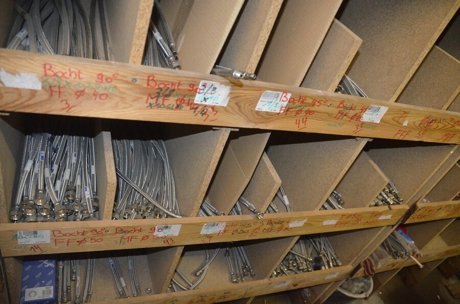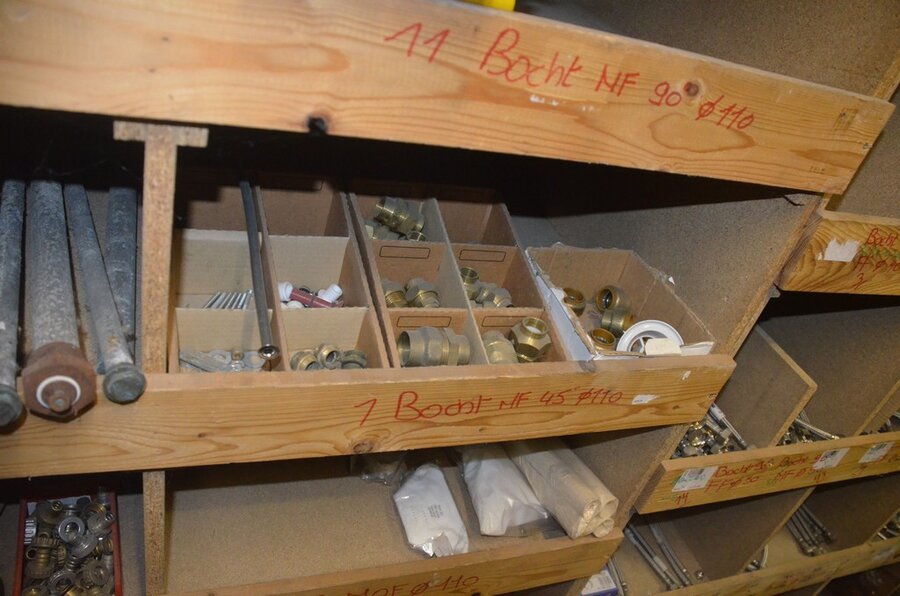 Houten vakkenrek 7,30m met inhoud w.o. koppelingen, kranen, flexibuizen , metalen rek 53 met inhoud w.o. thermostatische radiatorkranen, koppelingen, kranen, enz