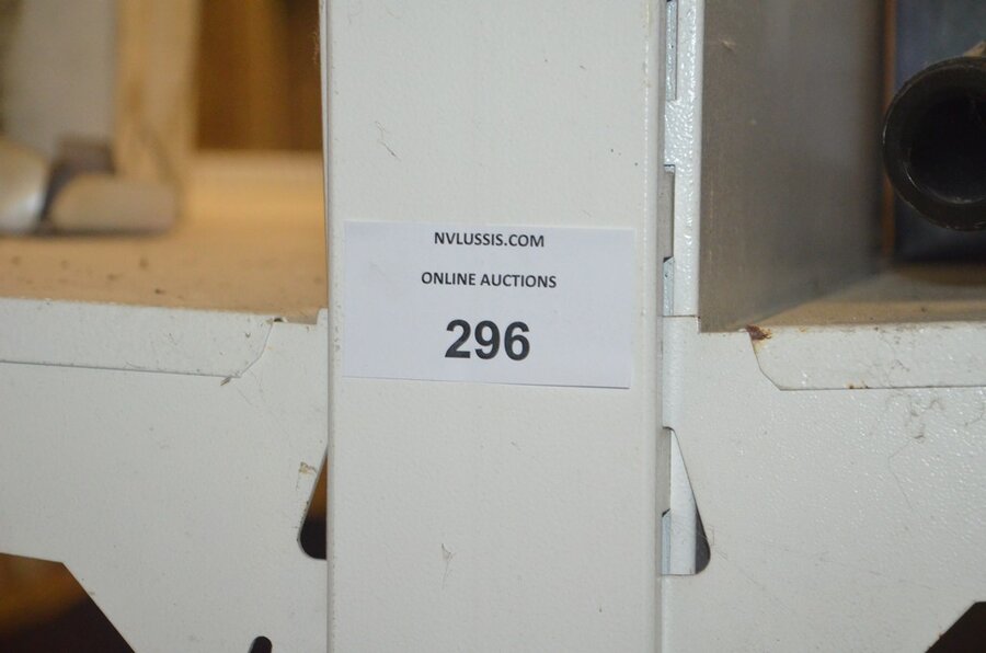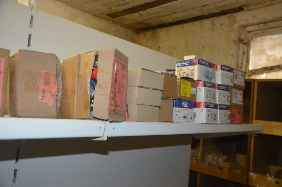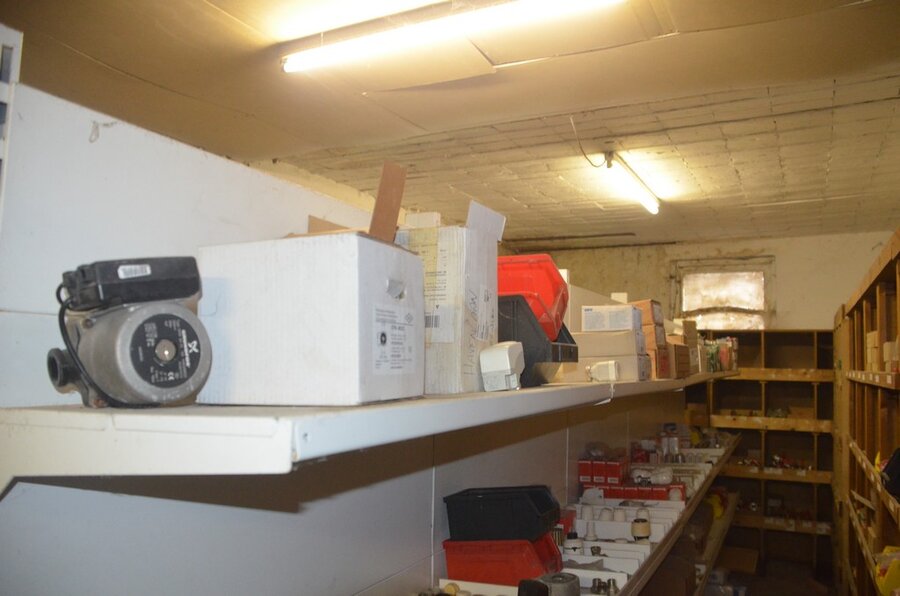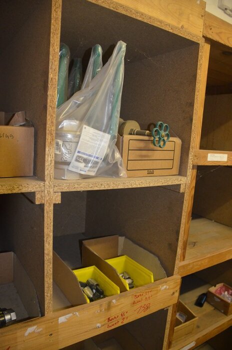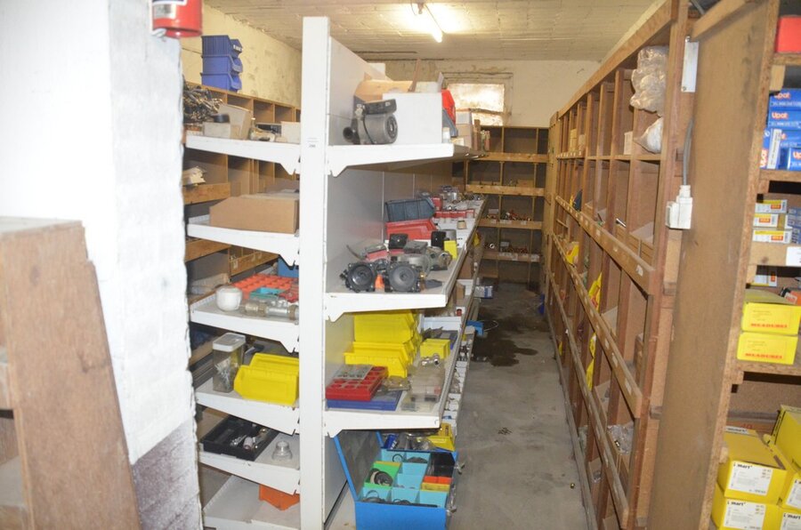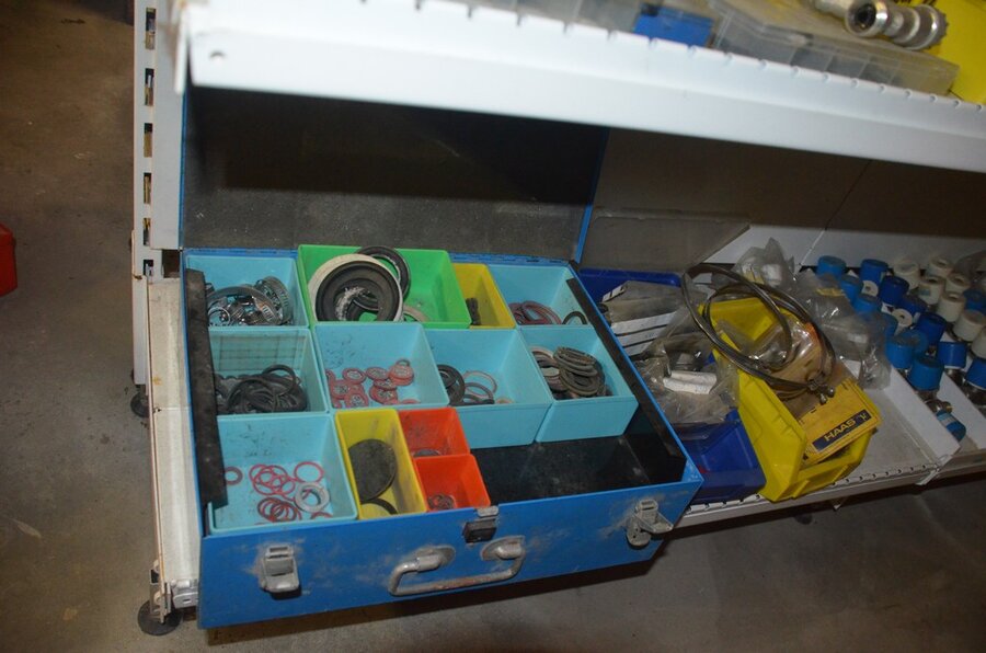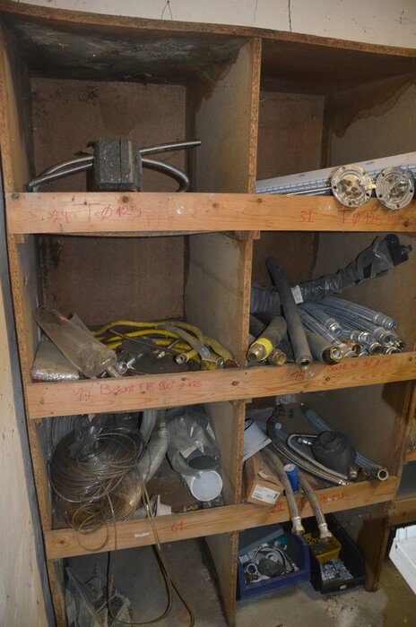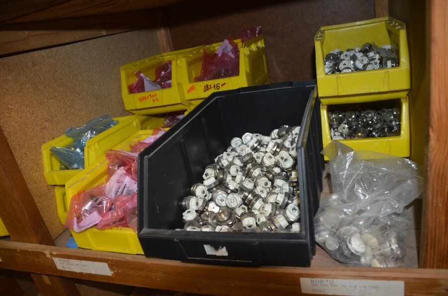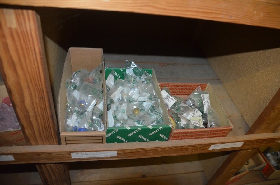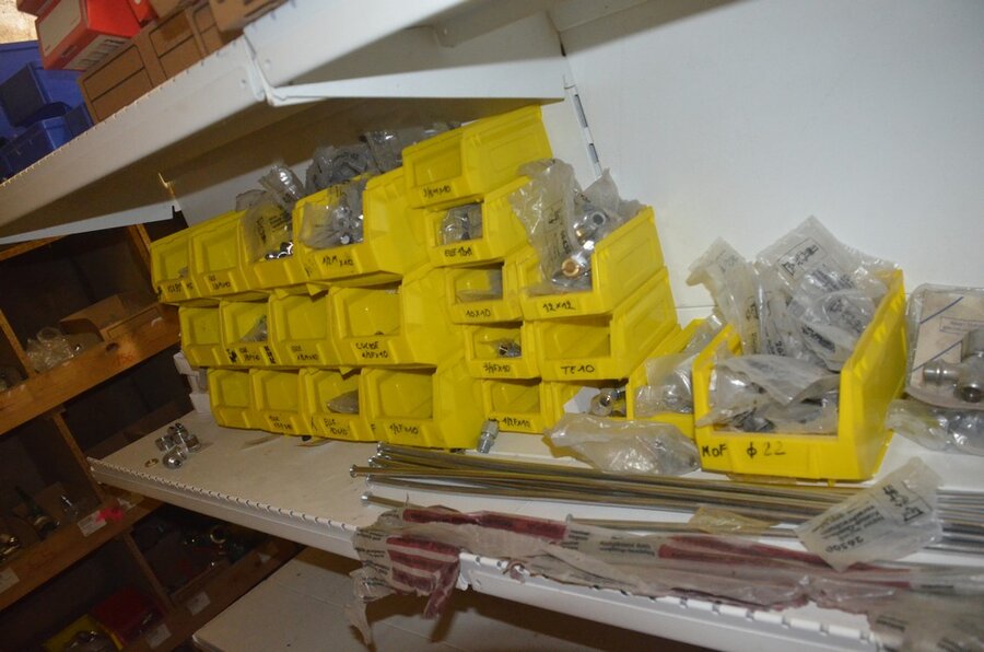 Houten vakkenrek 7,30m met inhoud w.o. koppelingen, kranen, flexibuizen , metalen rek 53 met inhoud w.o. thermostatische radiatorkranen, koppelingen, kranen, enz