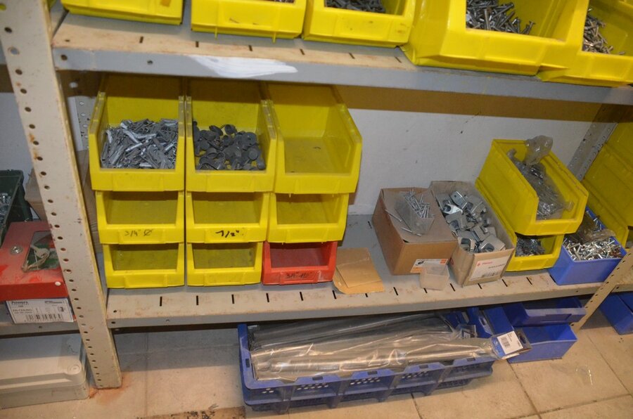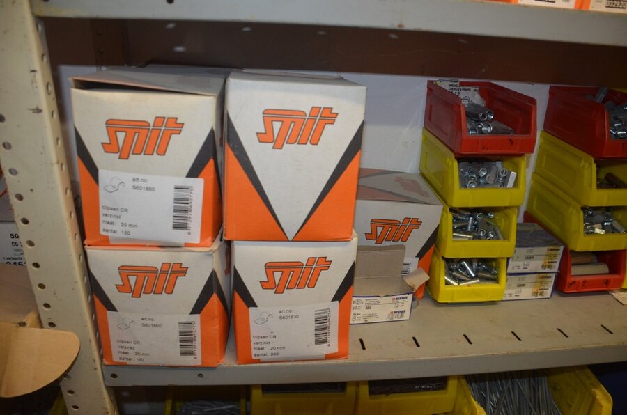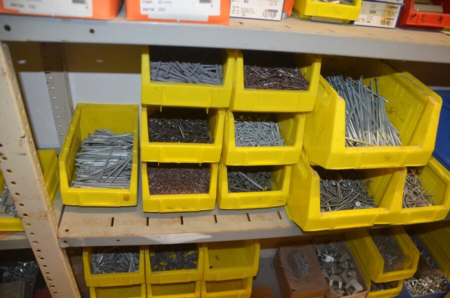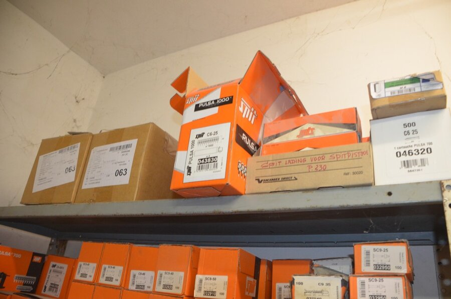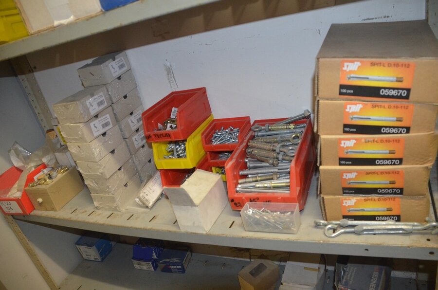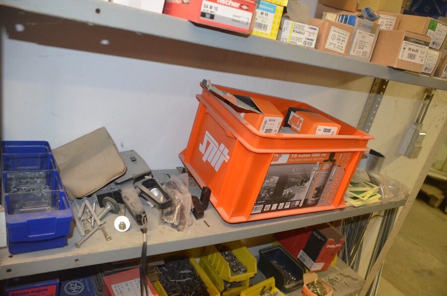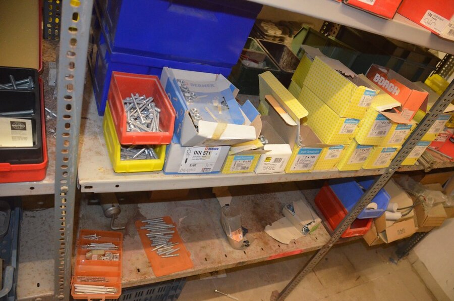 metalen rek 3,60m 15 leggers met inhoud w.o. schroeven, bouten, nagels, clips SPIT, 2 houten kasten