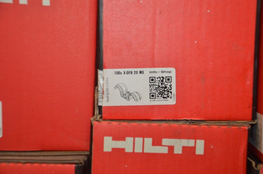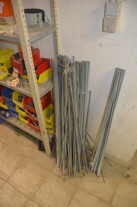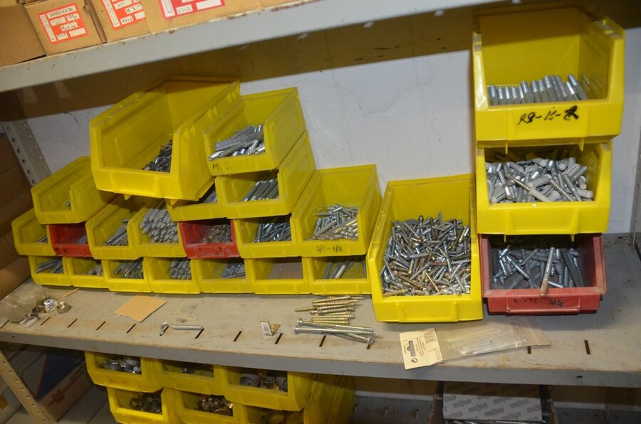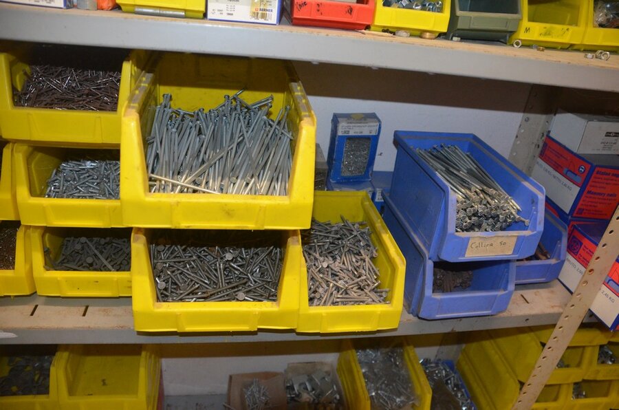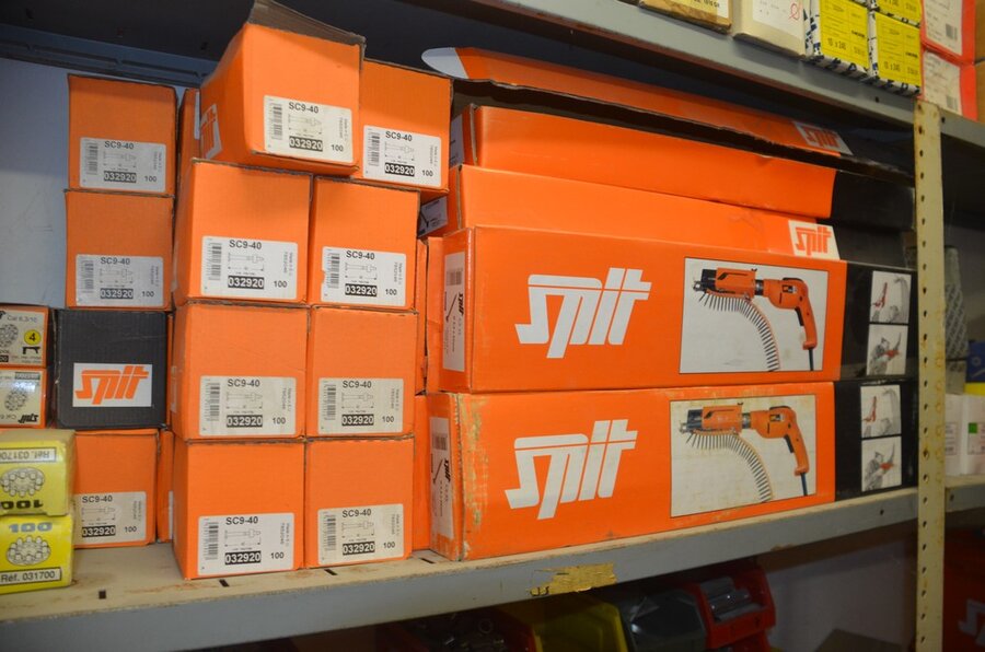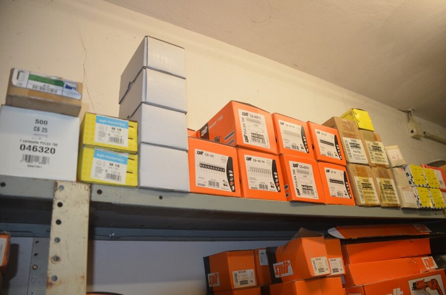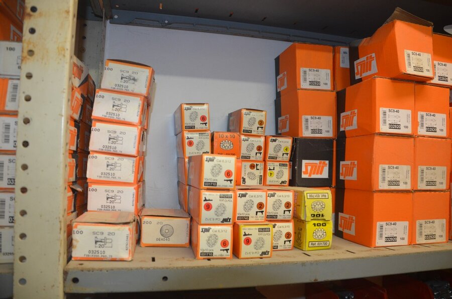 metalen rek 3,60m 15 leggers met inhoud w.o. schroeven, bouten, nagels, clips SPIT, 2 houten kasten