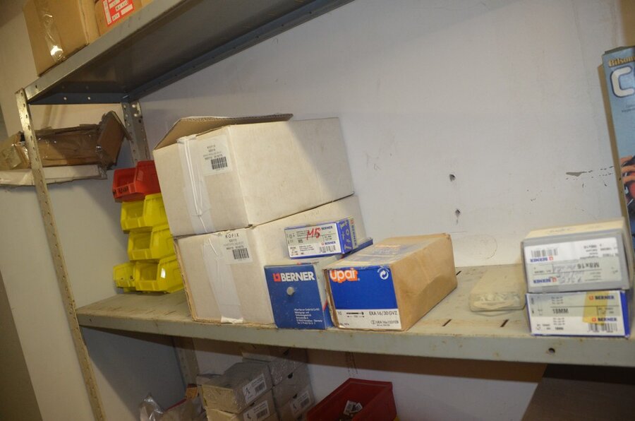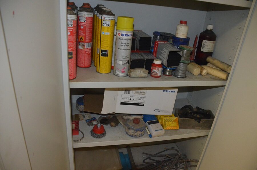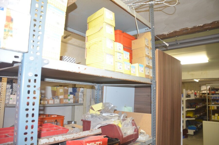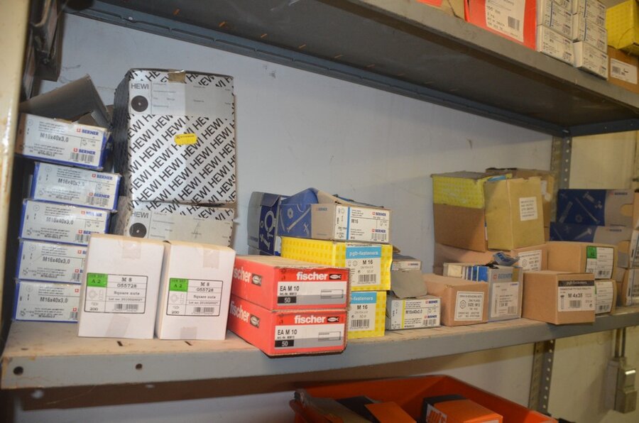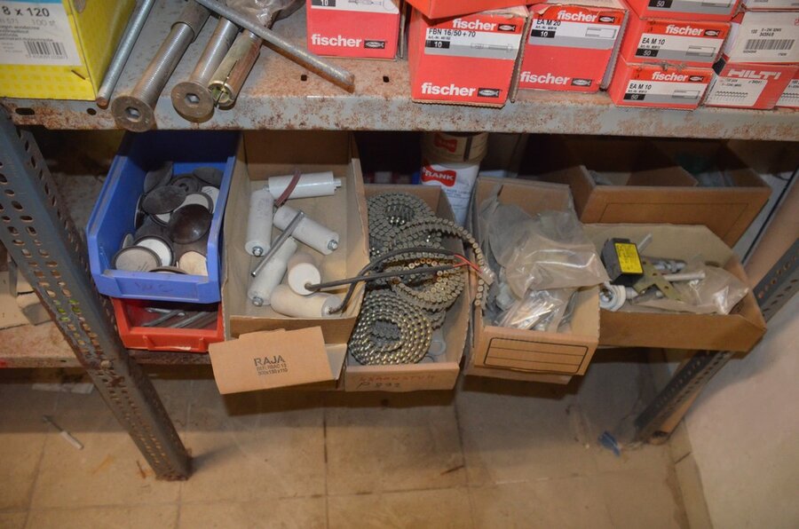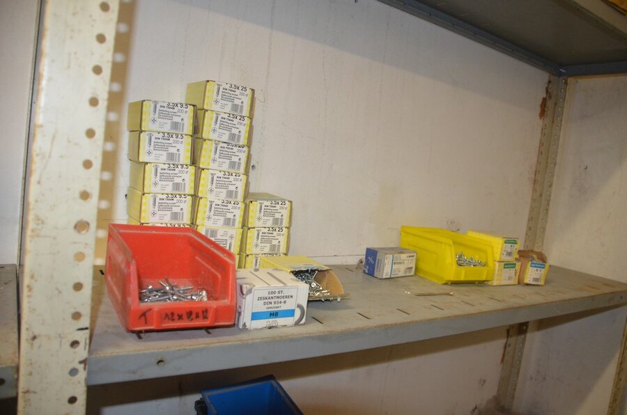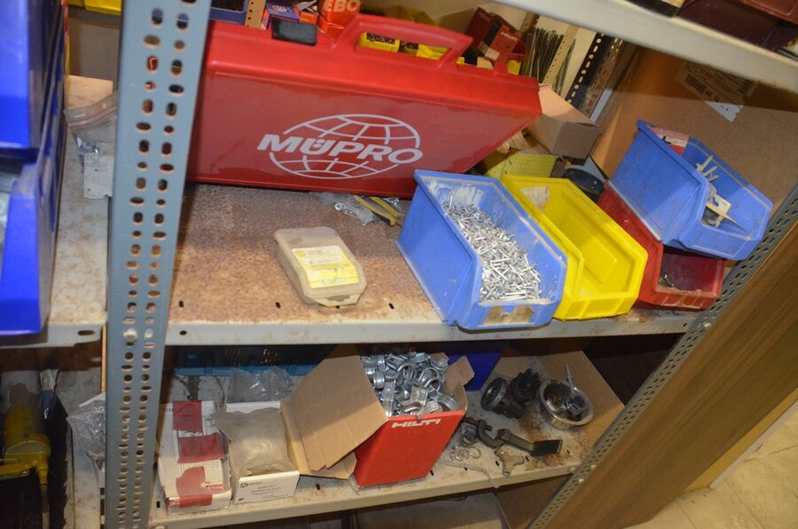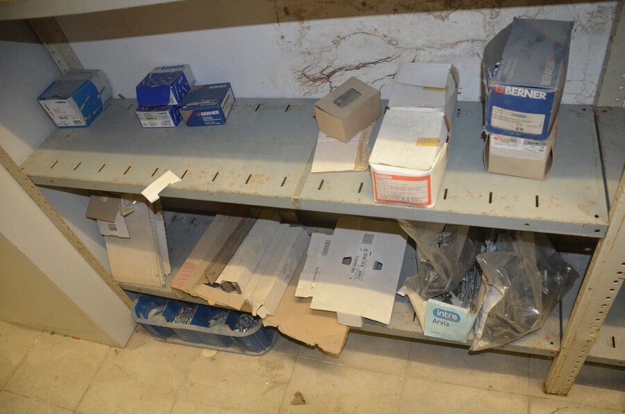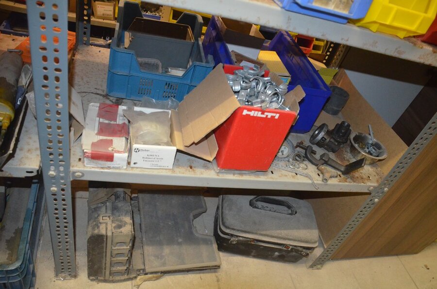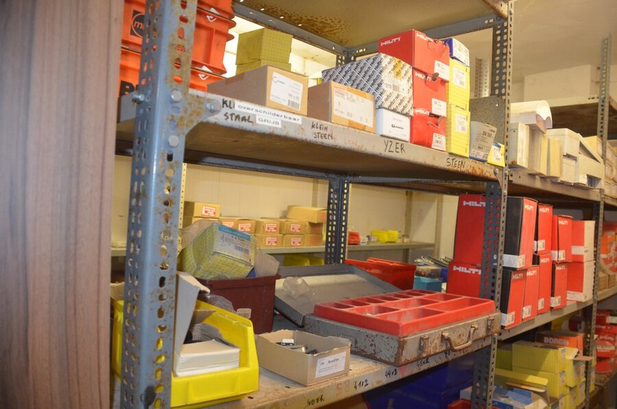 Metalen archiefkast 2 deuren 5 leggers met inhoud w.o. EHBO, soldeerdraad, flux, loctite, popaan, metalen rek afm. 3,60m 15 leggers met inhoud w.o. schroeven,bouten,nagels, metalen rek 3m 14 leggers met inhoud w.o. schroeven, bouten, plugs HILTI,