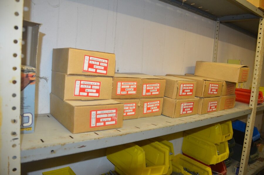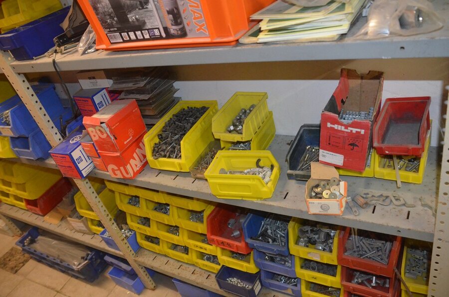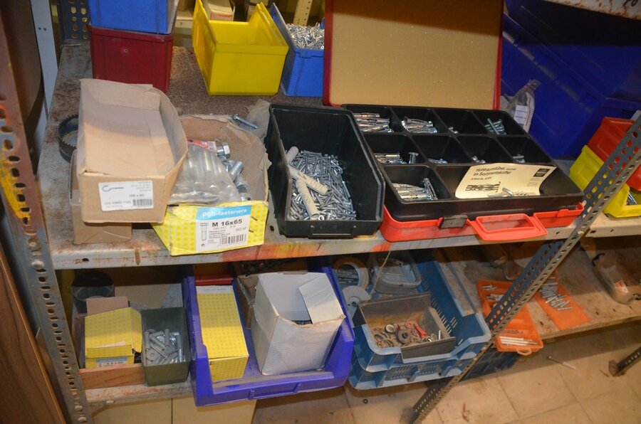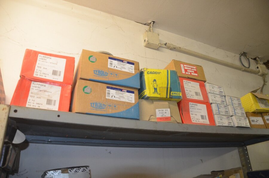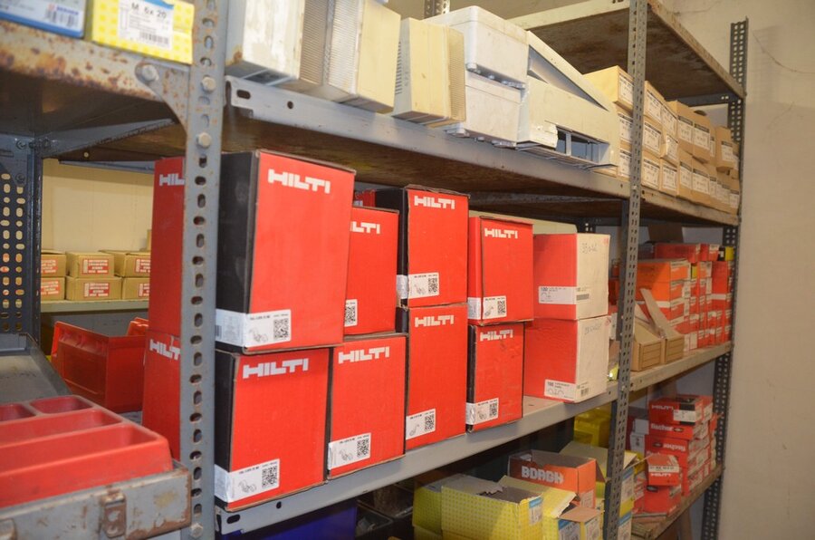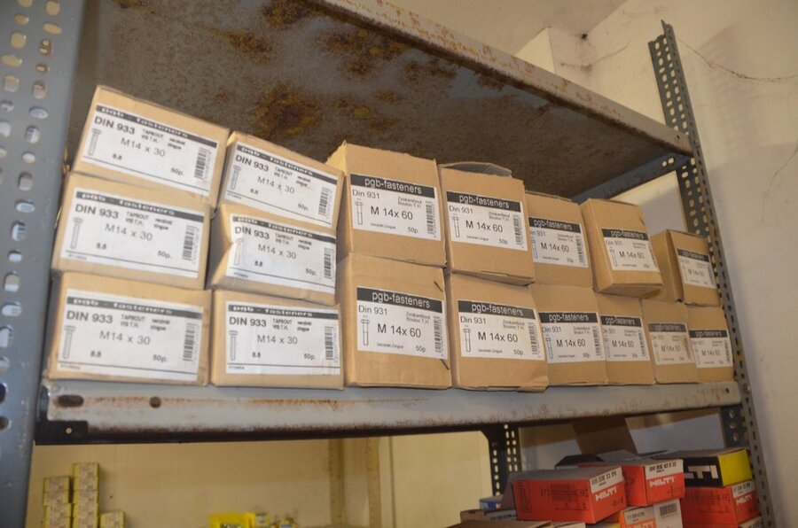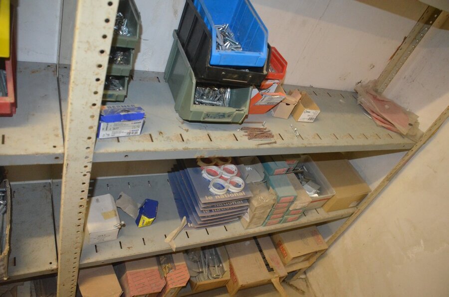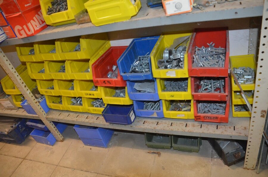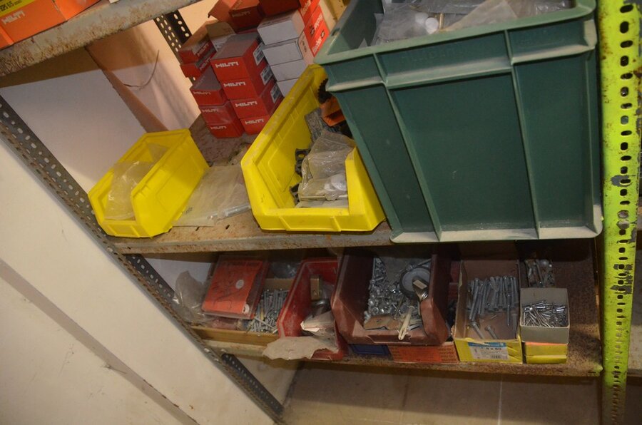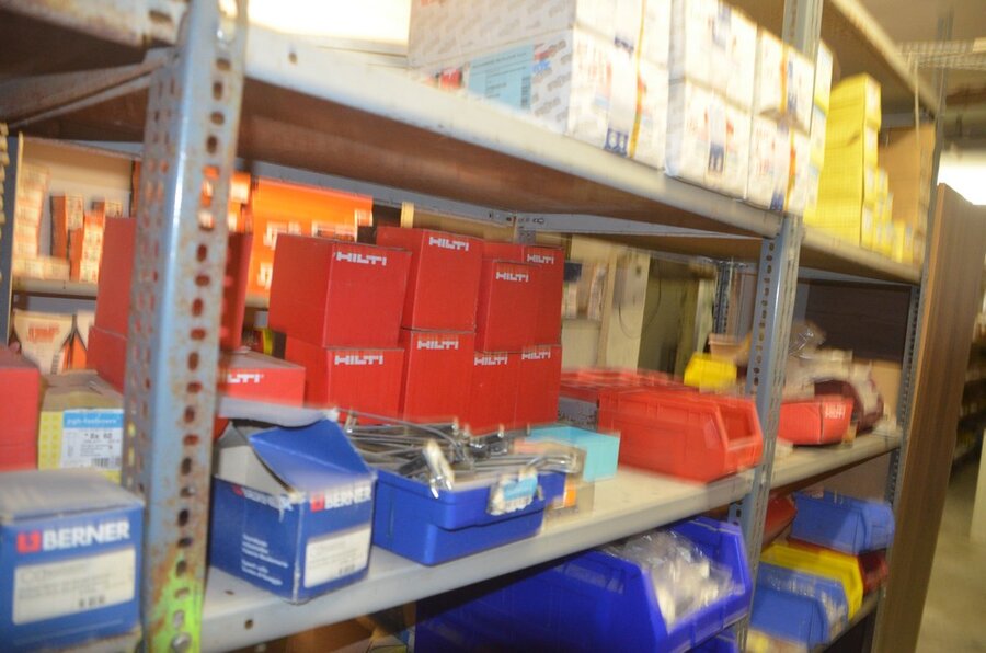 Metalen archiefkast 2 deuren 5 leggers met inhoud w.o. EHBO, soldeerdraad, flux, loctite, popaan, metalen rek afm. 3,60m 15 leggers met inhoud w.o. schroeven,bouten,nagels, metalen rek 3m 14 leggers met inhoud w.o. schroeven, bouten, plugs HILTI,