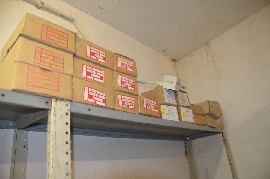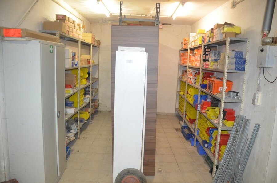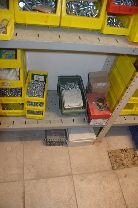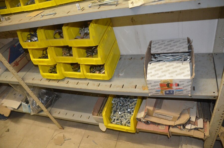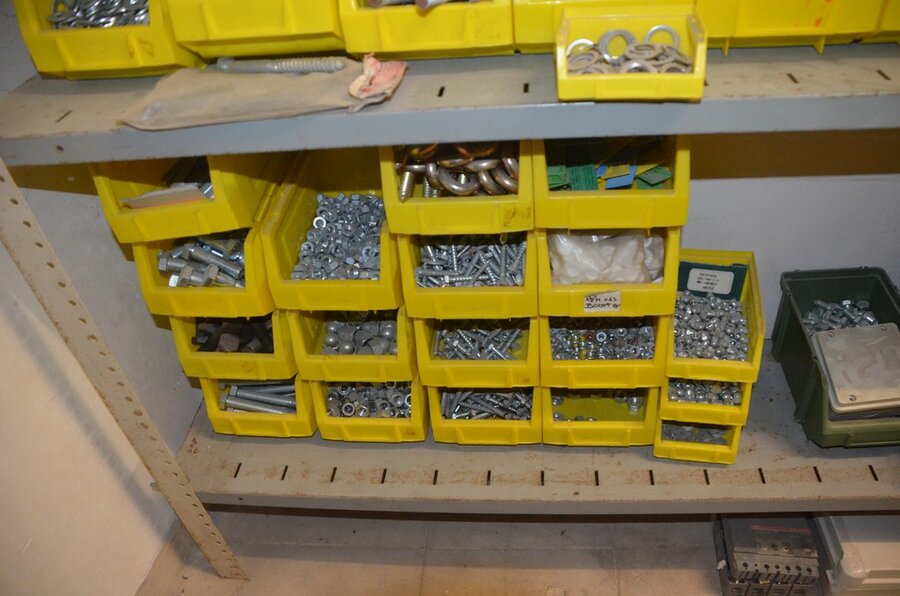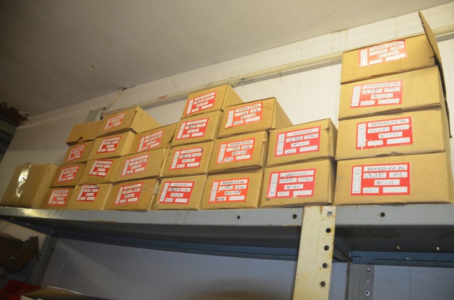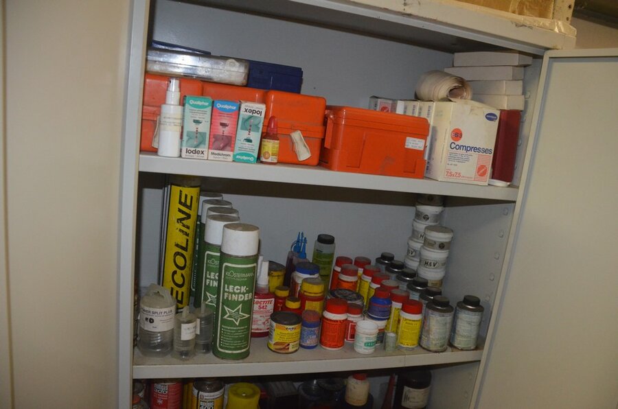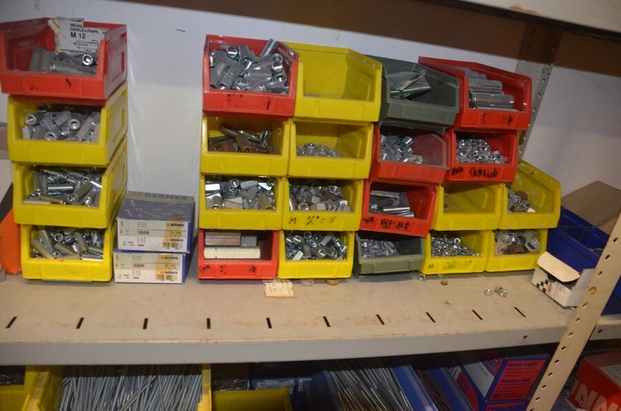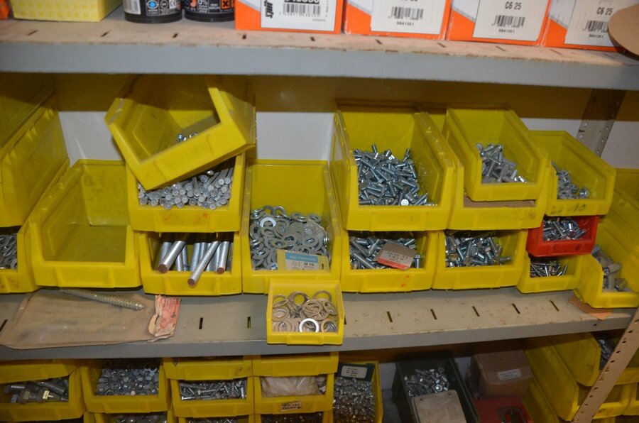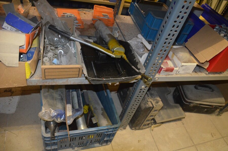 Metalen archiefkast 2 deuren 5 leggers met inhoud w.o. EHBO, soldeerdraad, flux, loctite, popaan, metalen rek afm. 3,60m 15 leggers met inhoud w.o. schroeven,bouten,nagels, metalen rek 3m 14 leggers met inhoud w.o. schroeven, bouten, plugs HILTI,