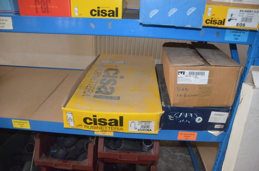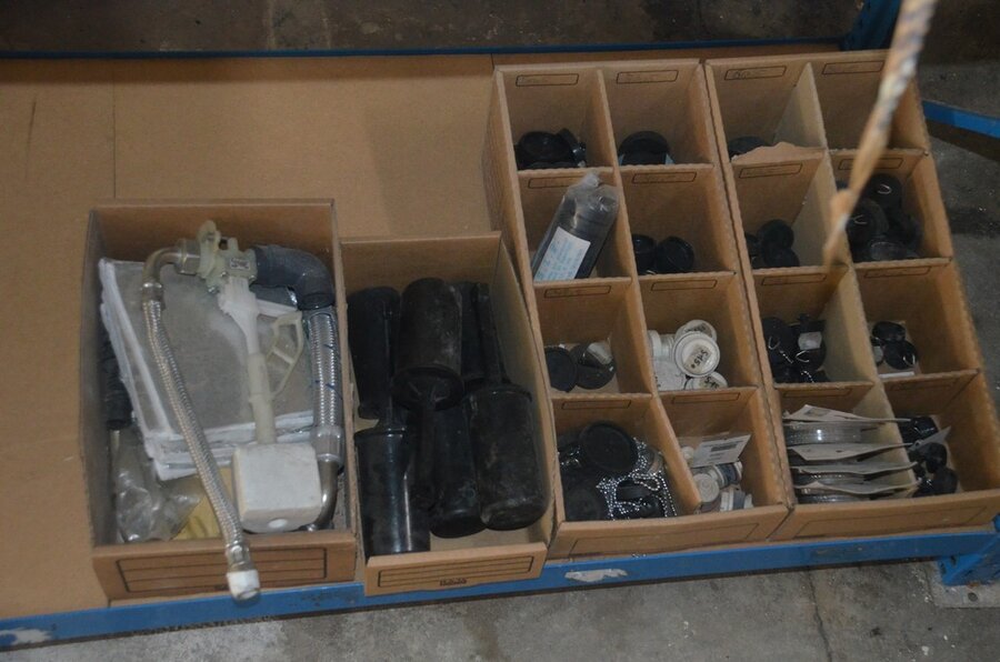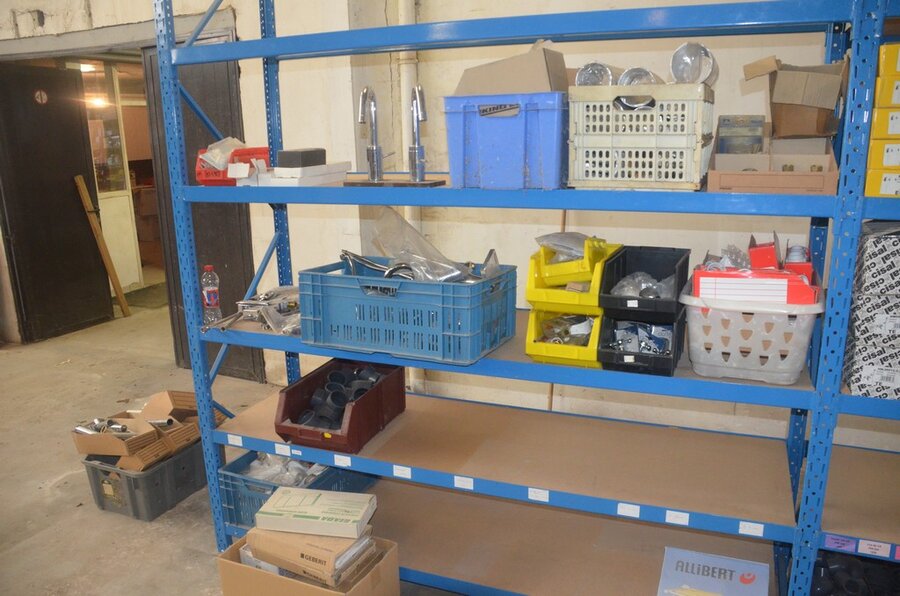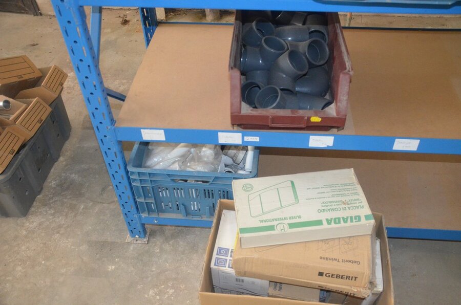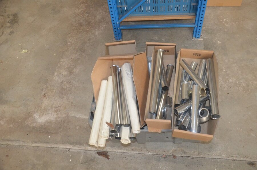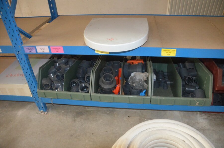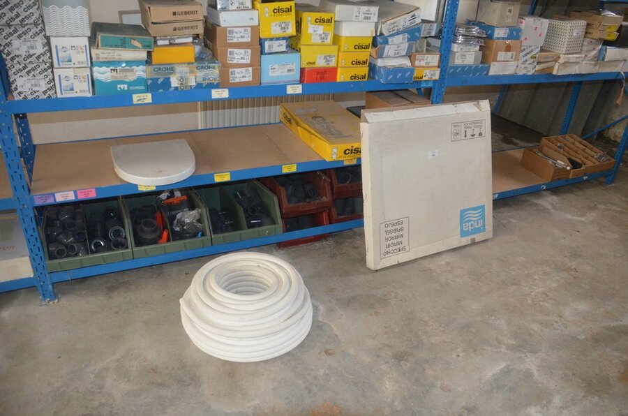 Palletrek bestaande uit 4 kopsteunen 2,40m x 0,60m en 24 dwarsbalken 2,1m , spiegel, 8 pvc bakken met pvc koppelstukken, 2 pvc bakken met sifons en afvoerputjes, pvc bak met buizen voor sifons, 15 kranen, 7 wc doorspoelkoppen, 10 doucheslangen, 9 afvoe