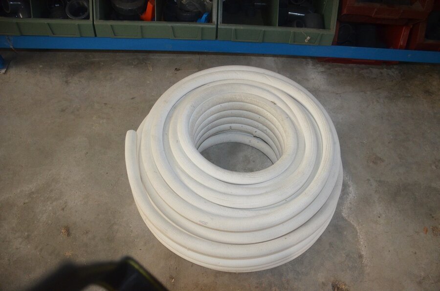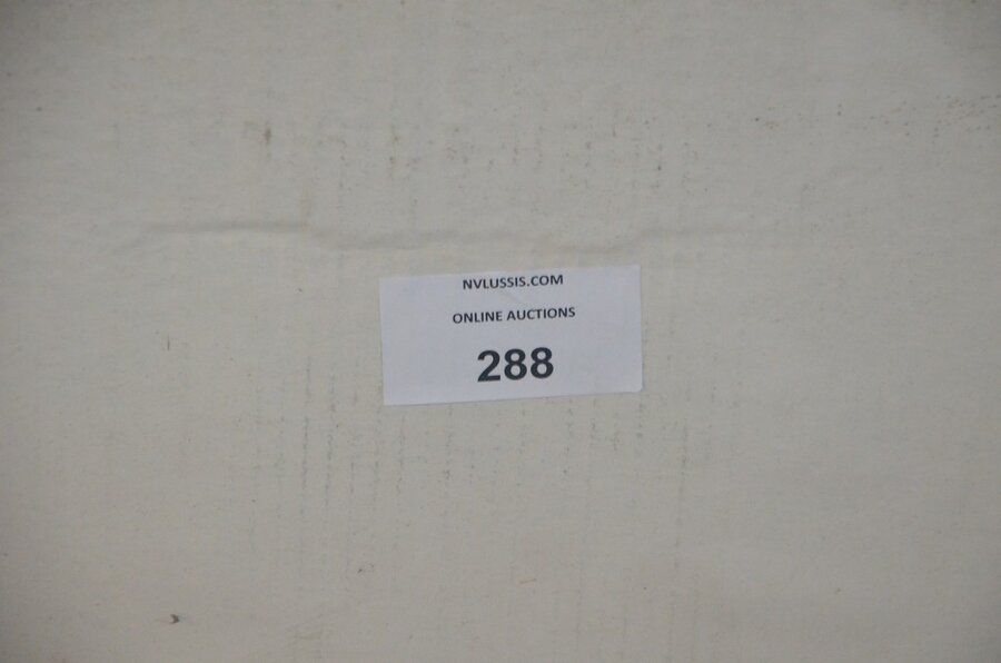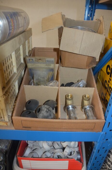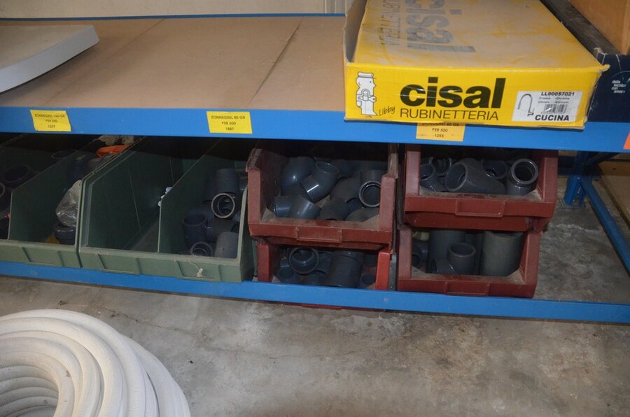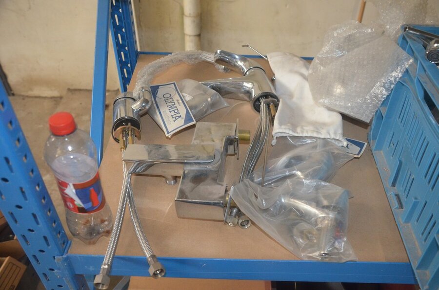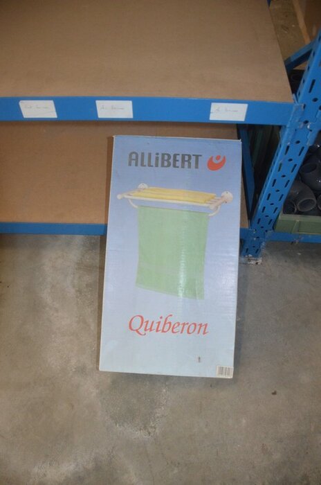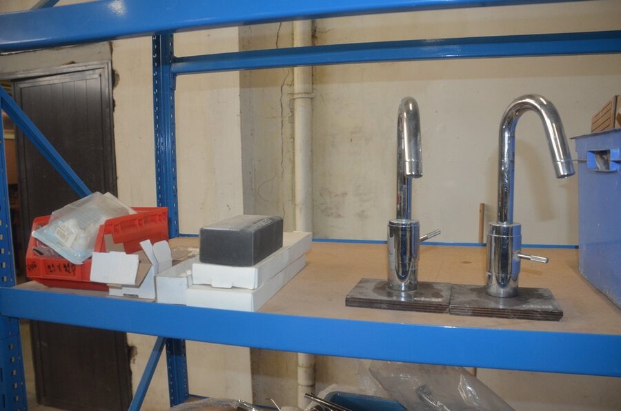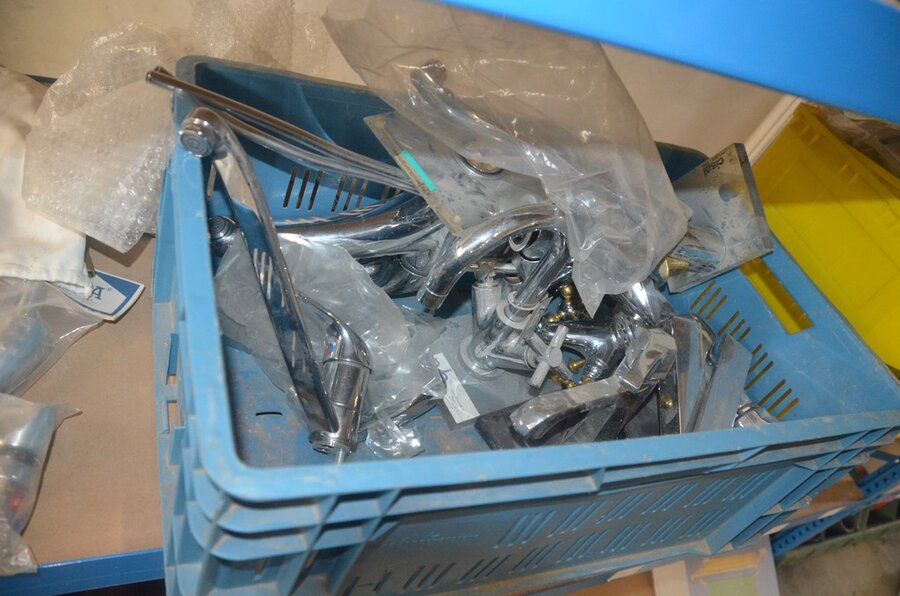 Palletrek bestaande uit 4 kopsteunen 2,40m x 0,60m en 24 dwarsbalken 2,1m , spiegel, 8 pvc bakken met pvc koppelstukken, 2 pvc bakken met sifons en afvoerputjes, pvc bak met buizen voor sifons, 15 kranen, 7 wc doorspoelkoppen, 10 doucheslangen, 9 afvoe