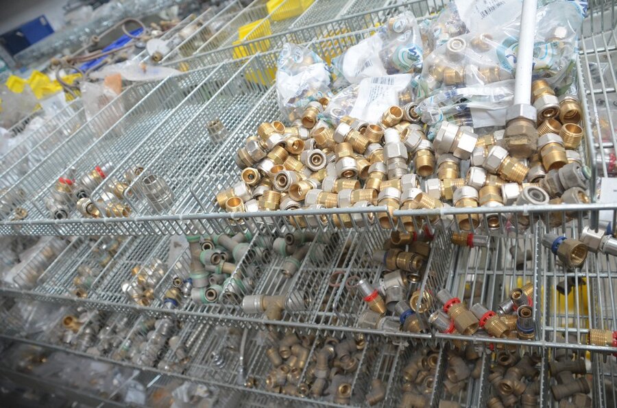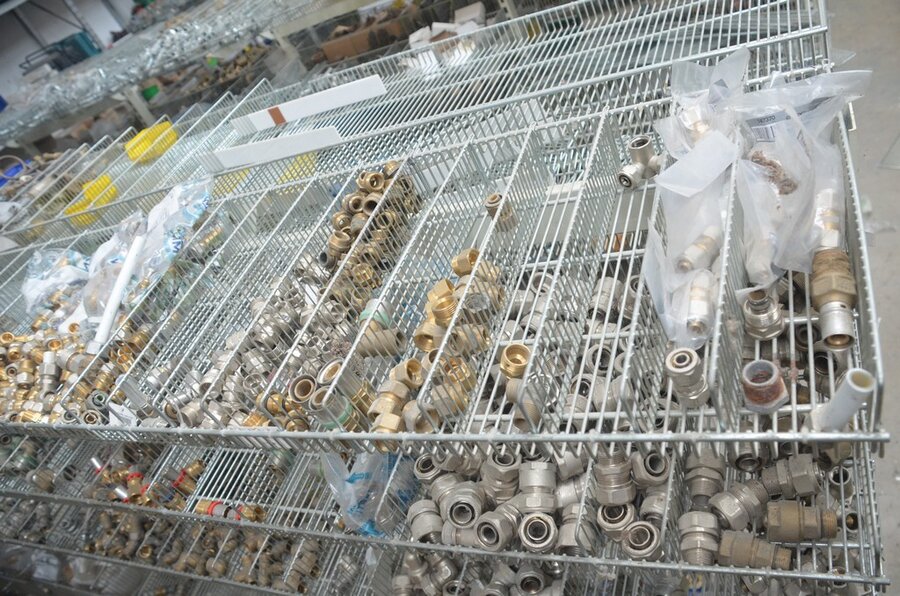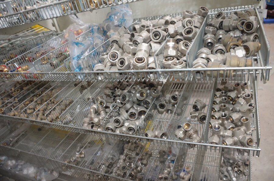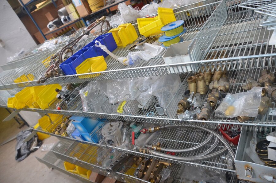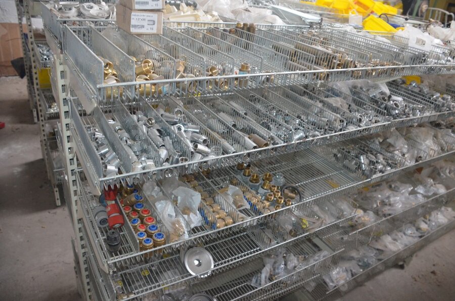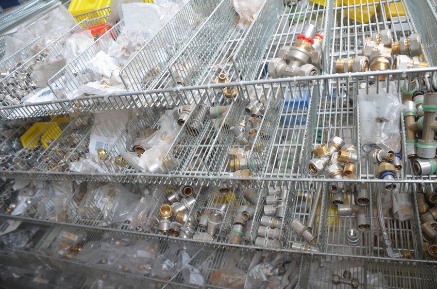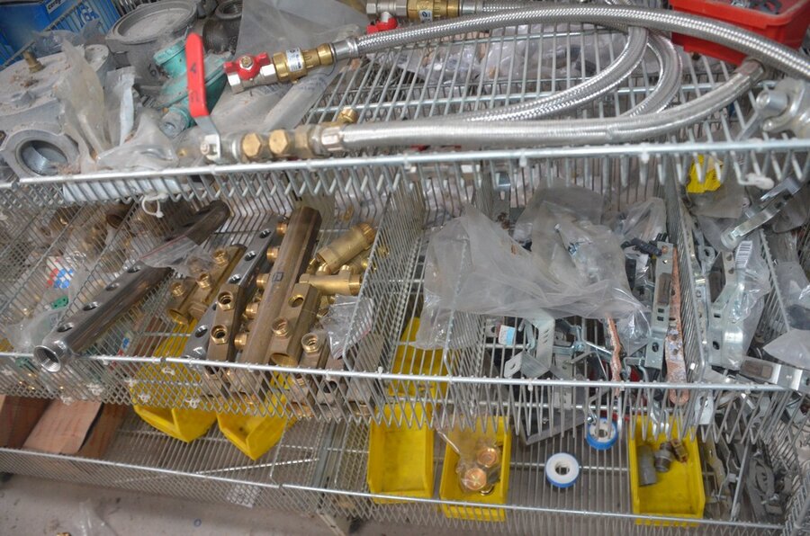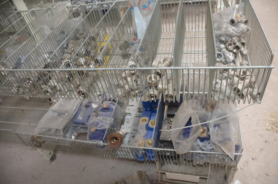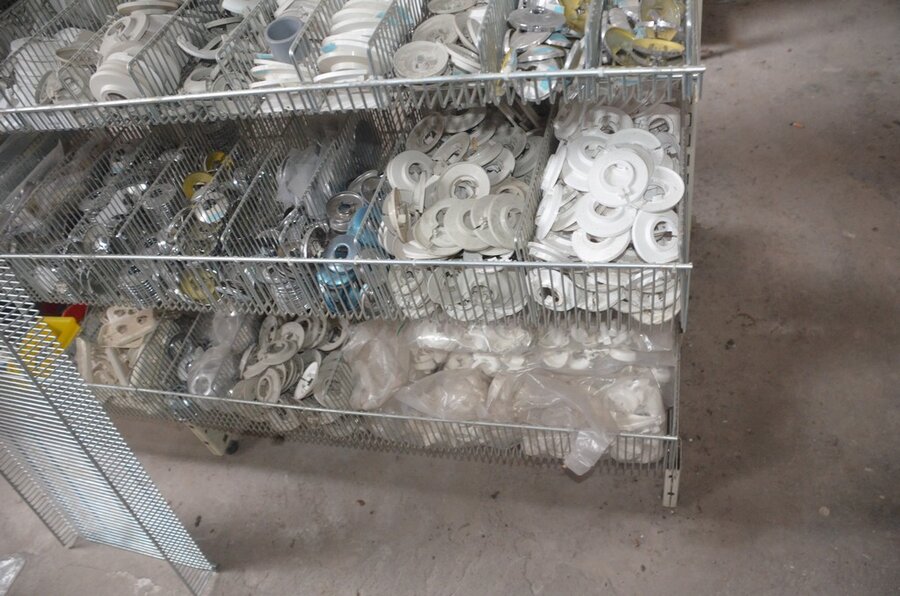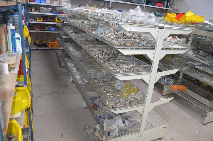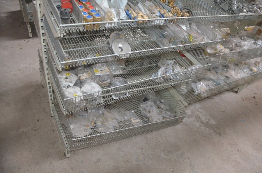 Grijs metalen gondelrek 4m en aflegbakjes met fittingen