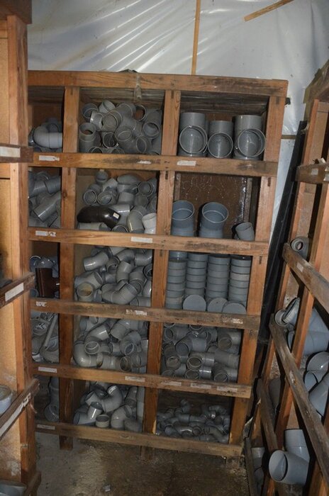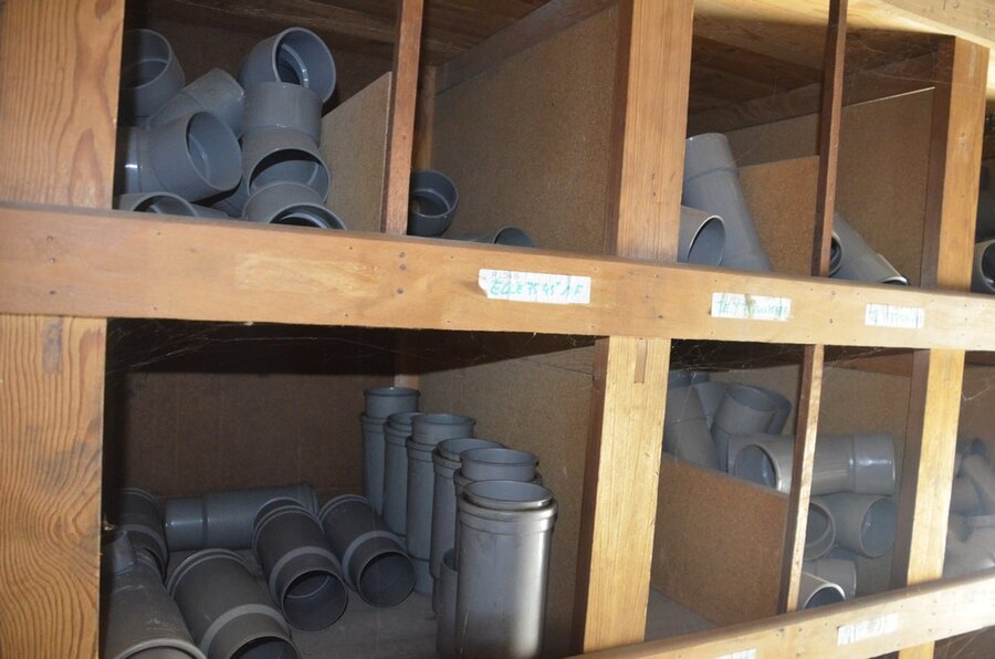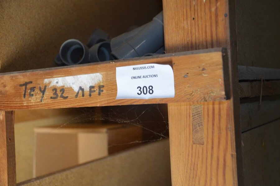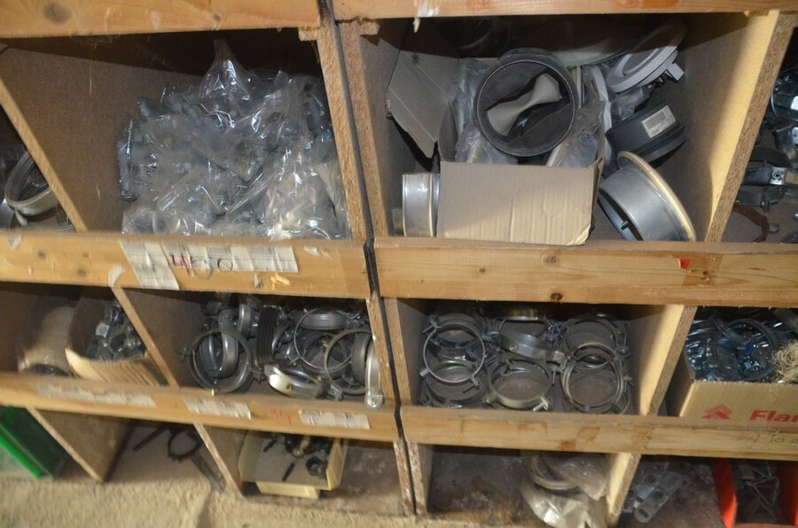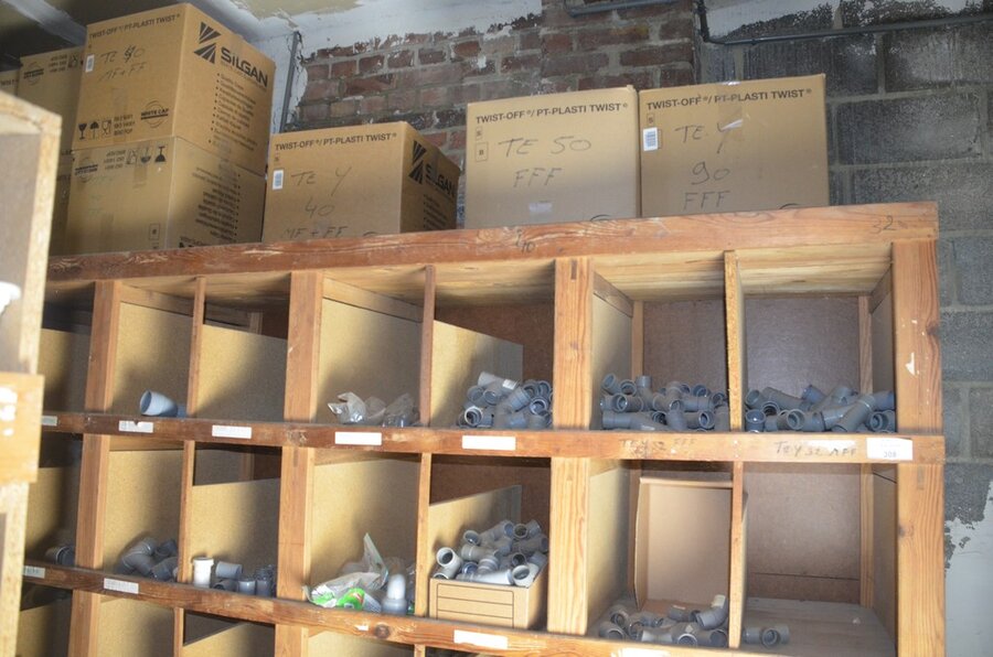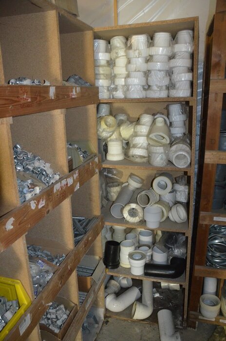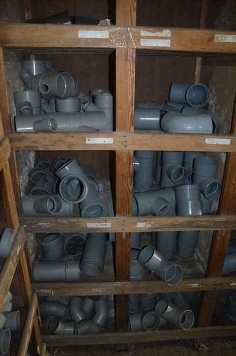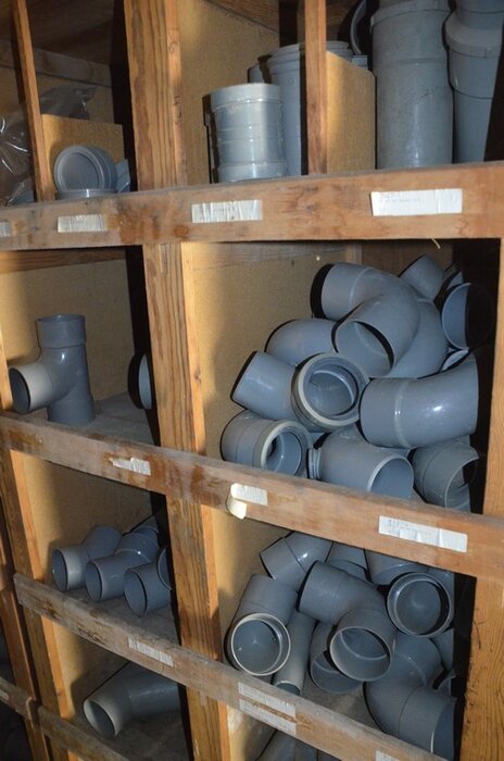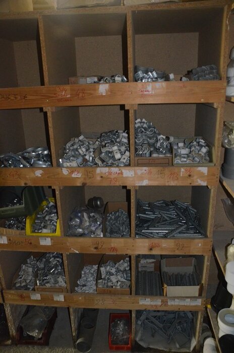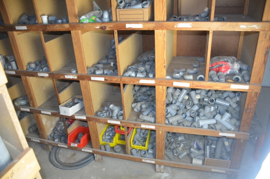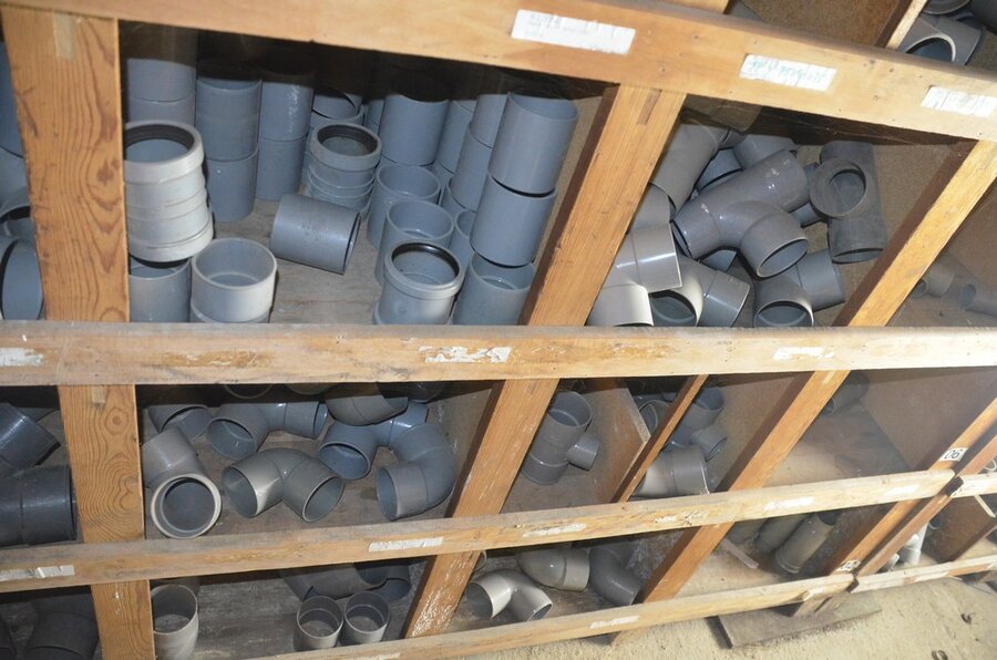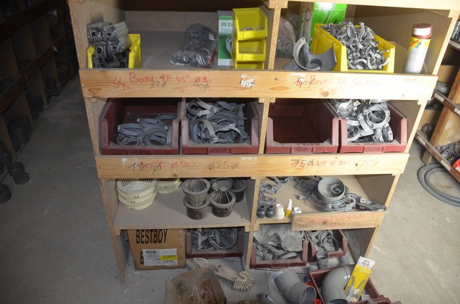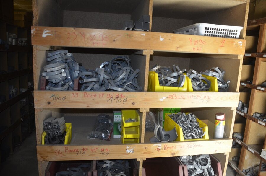 Houtenvakkenrek 22,7m met inhoud w.o. pvc koppelstukken, pvc en metalen beugels