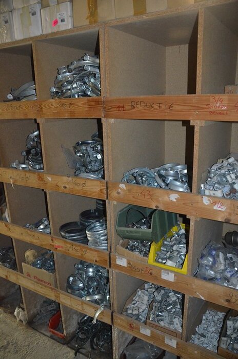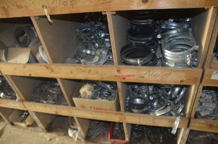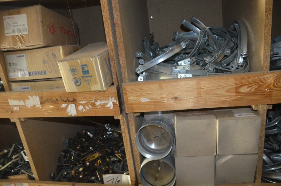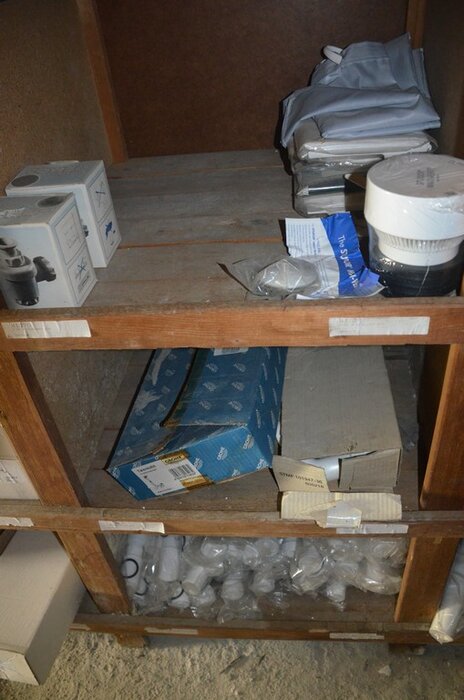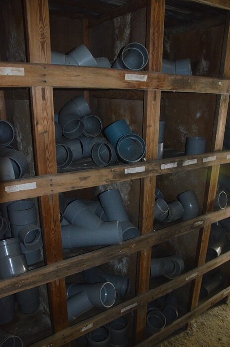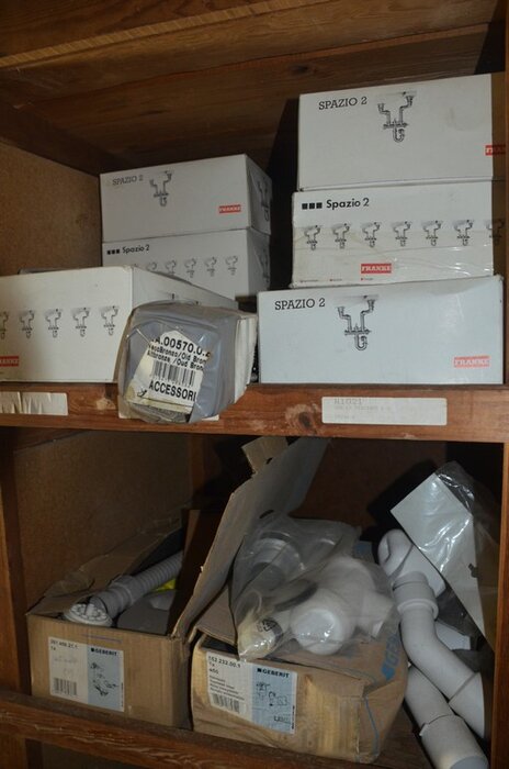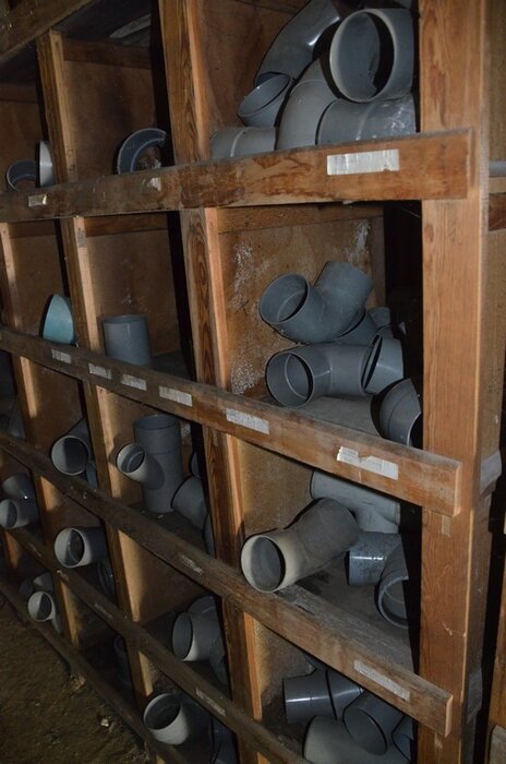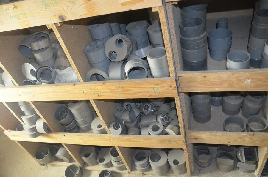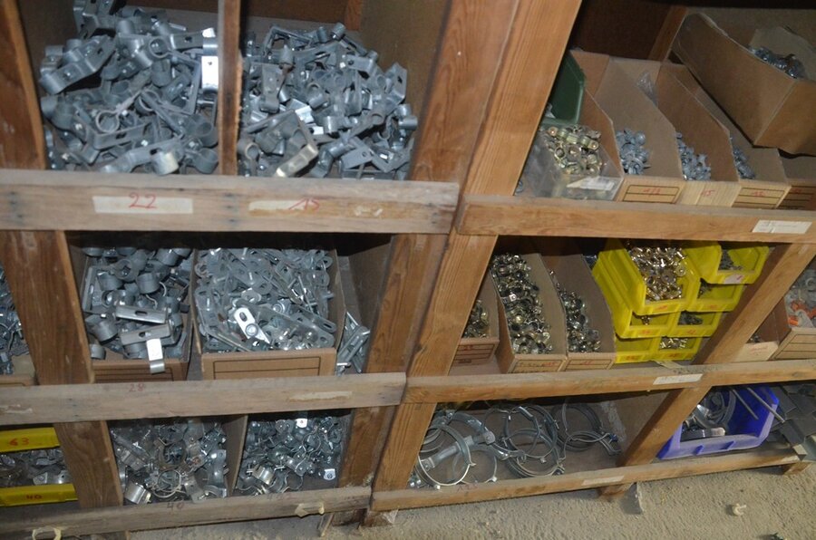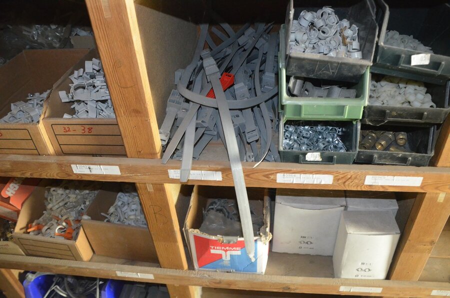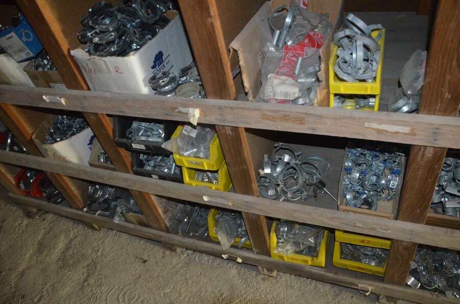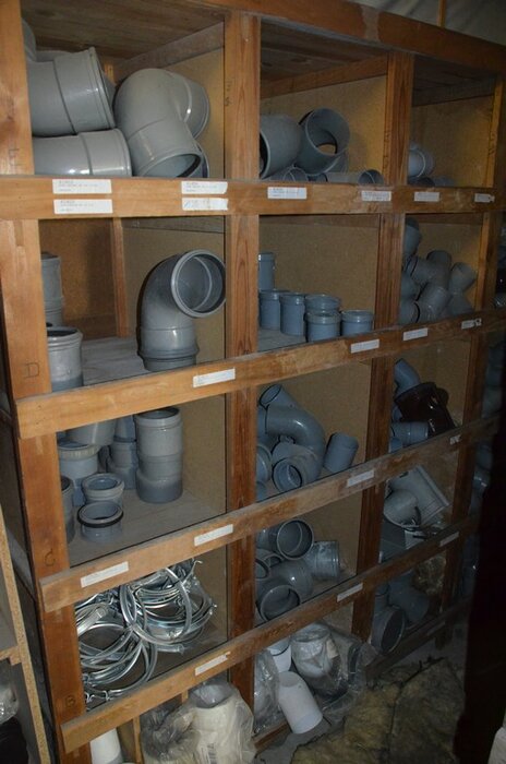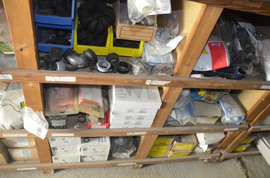 Houtenvakkenrek 22,7m met inhoud w.o. pvc koppelstukken, pvc en metalen beugels