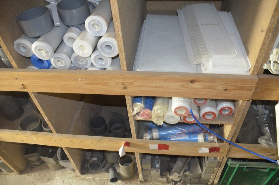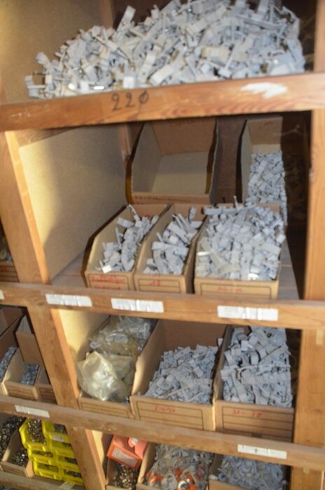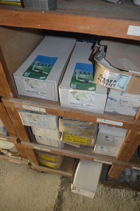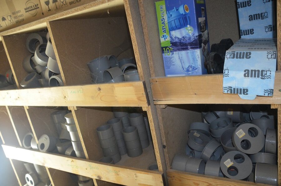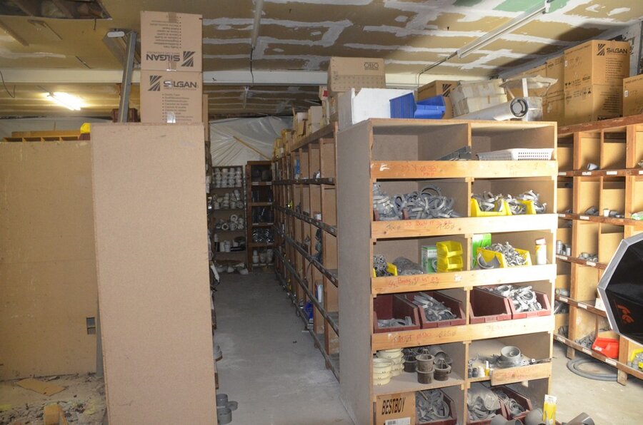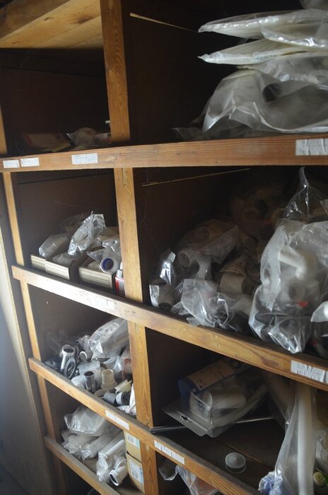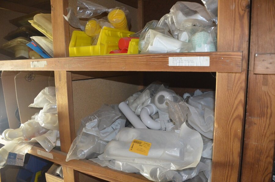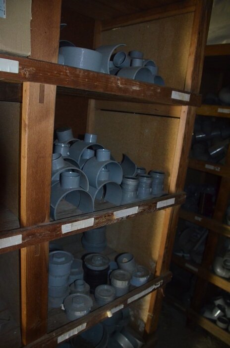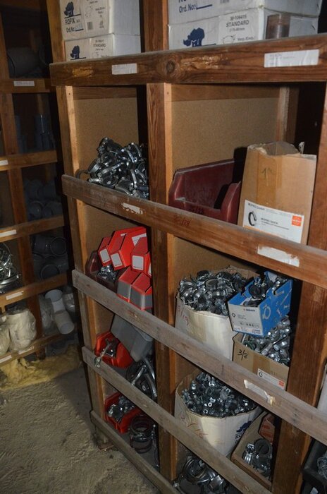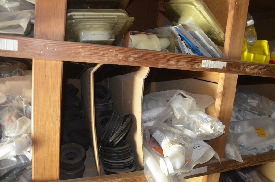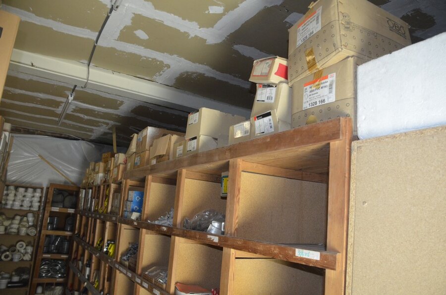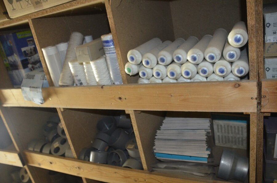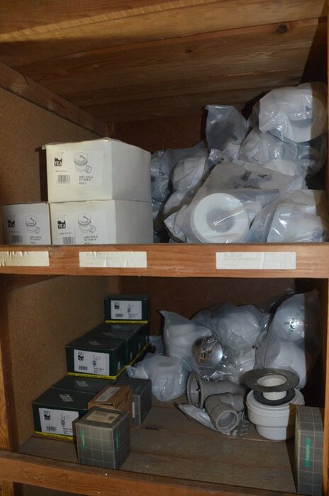 Houtenvakkenrek 22,7m met inhoud w.o. pvc koppelstukken, pvc en metalen beugels
