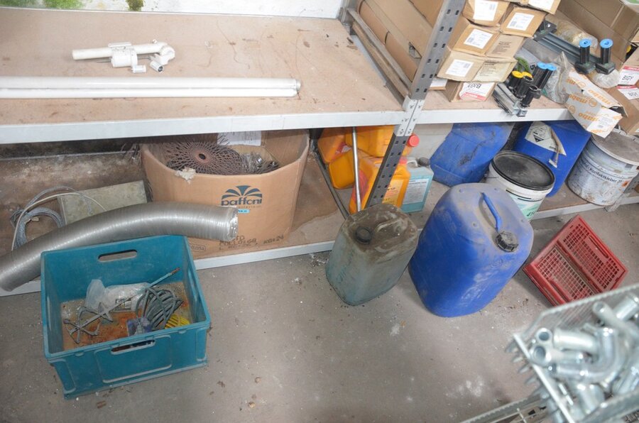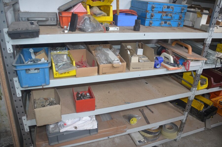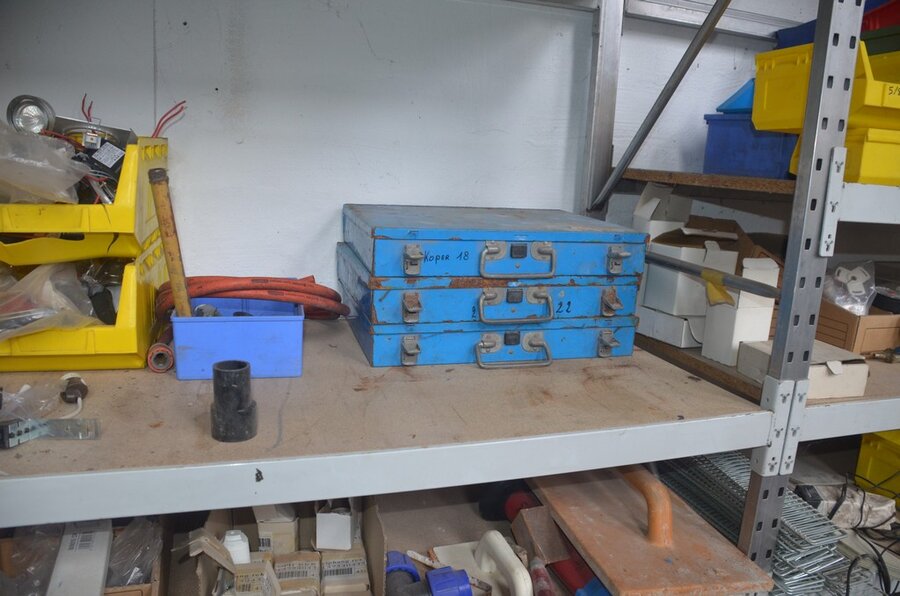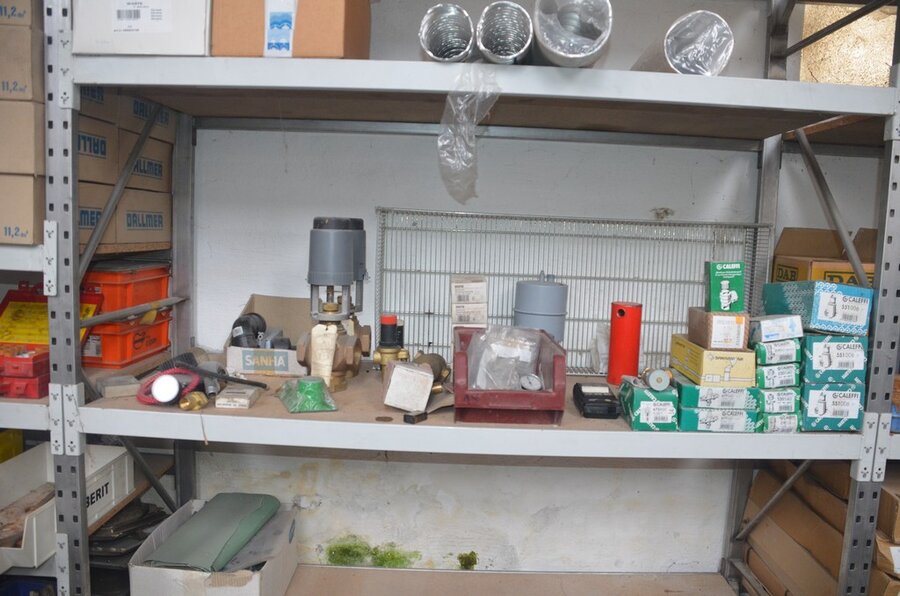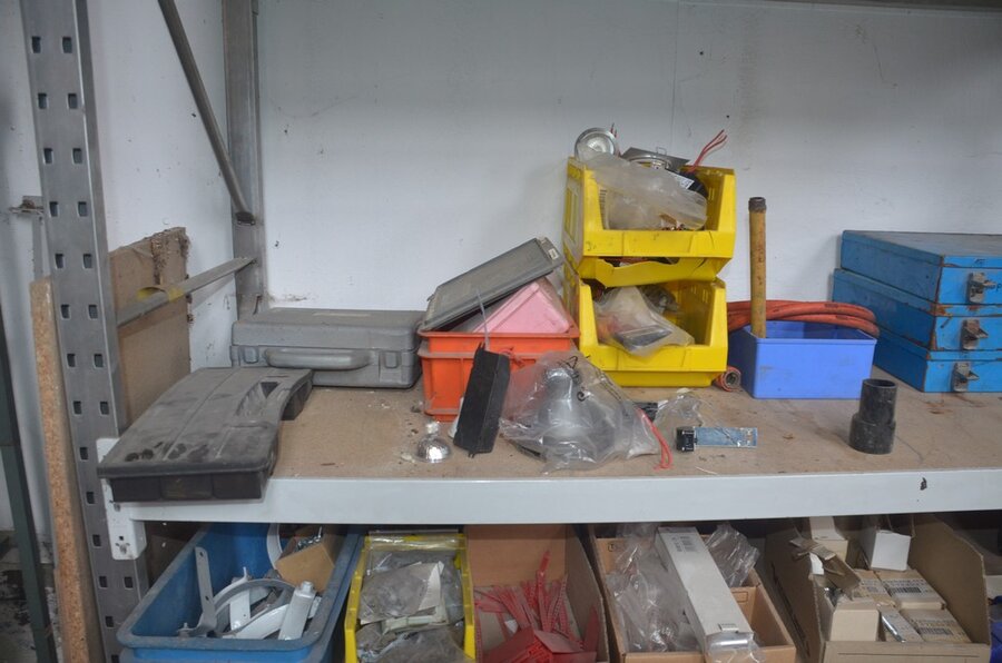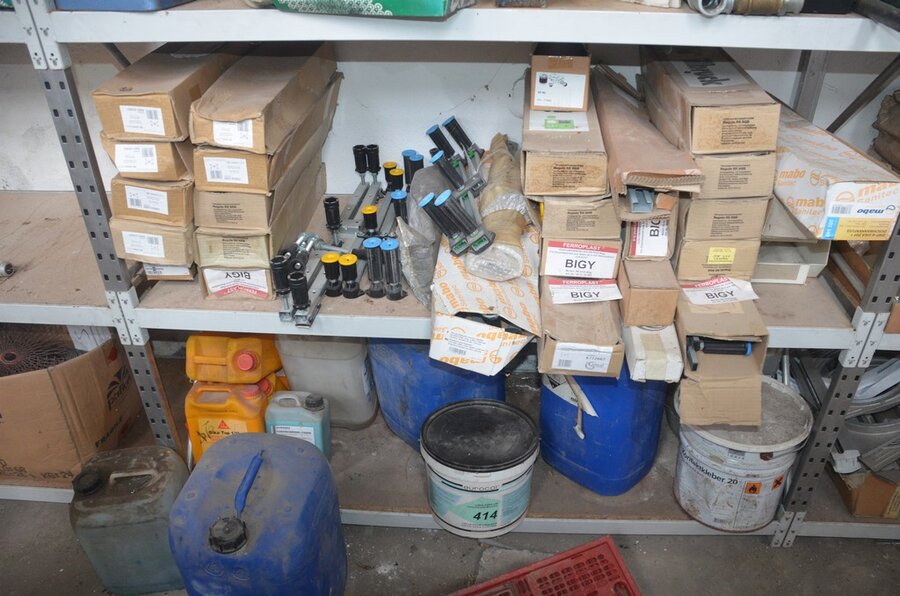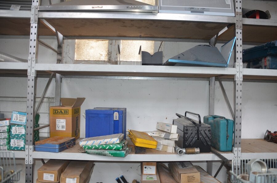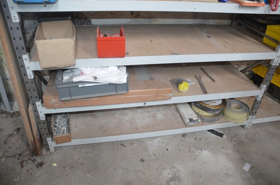Metalen rek bestaande uit 6 kopsteunen 2,90m x 0,60m en 64 balken 1,6m met klein handgerief, 21 afvoerputjes DALLMER, balkonablauf 810E, 5 diverse dampkappen, ca. 30 douchebaksteunen, 18 draadtaponderdelen RIDGID, partij putdeksels