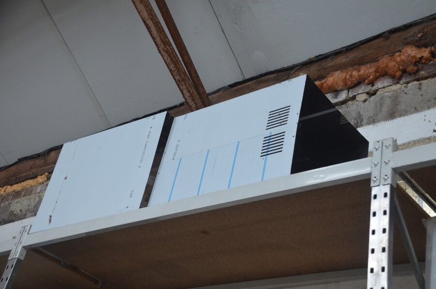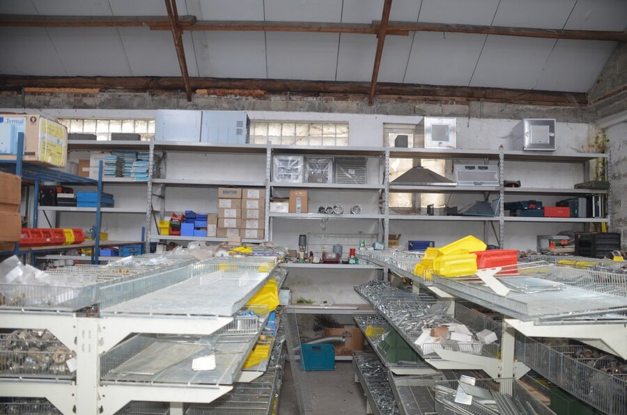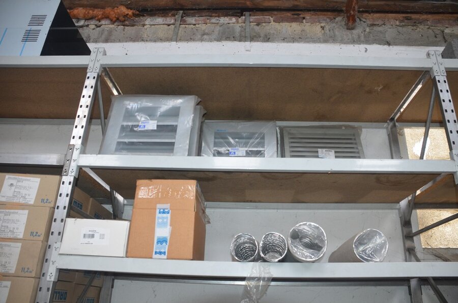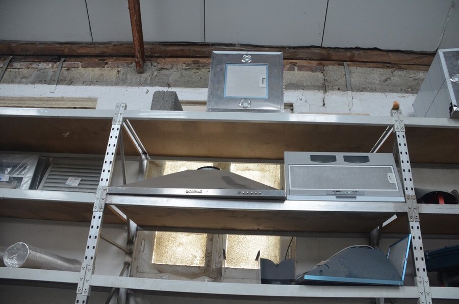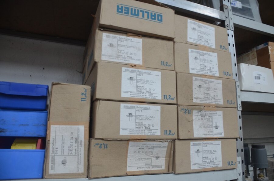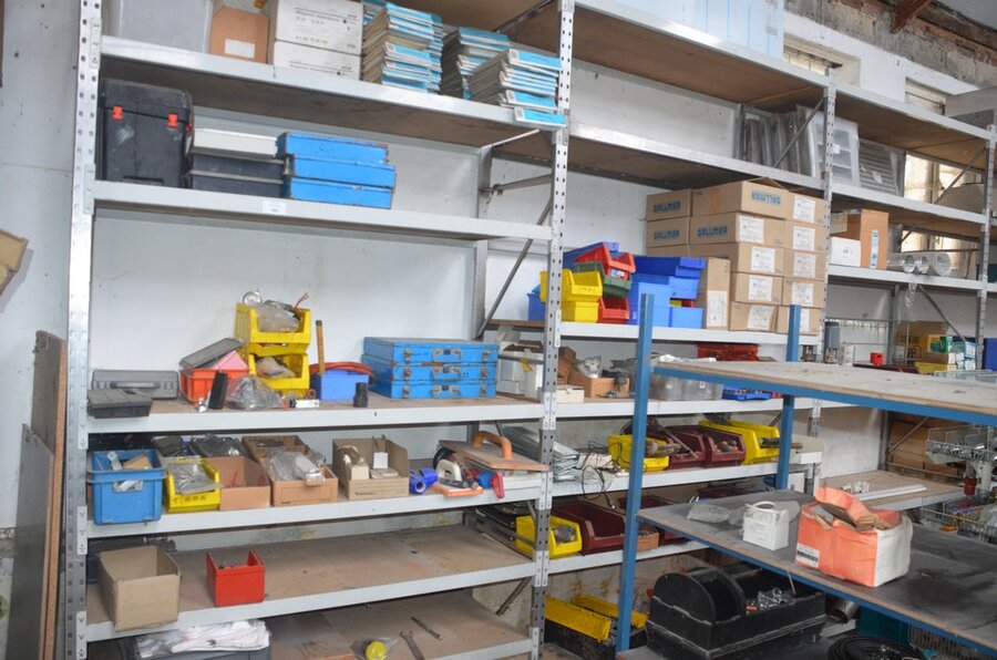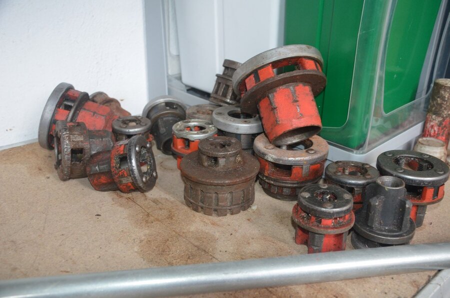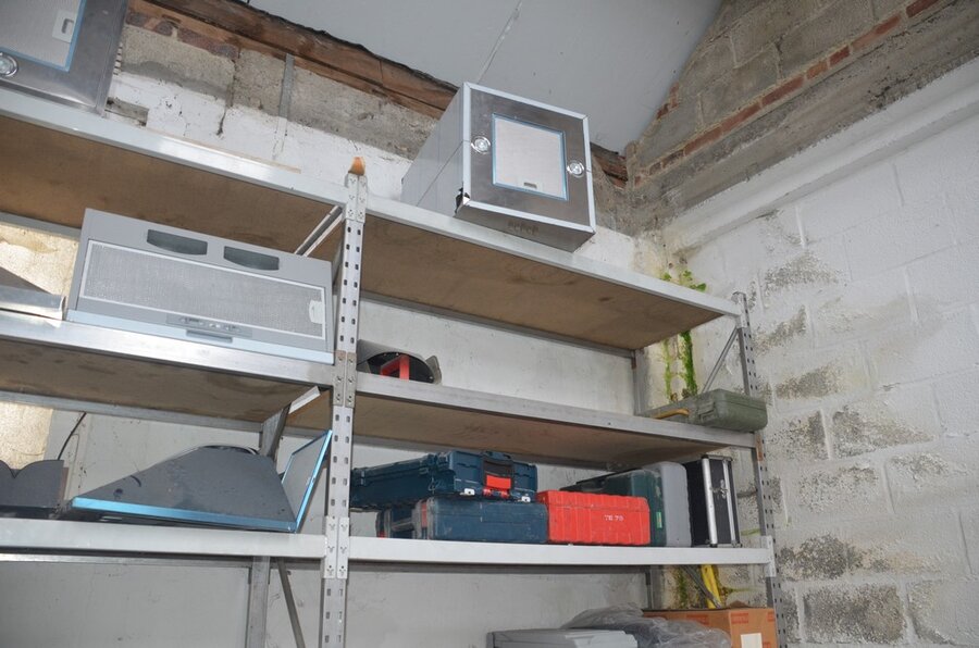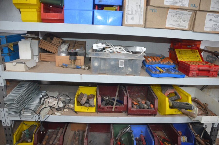 Metalen rek bestaande uit 6 kopsteunen 2,90m x 0,60m en 64 balken 1,6m met klein handgerief, 21 afvoerputjes DALLMER, balkonablauf 810E, 5 diverse dampkappen, ca. 30 douchebaksteunen, 18 draadtaponderdelen RIDGID, partij putdeksels